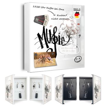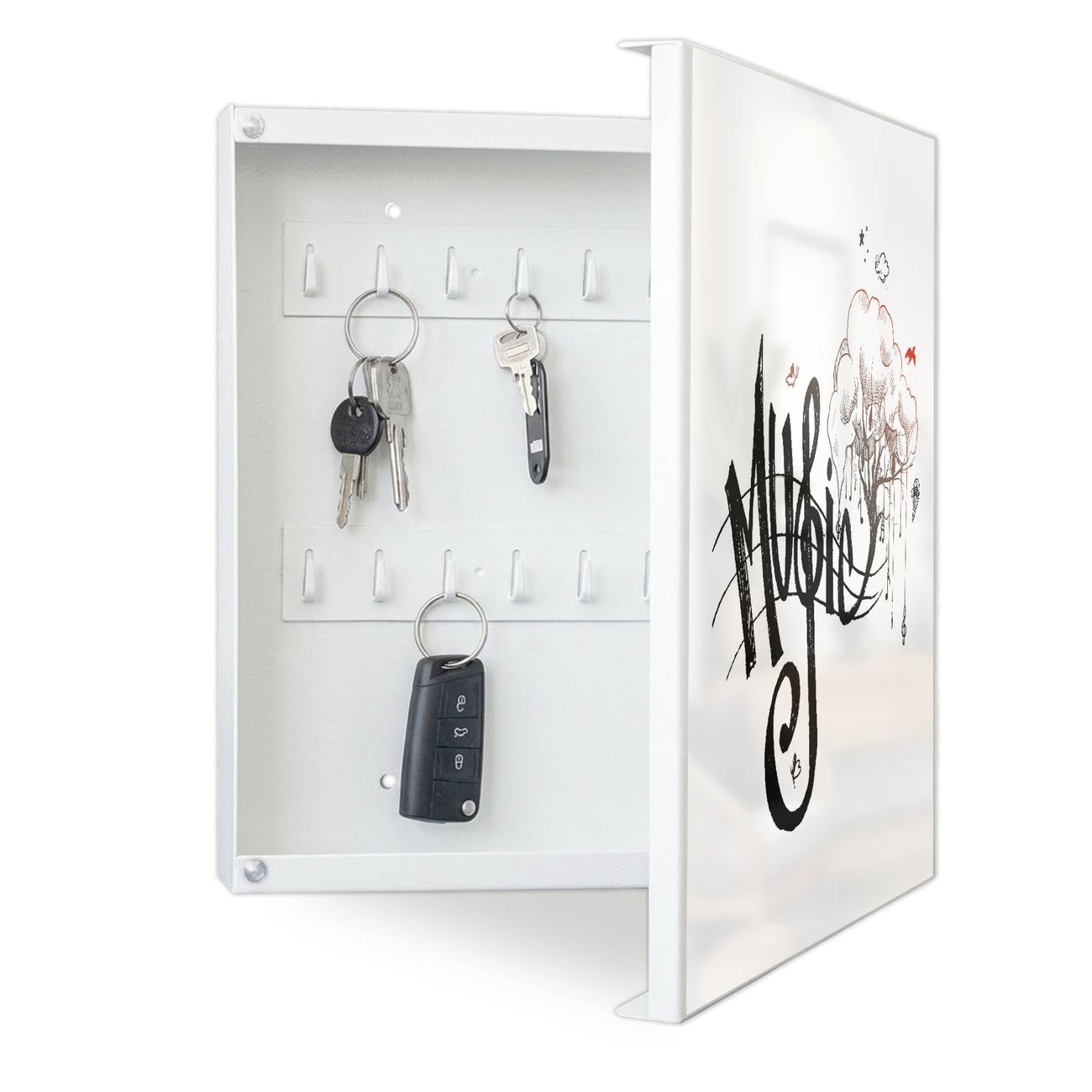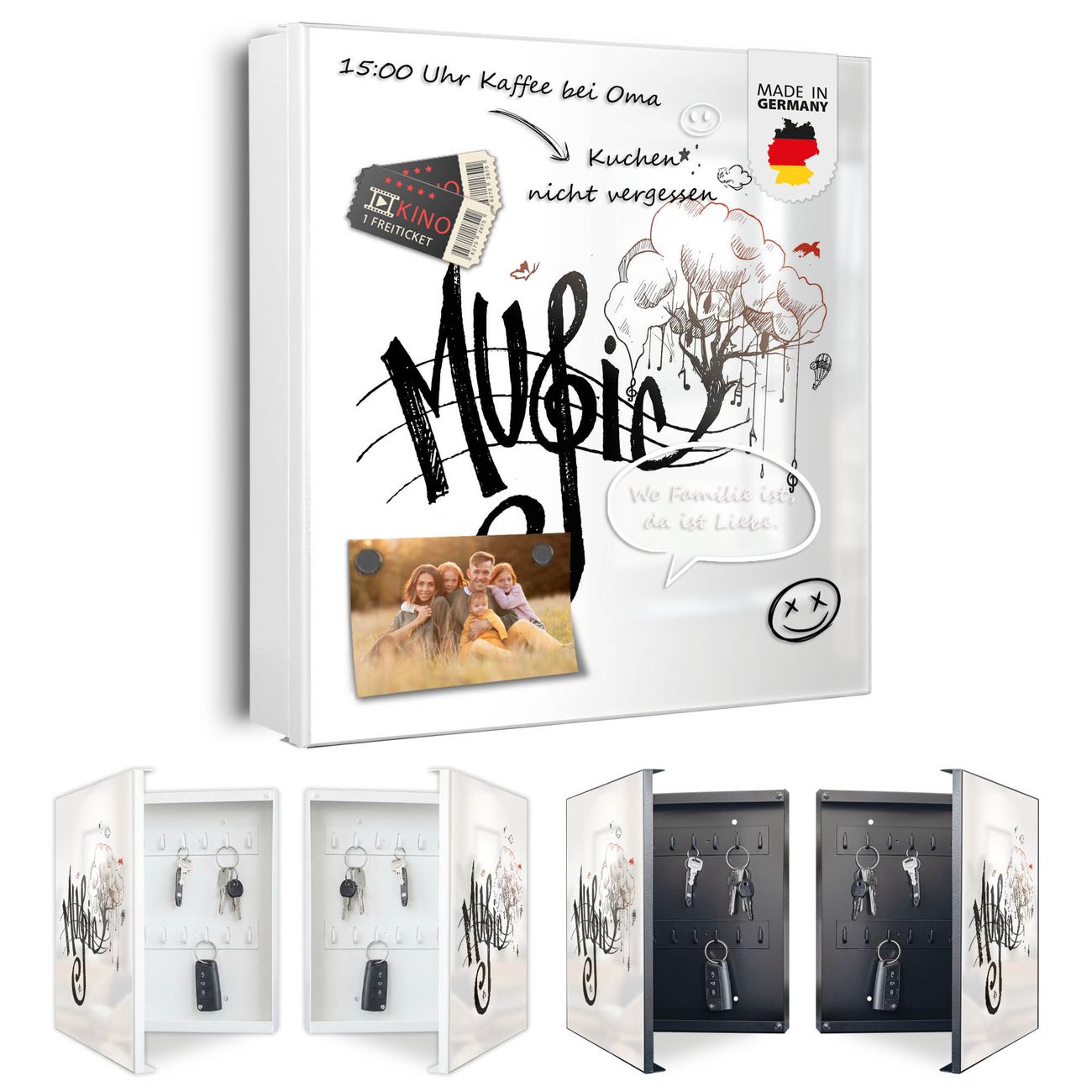 Bringe Ordnung und Eleganz in deinen Eingangsbereich mit dem banjado Schlüsselkasten Motiv Motiv Musikbaum Illustration. Die moderne Schlüsselbox kombiniert funktionales Design mit hochwertiger Verarbeitung und wird so zu einem echten Hingucker in Flur, Büro oder Ferienwohnung. ✅ Stilvolle Schlüsselaufbewahrung mit Motiv Motiv Musikbaum Illustration Der Design-Schlüsselkasten Motiv Motiv Musikbaum Illustration bietet Platz für bis zu 32 Schlüssel, die auf 4 stabilen Reihen mit je 8 Haken übersichtlich verstaut werden. Mit seinen kompakten Maßen von 30 x 30 x 5 cm passt die Schlüsselbox perfekt auch in kleinere Räume. Der weiß lackierte Stahlkorpus mit rechts angeschlagenem Türscharnier harmoniert mit gedruckten Folie auf der Front und fügt sich nahtlos in jedes Wohnambiente ein. Ob als Schlüsselorganizer für Zuhause oder als praktische Lösung für Büros, Praxen und Gewerbe, der banjado Schlüsselkasten sorgt für Ordnung und Übersicht. Dank der magnetischen, mit Kreidestiften beschreibbaren Folie auf der Front kannst du Notizen anheften oder Termine direkt auf der Oberfläche festhalten. Die Schlüsselbox Motiv Motiv Musikbaum Illustration zur Wandmontage wird inklusive Befestigungsmaterial geliefert und ist schnell angebracht. So hast du deine Schlüssel jederzeit griffbereit und zugleich stilvoll verstaut. Mit diesem banjado Schlüsselkasten Motiv Motiv Musikbaum Illustration kombinierst du praktische Aufbewahrung mit stilvollem Wohndesign. Ob privat oder geschäftlich, die Schlüsselbox sorgt für mehr Ordnung, Übersicht und ein wohnliches Ambiente.Vorteile im Überblick