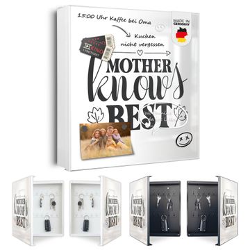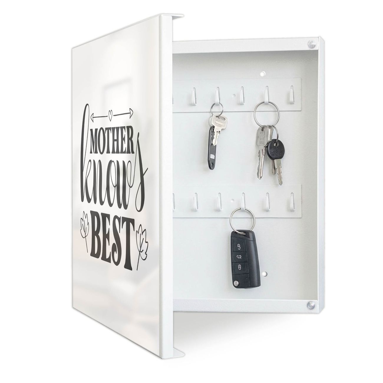 Bringe Ordnung und Eleganz in deinen Eingangsbereich mit dem banjado Schlüsselkasten Motiv Motiv Mutter Weisheit. Die moderne Schlüsselbox kombiniert funktionales Design mit hochwertiger Verarbeitung und wird so zu einem echten Hingucker in Flur, Büro oder Ferienwohnung. ✅ Stilvolle Schlüsselaufbewahrung mit Motiv Motiv Mutter Weisheit Der Design-Schlüsselkasten Motiv Motiv Mutter Weisheit bietet Platz für bis zu 32 Schlüssel, die auf 4 stabilen Reihen mit je 8 Haken übersichtlich verstaut werden. Mit seinen kompakten Maßen von 30 x 30 x 5 cm passt die Schlüsselbox perfekt auch in kleinere Räume. Der weiß lackierte Stahlkorpus mit links angeschlagenem Türscharnier harmoniert mit gedruckten Folie auf der Front und fügt sich nahtlos in jedes Wohnambiente ein. Ob als Schlüsselorganizer für Zuhause oder als praktische Lösung für Büros, Praxen und Gewerbe, der banjado Schlüsselkasten sorgt für Ordnung und Übersicht. Dank der magnetischen, mit Kreidestiften beschreibbaren Folie auf der Front kannst du Notizen anheften oder Termine direkt auf der Oberfläche festhalten. Die Schlüsselbox Motiv Motiv Mutter Weisheit zur Wandmontage wird inklusive Befestigungsmaterial geliefert und ist schnell angebracht. So hast du deine Schlüssel jederzeit griffbereit und zugleich stilvoll verstaut. Mit diesem banjado Schlüsselkasten Motiv Motiv Mutter Weisheit kombinierst du praktische Aufbewahrung mit stilvollem Wohndesign. Ob privat oder geschäftlich, die Schlüsselbox sorgt für mehr Ordnung, Übersicht und ein wohnliches Ambiente.Vorteile im Überblick