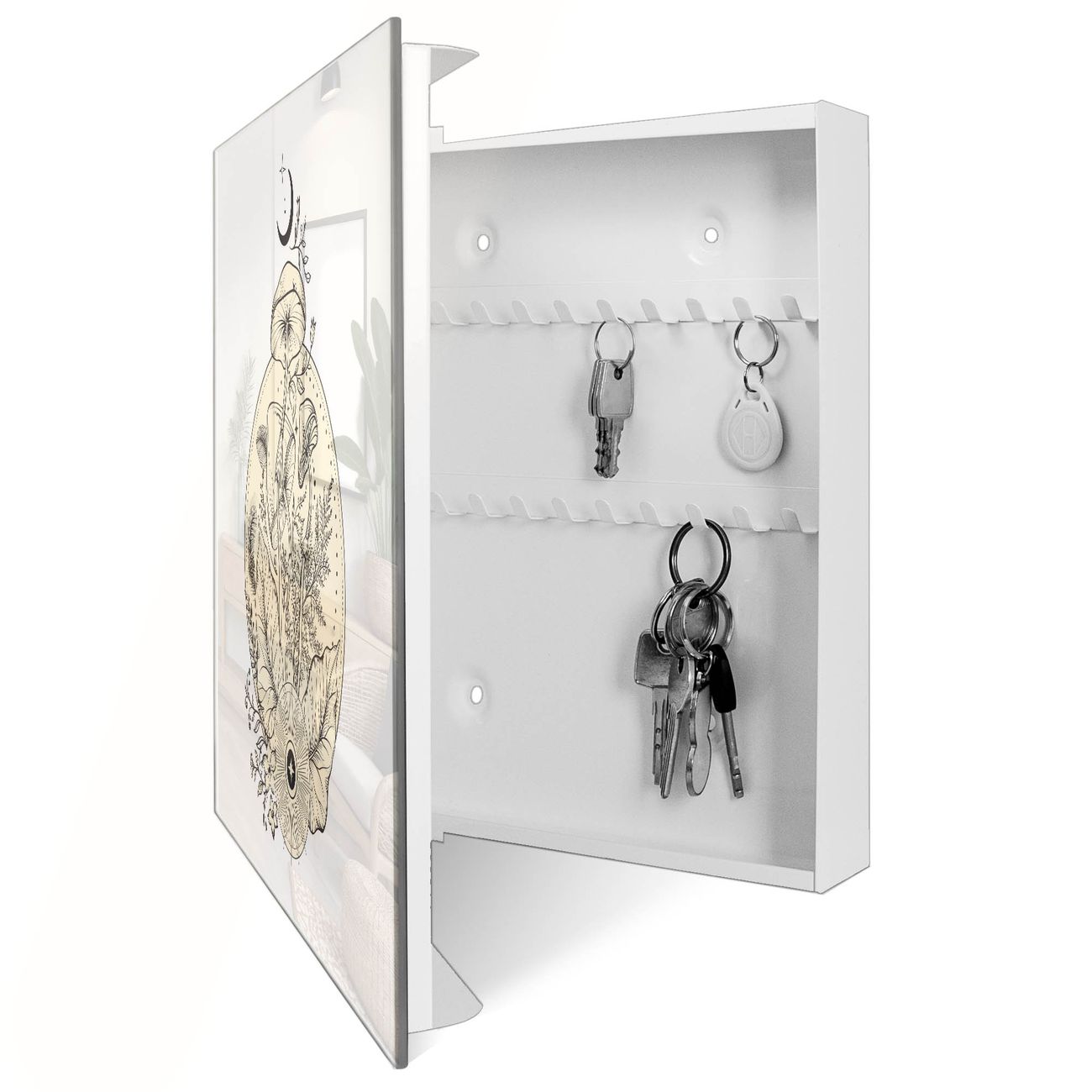 Bringe Ordnung und Eleganz in deinen Eingangsbereich mit dem banjado Schlüsselkasten Motiv Motiv Mystische Natur. Die moderne Schlüsselbox kombiniert funktionales Design mit hochwertiger Verarbeitung und wird so zu einem echten Hingucker in Flur, Büro oder Ferienwohnung. ✅ Stilvolle Schlüsselaufbewahrung mit Glasfront im Motiv Motiv Mystische Natur Der Design-Schlüsselkasten Motiv Motiv Mystische Natur bietet Platz für bis zu 50 Schlüssel, die auf 5 stabilen Reihen mit je 10 Haken übersichtlich verstaut werden. Mit seinen kompakten Maßen von 30 x 30 x 5 cm passt die Schlüsselbox perfekt auch in kleinere Räume. Der weiß lackierte Stahlkorpus mit rechts angeschlagenem Türscharnier harmoniert mit der Glasfront und fügt sich nahtlos in jedes Wohnambiente ein. Ob als Schlüsselorganizer für Zuhause oder als praktische Lösung für Büros, Praxen und Gewerbe, der banjado Schlüsselkasten sorgt für Ordnung und Übersicht. Dank der magnetischen, mit Kreidestiften beschreibbaren Glasfront kannst du Notizen anheften oder Termine direkt auf der Oberfläche festhalten. Die Schlüsselbox Motiv Motiv Mystische Natur zur Wandmontage wird inklusive Befestigungsmaterial geliefert und ist schnell angebracht. So hast du deine Schlüssel jederzeit griffbereit und zugleich stilvoll verstaut. Mit diesem banjado Schlüsselkasten Motiv Motiv Mystische Natur kombinierst du praktische Aufbewahrung mit stilvollem Wohndesign. Ob privat oder geschäftlich, die Schlüsselbox sorgt für mehr Ordnung, Übersicht und ein wohnliches Ambiente.Vorteile im Überblick