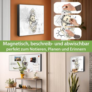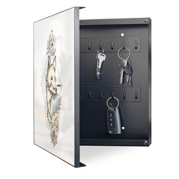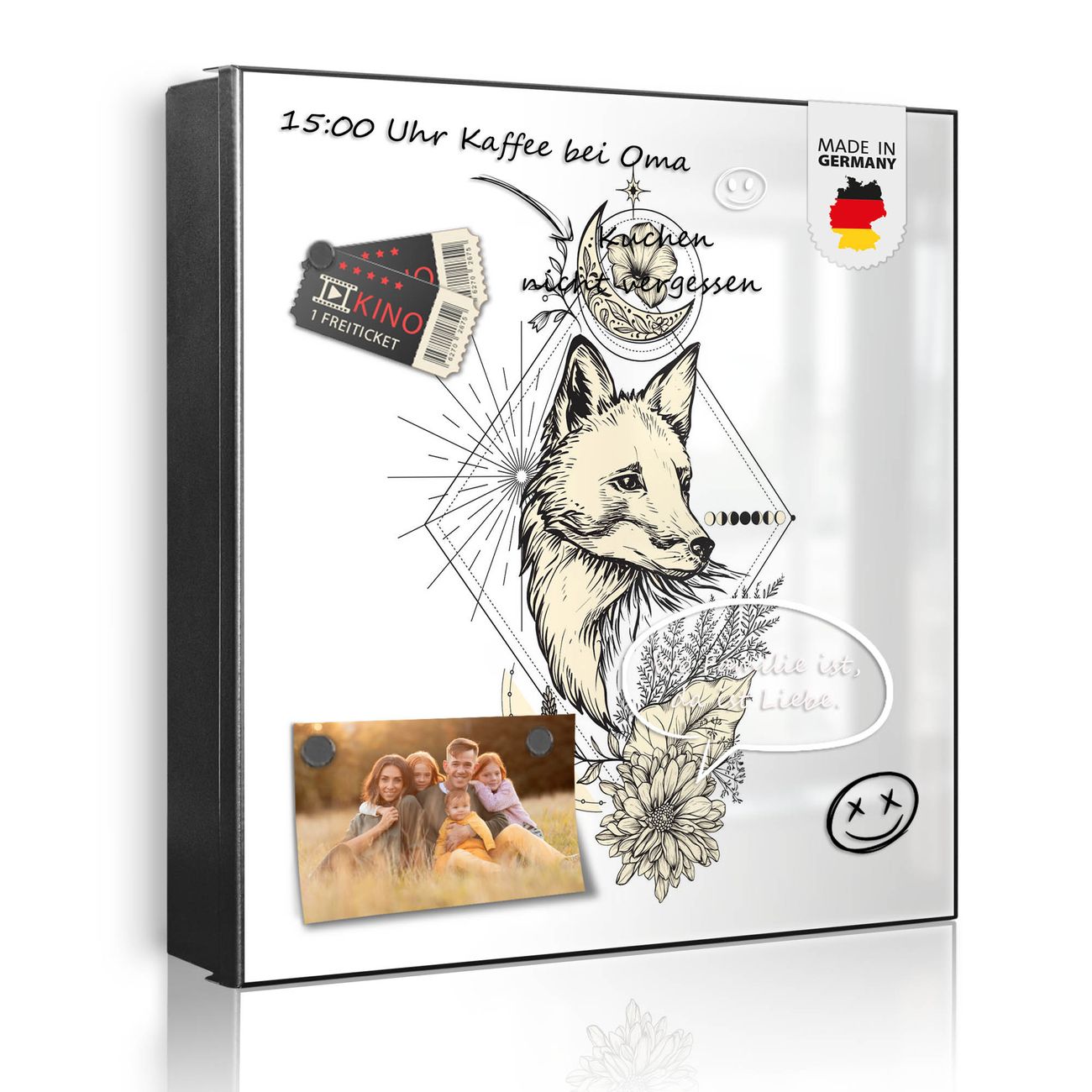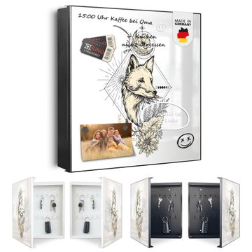 Bringe Ordnung und Eleganz in deinen Eingangsbereich mit dem banjado Schlüsselkasten Motiv Motiv Mystischer Fuchs. Die moderne Schlüsselbox kombiniert funktionales Design mit hochwertiger Verarbeitung und wird so zu einem echten Hingucker in Flur, Büro oder Ferienwohnung. ✅ Stilvolle Schlüsselaufbewahrung mit Motiv Motiv Mystischer Fuchs Der Design-Schlüsselkasten Motiv Motiv Mystischer Fuchs bietet Platz für bis zu 32 Schlüssel, die auf 4 stabilen Reihen mit je 8 Haken übersichtlich verstaut werden. Mit seinen kompakten Maßen von 30 x 30 x 5 cm passt die Schlüsselbox perfekt auch in kleinere Räume. Der schwarz lackierte Stahlkorpus mit links angeschlagenem Türscharnier harmoniert mit gedruckten Folie auf der Front und fügt sich nahtlos in jedes Wohnambiente ein. Ob als Schlüsselorganizer für Zuhause oder als praktische Lösung für Büros, Praxen und Gewerbe, der banjado Schlüsselkasten sorgt für Ordnung und Übersicht. Dank der magnetischen, mit Kreidestiften beschreibbaren Folie auf der Front kannst du Notizen anheften oder Termine direkt auf der Oberfläche festhalten. Die Schlüsselbox Motiv Motiv Mystischer Fuchs zur Wandmontage wird inklusive Befestigungsmaterial geliefert und ist schnell angebracht. So hast du deine Schlüssel jederzeit griffbereit und zugleich stilvoll verstaut. Mit diesem banjado Schlüsselkasten Motiv Motiv Mystischer Fuchs kombinierst du praktische Aufbewahrung mit stilvollem Wohndesign. Ob privat oder geschäftlich, die Schlüsselbox sorgt für mehr Ordnung, Übersicht und ein wohnliches Ambiente.Vorteile im Überblick