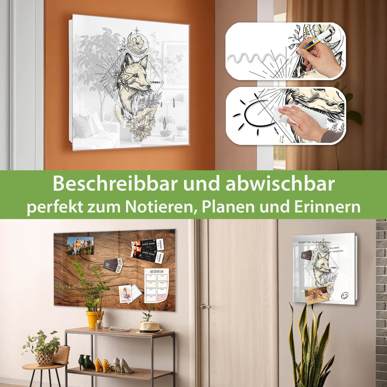 Bringe Ordnung und Eleganz in deinen Eingangsbereich mit dem banjado Schlüsselkasten Motiv Motiv Mystischer Fuchs. Die moderne Schlüsselbox kombiniert funktionales Design mit hochwertiger Verarbeitung und wird so zu einem echten Hingucker in Flur, Büro oder Ferienwohnung. ✅ Stilvolle Schlüsselaufbewahrung mit Glasfront im Motiv Motiv Mystischer Fuchs Der Design-Schlüsselkasten Motiv Motiv Mystischer Fuchs bietet Platz für bis zu 50 Schlüssel, die auf 5 stabilen Reihen mit je 10 Haken übersichtlich verstaut werden. Mit seinen kompakten Maßen von 30 x 30 x 5 cm passt die Schlüsselbox perfekt auch in kleinere Räume. Der weiß lackierte Stahlkorpus mit rechts angeschlagenem Türscharnier harmoniert mit der Glasfront und fügt sich nahtlos in jedes Wohnambiente ein. Ob als Schlüsselorganizer für Zuhause oder als praktische Lösung für Büros, Praxen und Gewerbe, der banjado Schlüsselkasten sorgt für Ordnung und Übersicht. Dank der magnetischen, mit Kreidestiften beschreibbaren Glasfront kannst du Notizen anheften oder Termine direkt auf der Oberfläche festhalten. Die Schlüsselbox Motiv Motiv Mystischer Fuchs zur Wandmontage wird inklusive Befestigungsmaterial geliefert und ist schnell angebracht. So hast du deine Schlüssel jederzeit griffbereit und zugleich stilvoll verstaut. Mit diesem banjado Schlüsselkasten Motiv Motiv Mystischer Fuchs kombinierst du praktische Aufbewahrung mit stilvollem Wohndesign. Ob privat oder geschäftlich, die Schlüsselbox sorgt für mehr Ordnung, Übersicht und ein wohnliches Ambiente.Vorteile im Überblick