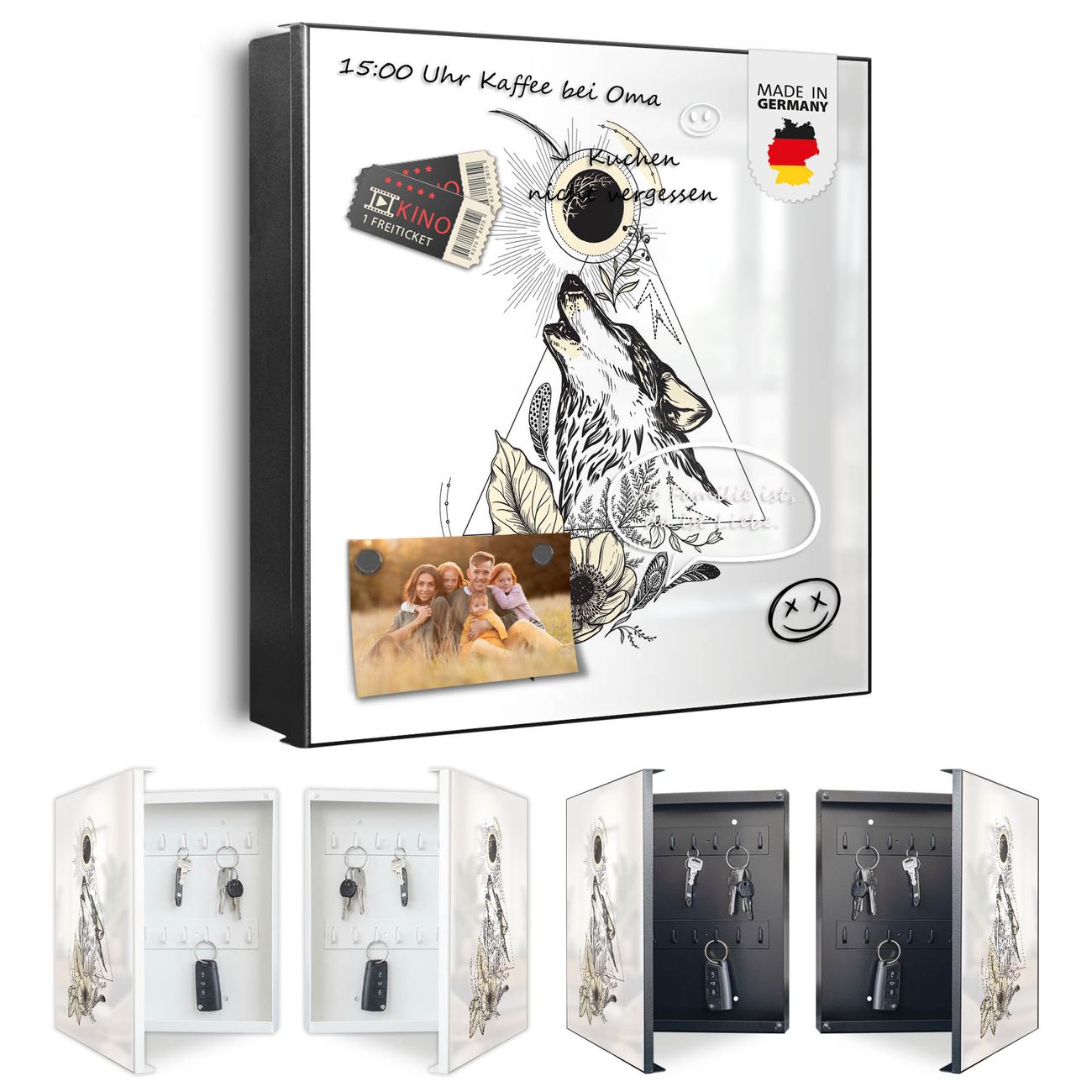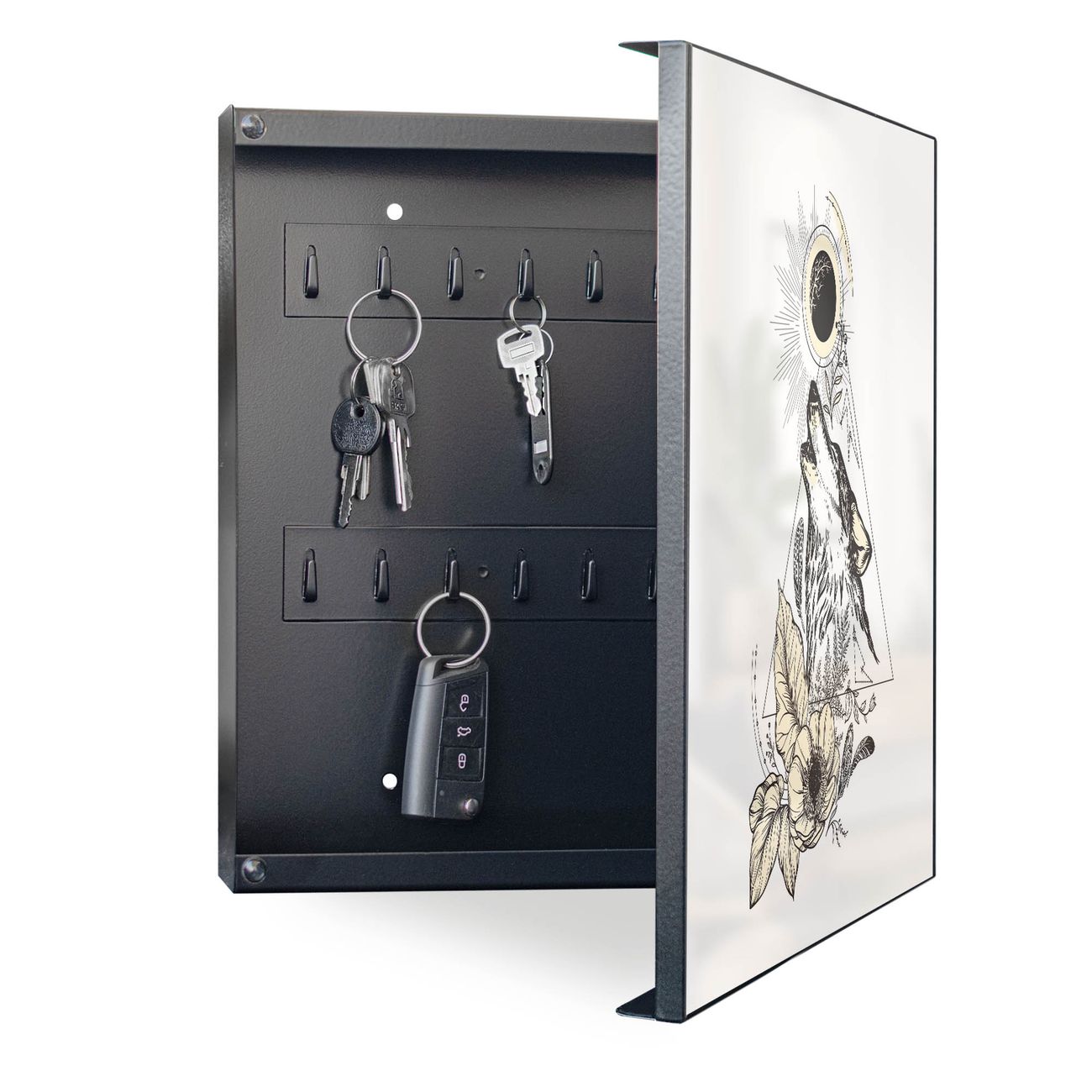 Bringe Ordnung und Eleganz in deinen Eingangsbereich mit dem banjado Schlüsselkasten Motiv Motiv Mystischer Wolf. Die moderne Schlüsselbox kombiniert funktionales Design mit hochwertiger Verarbeitung und wird so zu einem echten Hingucker in Flur, Büro oder Ferienwohnung. ✅ Stilvolle Schlüsselaufbewahrung mit Motiv Motiv Mystischer Wolf Der Design-Schlüsselkasten Motiv Motiv Mystischer Wolf bietet Platz für bis zu 32 Schlüssel, die auf 4 stabilen Reihen mit je 8 Haken übersichtlich verstaut werden. Mit seinen kompakten Maßen von 30 x 30 x 5 cm passt die Schlüsselbox perfekt auch in kleinere Räume. Der schwarz lackierte Stahlkorpus mit rechts angeschlagenem Türscharnier harmoniert mit gedruckten Folie auf der Front und fügt sich nahtlos in jedes Wohnambiente ein. Ob als Schlüsselorganizer für Zuhause oder als praktische Lösung für Büros, Praxen und Gewerbe, der banjado Schlüsselkasten sorgt für Ordnung und Übersicht. Dank der magnetischen, mit Kreidestiften beschreibbaren Folie auf der Front kannst du Notizen anheften oder Termine direkt auf der Oberfläche festhalten. Die Schlüsselbox Motiv Motiv Mystischer Wolf zur Wandmontage wird inklusive Befestigungsmaterial geliefert und ist schnell angebracht. So hast du deine Schlüssel jederzeit griffbereit und zugleich stilvoll verstaut. Mit diesem banjado Schlüsselkasten Motiv Motiv Mystischer Wolf kombinierst du praktische Aufbewahrung mit stilvollem Wohndesign. Ob privat oder geschäftlich, die Schlüsselbox sorgt für mehr Ordnung, Übersicht und ein wohnliches Ambiente.Vorteile im Überblick