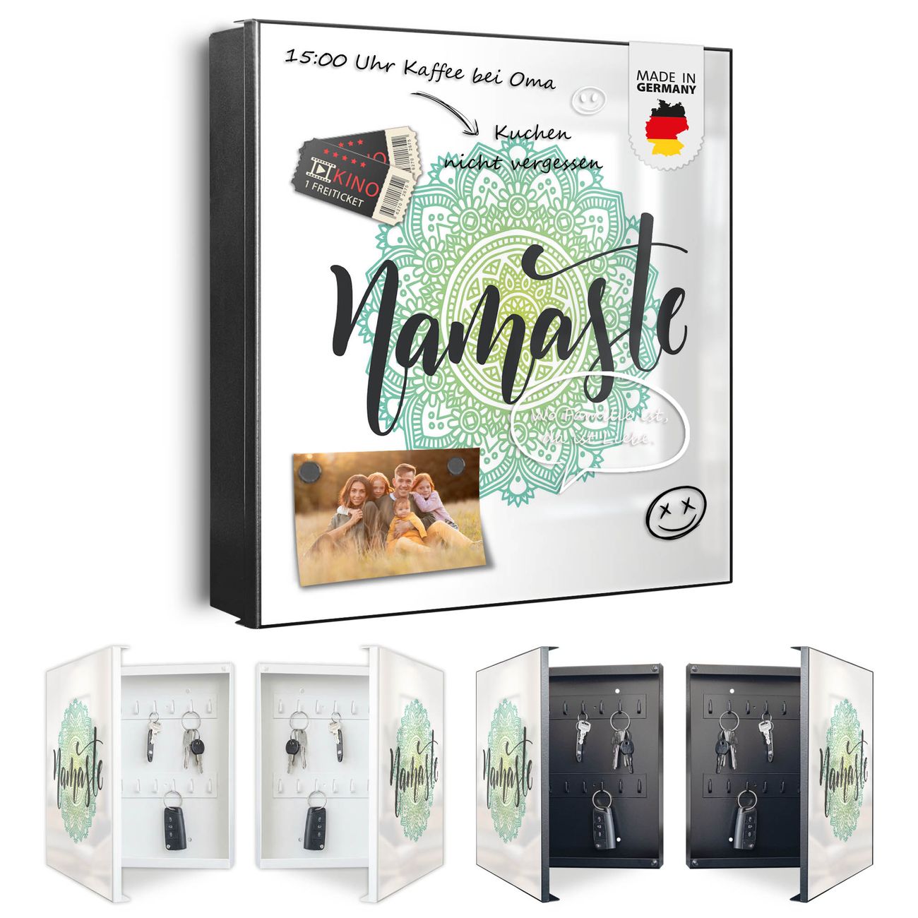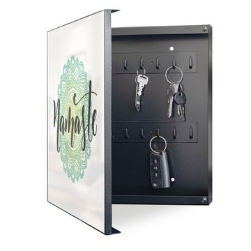 Bringe Ordnung und Eleganz in deinen Eingangsbereich mit dem banjado Schlüsselkasten Motiv Motiv Namaste Mandala. Die moderne Schlüsselbox kombiniert funktionales Design mit hochwertiger Verarbeitung und wird so zu einem echten Hingucker in Flur, Büro oder Ferienwohnung. ✅ Stilvolle Schlüsselaufbewahrung mit Motiv Motiv Namaste Mandala Der Design-Schlüsselkasten Motiv Motiv Namaste Mandala bietet Platz für bis zu 32 Schlüssel, die auf 4 stabilen Reihen mit je 8 Haken übersichtlich verstaut werden. Mit seinen kompakten Maßen von 30 x 30 x 5 cm passt die Schlüsselbox perfekt auch in kleinere Räume. Der schwarz lackierte Stahlkorpus mit links angeschlagenem Türscharnier harmoniert mit gedruckten Folie auf der Front und fügt sich nahtlos in jedes Wohnambiente ein. Ob als Schlüsselorganizer für Zuhause oder als praktische Lösung für Büros, Praxen und Gewerbe, der banjado Schlüsselkasten sorgt für Ordnung und Übersicht. Dank der magnetischen, mit Kreidestiften beschreibbaren Folie auf der Front kannst du Notizen anheften oder Termine direkt auf der Oberfläche festhalten. Die Schlüsselbox Motiv Motiv Namaste Mandala zur Wandmontage wird inklusive Befestigungsmaterial geliefert und ist schnell angebracht. So hast du deine Schlüssel jederzeit griffbereit und zugleich stilvoll verstaut. Mit diesem banjado Schlüsselkasten Motiv Motiv Namaste Mandala kombinierst du praktische Aufbewahrung mit stilvollem Wohndesign. Ob privat oder geschäftlich, die Schlüsselbox sorgt für mehr Ordnung, Übersicht und ein wohnliches Ambiente.Vorteile im Überblick