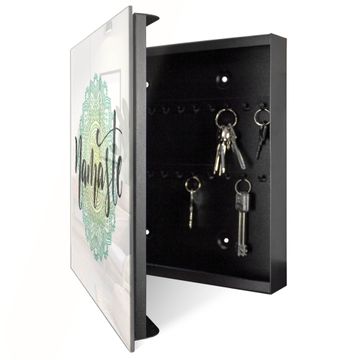 Bringe Ordnung und Eleganz in deinen Eingangsbereich mit dem banjado Schlüsselkasten Motiv Motiv Namaste Mandala. Die moderne Schlüsselbox kombiniert funktionales Design mit hochwertiger Verarbeitung und wird so zu einem echten Hingucker in Flur, Büro oder Ferienwohnung. ✅ Stilvolle Schlüsselaufbewahrung mit Glasfront im Motiv Motiv Namaste Mandala Der Design-Schlüsselkasten Motiv Motiv Namaste Mandala bietet Platz für bis zu 50 Schlüssel, die auf 5 stabilen Reihen mit je 10 Haken übersichtlich verstaut werden. Mit seinen kompakten Maßen von 30 x 30 x 5 cm passt die Schlüsselbox perfekt auch in kleinere Räume. Der schwarz lackierte Stahlkorpus mit rechts angeschlagenem Türscharnier harmoniert mit der Glasfront und fügt sich nahtlos in jedes Wohnambiente ein. Ob als Schlüsselorganizer für Zuhause oder als praktische Lösung für Büros, Praxen und Gewerbe, der banjado Schlüsselkasten sorgt für Ordnung und Übersicht. Dank der magnetischen, mit Kreidestiften beschreibbaren Glasfront kannst du Notizen anheften oder Termine direkt auf der Oberfläche festhalten. Die Schlüsselbox Motiv Motiv Namaste Mandala zur Wandmontage wird inklusive Befestigungsmaterial geliefert und ist schnell angebracht. So hast du deine Schlüssel jederzeit griffbereit und zugleich stilvoll verstaut. Mit diesem banjado Schlüsselkasten Motiv Motiv Namaste Mandala kombinierst du praktische Aufbewahrung mit stilvollem Wohndesign. Ob privat oder geschäftlich, die Schlüsselbox sorgt für mehr Ordnung, Übersicht und ein wohnliches Ambiente.Vorteile im Überblick