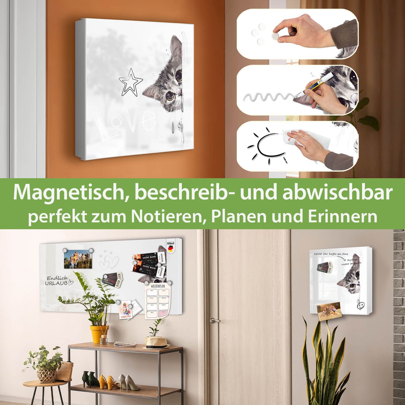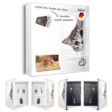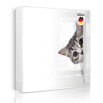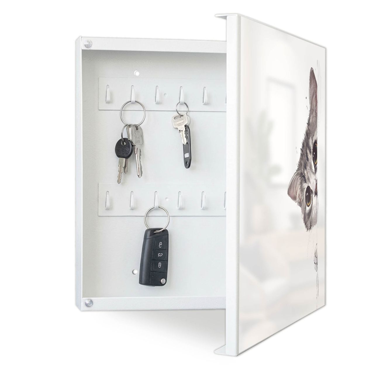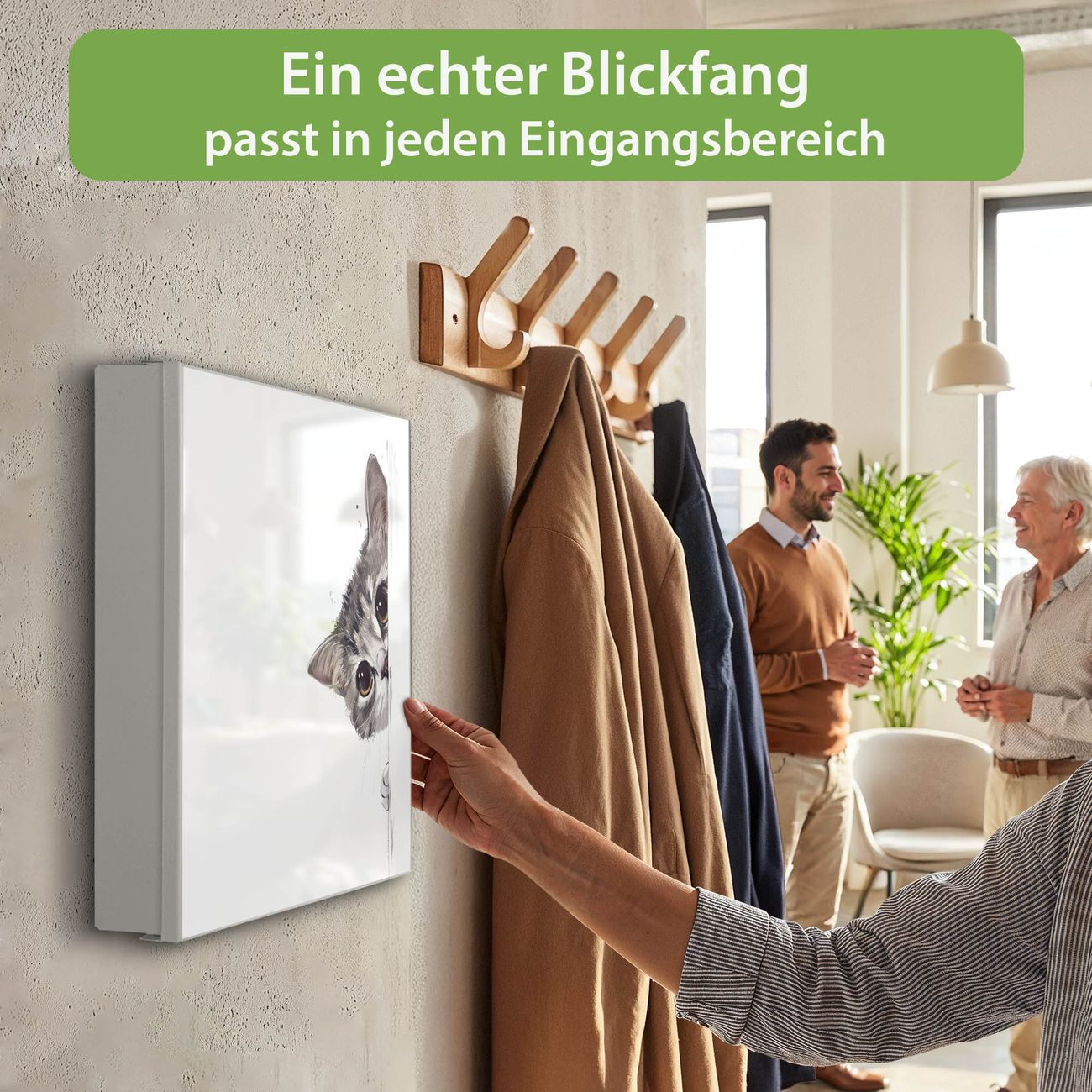 Bringe Ordnung und Eleganz in deinen Eingangsbereich mit dem banjado Schlüsselkasten Motiv Motiv Neugierige Katze. Die moderne Schlüsselbox kombiniert funktionales Design mit hochwertiger Verarbeitung und wird so zu einem echten Hingucker in Flur, Büro oder Ferienwohnung. ✅ Stilvolle Schlüsselaufbewahrung mit Motiv Motiv Neugierige Katze Der Design-Schlüsselkasten Motiv Motiv Neugierige Katze bietet Platz für bis zu 32 Schlüssel, die auf 4 stabilen Reihen mit je 8 Haken übersichtlich verstaut werden. Mit seinen kompakten Maßen von 30 x 30 x 5 cm passt die Schlüsselbox perfekt auch in kleinere Räume. Der weiß lackierte Stahlkorpus mit rechts angeschlagenem Türscharnier harmoniert mit gedruckten Folie auf der Front und fügt sich nahtlos in jedes Wohnambiente ein. Ob als Schlüsselorganizer für Zuhause oder als praktische Lösung für Büros, Praxen und Gewerbe, der banjado Schlüsselkasten sorgt für Ordnung und Übersicht. Dank der magnetischen, mit Kreidestiften beschreibbaren Folie auf der Front kannst du Notizen anheften oder Termine direkt auf der Oberfläche festhalten. Die Schlüsselbox Motiv Motiv Neugierige Katze zur Wandmontage wird inklusive Befestigungsmaterial geliefert und ist schnell angebracht. So hast du deine Schlüssel jederzeit griffbereit und zugleich stilvoll verstaut. Mit diesem banjado Schlüsselkasten Motiv Motiv Neugierige Katze kombinierst du praktische Aufbewahrung mit stilvollem Wohndesign. Ob privat oder geschäftlich, die Schlüsselbox sorgt für mehr Ordnung, Übersicht und ein wohnliches Ambiente.Vorteile im Überblick