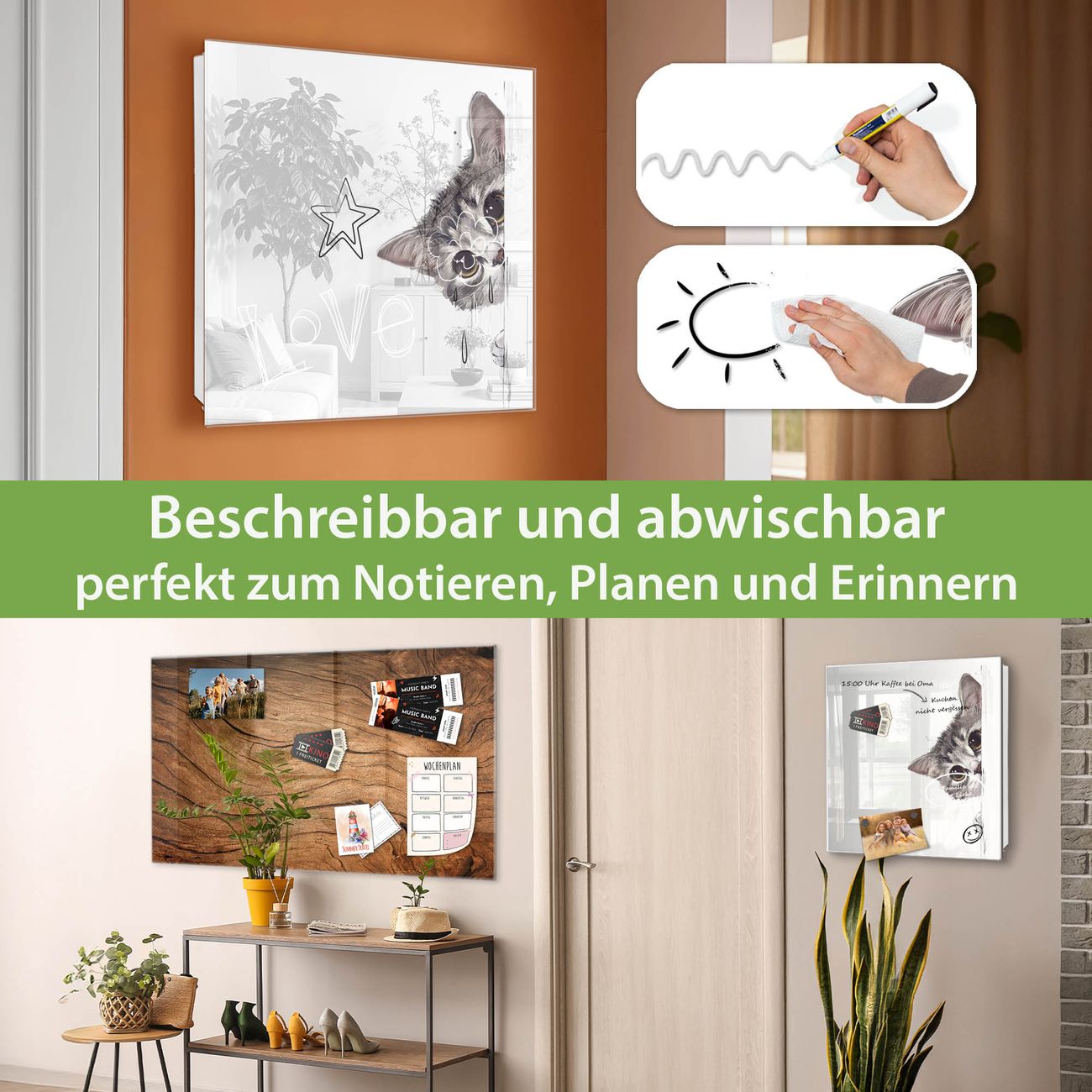 ✅ Magnetisch und mit Kreidestift beschreibbar, gehärtetes Glas, links angeschlagene TürOrdnung und Design in einem
