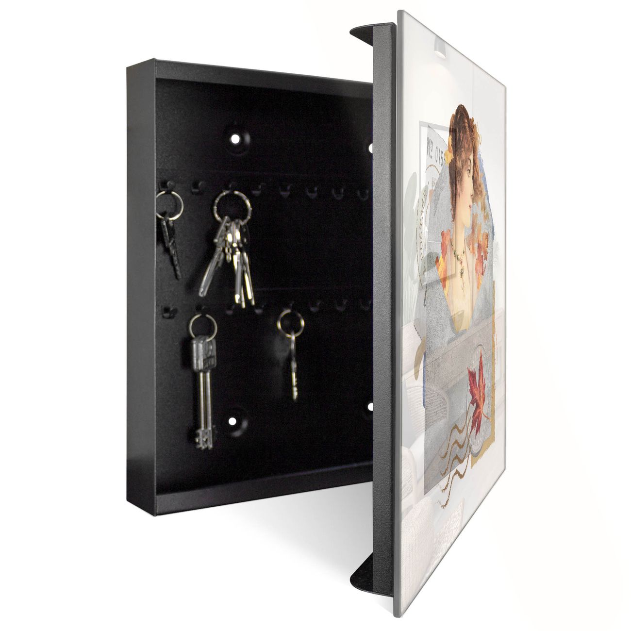 Bringe Ordnung und Eleganz in deinen Eingangsbereich mit dem banjado Schlüsselkasten Motiv Motiv Nostalgische Herbstgrüße. Die moderne Schlüsselbox kombiniert funktionales Design mit hochwertiger Verarbeitung und wird so zu einem echten Hingucker in Flur, Büro oder Ferienwohnung. ✅ Stilvolle Schlüsselaufbewahrung mit Glasfront im Motiv Motiv Nostalgische Herbstgrüße Der Design-Schlüsselkasten Motiv Motiv Nostalgische Herbstgrüße bietet Platz für bis zu 50 Schlüssel, die auf 5 stabilen Reihen mit je 10 Haken übersichtlich verstaut werden. Mit seinen kompakten Maßen von 30 x 30 x 5 cm passt die Schlüsselbox perfekt auch in kleinere Räume. Der schwarz lackierte Stahlkorpus mit rechts angeschlagenem Türscharnier harmoniert mit der Glasfront und fügt sich nahtlos in jedes Wohnambiente ein. Ob als Schlüsselorganizer für Zuhause oder als praktische Lösung für Büros, Praxen und Gewerbe, der banjado Schlüsselkasten sorgt für Ordnung und Übersicht. Dank der magnetischen, mit Kreidestiften beschreibbaren Glasfront kannst du Notizen anheften oder Termine direkt auf der Oberfläche festhalten. Die Schlüsselbox Motiv Motiv Nostalgische Herbstgrüße zur Wandmontage wird inklusive Befestigungsmaterial geliefert und ist schnell angebracht. So hast du deine Schlüssel jederzeit griffbereit und zugleich stilvoll verstaut. Mit diesem banjado Schlüsselkasten Motiv Motiv Nostalgische Herbstgrüße kombinierst du praktische Aufbewahrung mit stilvollem Wohndesign. Ob privat oder geschäftlich, die Schlüsselbox sorgt für mehr Ordnung, Übersicht und ein wohnliches Ambiente.Vorteile im Überblick