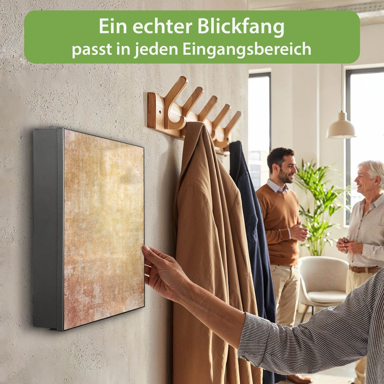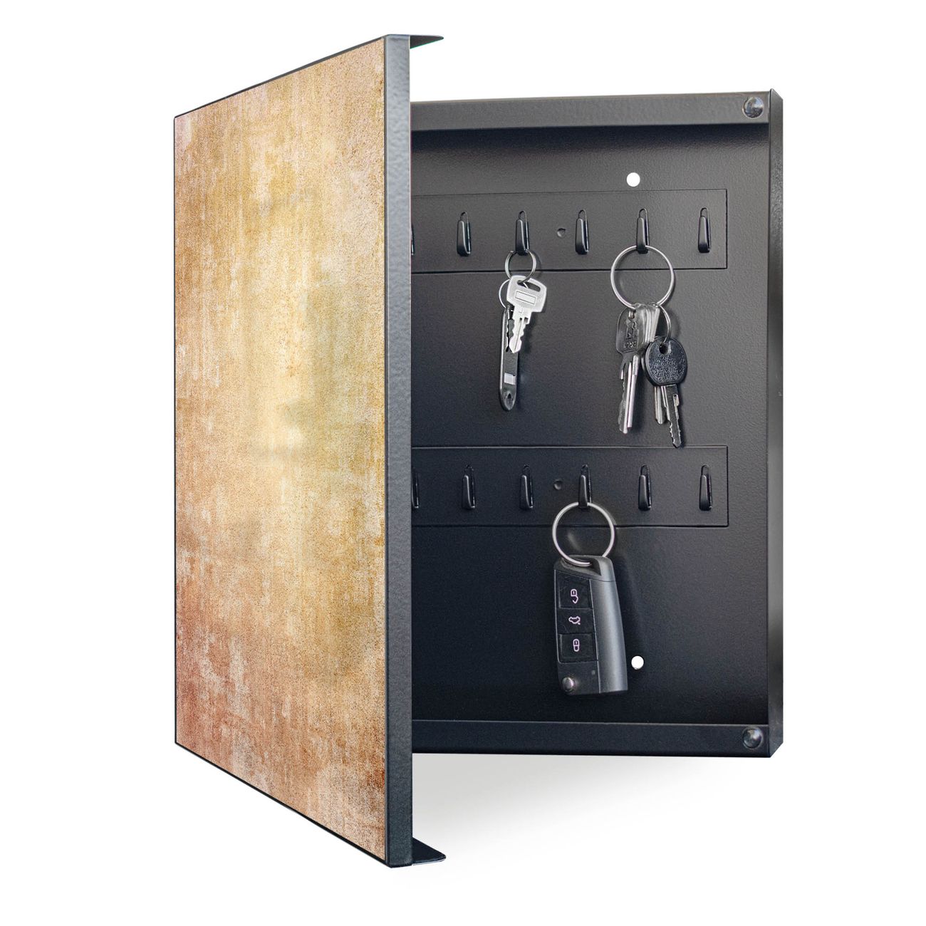 Bringe Ordnung und Eleganz in deinen Eingangsbereich mit dem banjado Schlüsselkasten Motiv Motiv Nostalgische Tapetenstruktur. Die moderne Schlüsselbox kombiniert funktionales Design mit hochwertiger Verarbeitung und wird so zu einem echten Hingucker in Flur, Büro oder Ferienwohnung. ✅ Stilvolle Schlüsselaufbewahrung mit Motiv Motiv Nostalgische Tapetenstruktur Der Design-Schlüsselkasten Motiv Motiv Nostalgische Tapetenstruktur bietet Platz für bis zu 32 Schlüssel, die auf 4 stabilen Reihen mit je 8 Haken übersichtlich verstaut werden. Mit seinen kompakten Maßen von 30 x 30 x 5 cm passt die Schlüsselbox perfekt auch in kleinere Räume. Der schwarz lackierte Stahlkorpus mit links angeschlagenem Türscharnier harmoniert mit gedruckten Folie auf der Front und fügt sich nahtlos in jedes Wohnambiente ein. Ob als Schlüsselorganizer für Zuhause oder als praktische Lösung für Büros, Praxen und Gewerbe, der banjado Schlüsselkasten sorgt für Ordnung und Übersicht. Dank der magnetischen, mit Kreidestiften beschreibbaren Folie auf der Front kannst du Notizen anheften oder Termine direkt auf der Oberfläche festhalten. Die Schlüsselbox Motiv Motiv Nostalgische Tapetenstruktur zur Wandmontage wird inklusive Befestigungsmaterial geliefert und ist schnell angebracht. So hast du deine Schlüssel jederzeit griffbereit und zugleich stilvoll verstaut. Mit diesem banjado Schlüsselkasten Motiv Motiv Nostalgische Tapetenstruktur kombinierst du praktische Aufbewahrung mit stilvollem Wohndesign. Ob privat oder geschäftlich, die Schlüsselbox sorgt für mehr Ordnung, Übersicht und ein wohnliches Ambiente.Vorteile im Überblick