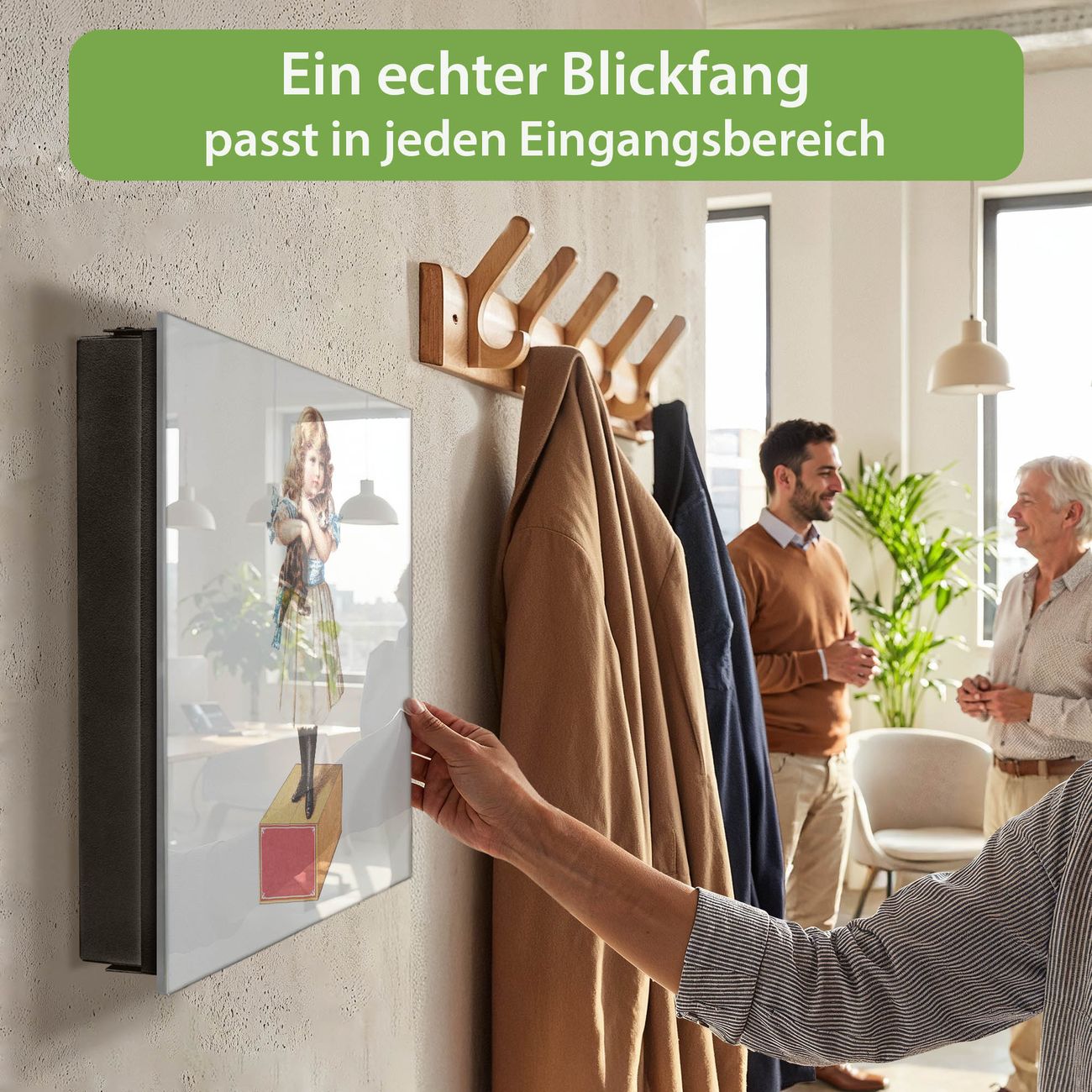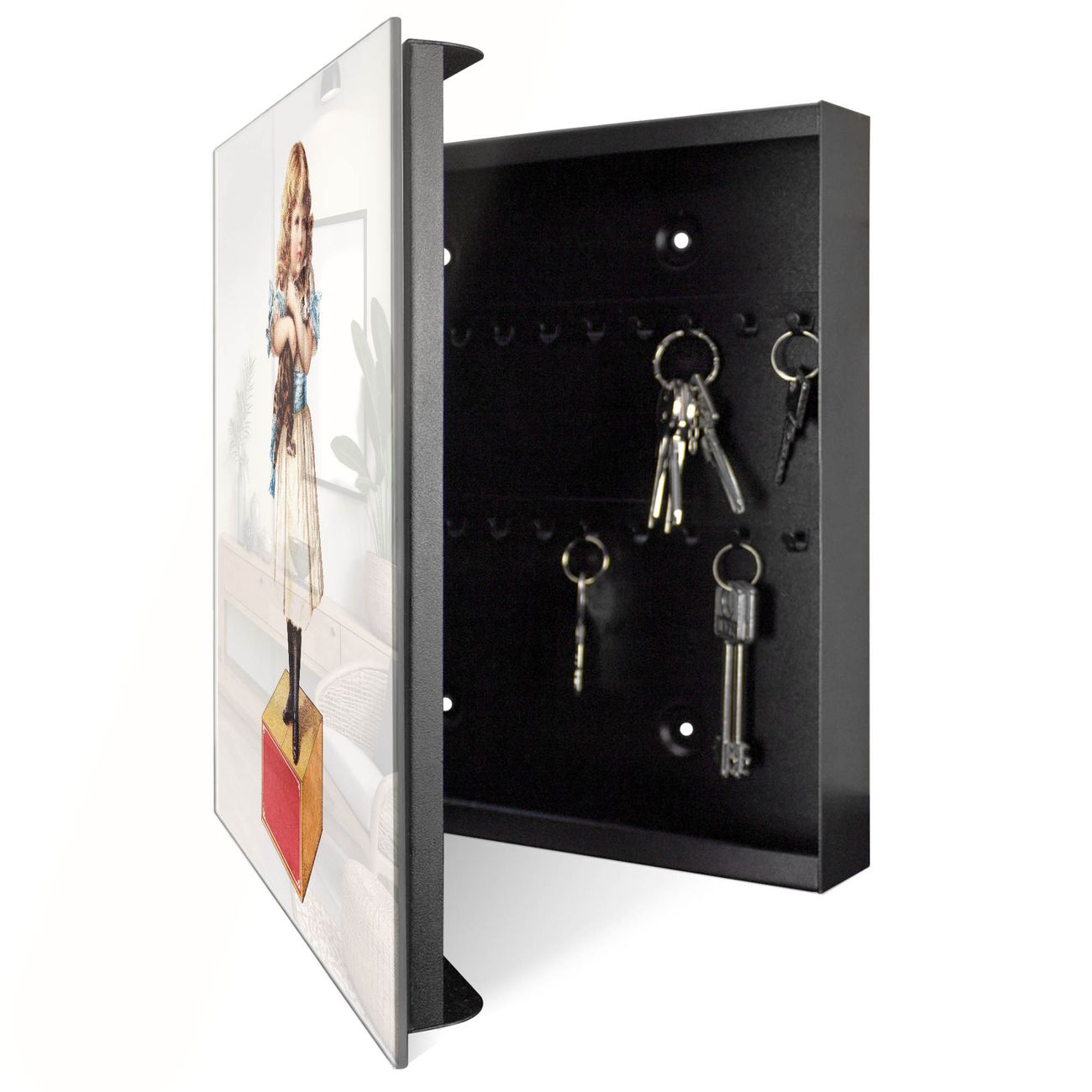 Bringe Ordnung und Eleganz in deinen Eingangsbereich mit dem banjado Schlüsselkasten Motiv Motiv Nostalgisches Mädchen mit Katze. Die moderne Schlüsselbox kombiniert funktionales Design mit hochwertiger Verarbeitung und wird so zu einem echten Hingucker in Flur, Büro oder Ferienwohnung. ✅ Stilvolle Schlüsselaufbewahrung mit Glasfront im Motiv Motiv Nostalgisches Mädchen mit Katze Der Design-Schlüsselkasten Motiv Motiv Nostalgisches Mädchen mit Katze bietet Platz für bis zu 50 Schlüssel, die auf 5 stabilen Reihen mit je 10 Haken übersichtlich verstaut werden. Mit seinen kompakten Maßen von 30 x 30 x 5 cm passt die Schlüsselbox perfekt auch in kleinere Räume. Der schwarz lackierte Stahlkorpus mit rechts angeschlagenem Türscharnier harmoniert mit der Glasfront und fügt sich nahtlos in jedes Wohnambiente ein. Ob als Schlüsselorganizer für Zuhause oder als praktische Lösung für Büros, Praxen und Gewerbe, der banjado Schlüsselkasten sorgt für Ordnung und Übersicht. Dank der magnetischen, mit Kreidestiften beschreibbaren Glasfront kannst du Notizen anheften oder Termine direkt auf der Oberfläche festhalten. Die Schlüsselbox Motiv Motiv Nostalgisches Mädchen mit Katze zur Wandmontage wird inklusive Befestigungsmaterial geliefert und ist schnell angebracht. So hast du deine Schlüssel jederzeit griffbereit und zugleich stilvoll verstaut. Mit diesem banjado Schlüsselkasten Motiv Motiv Nostalgisches Mädchen mit Katze kombinierst du praktische Aufbewahrung mit stilvollem Wohndesign. Ob privat oder geschäftlich, die Schlüsselbox sorgt für mehr Ordnung, Übersicht und ein wohnliches Ambiente.Vorteile im Überblick