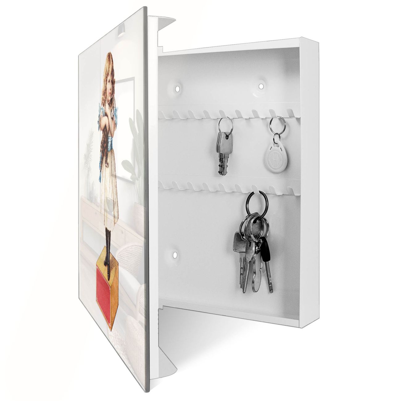 Bringe Ordnung und Eleganz in deinen Eingangsbereich mit dem banjado Schlüsselkasten Motiv Motiv Nostalgisches Mädchen mit Katze. Die moderne Schlüsselbox kombiniert funktionales Design mit hochwertiger Verarbeitung und wird so zu einem echten Hingucker in Flur, Büro oder Ferienwohnung. ✅ Stilvolle Schlüsselaufbewahrung mit Glasfront im Motiv Motiv Nostalgisches Mädchen mit Katze Der Design-Schlüsselkasten Motiv Motiv Nostalgisches Mädchen mit Katze bietet Platz für bis zu 50 Schlüssel, die auf 5 stabilen Reihen mit je 10 Haken übersichtlich verstaut werden. Mit seinen kompakten Maßen von 30 x 30 x 5 cm passt die Schlüsselbox perfekt auch in kleinere Räume. Der weiß lackierte Stahlkorpus mit rechts angeschlagenem Türscharnier harmoniert mit der Glasfront und fügt sich nahtlos in jedes Wohnambiente ein. Ob als Schlüsselorganizer für Zuhause oder als praktische Lösung für Büros, Praxen und Gewerbe, der banjado Schlüsselkasten sorgt für Ordnung und Übersicht. Dank der magnetischen, mit Kreidestiften beschreibbaren Glasfront kannst du Notizen anheften oder Termine direkt auf der Oberfläche festhalten. Die Schlüsselbox Motiv Motiv Nostalgisches Mädchen mit Katze zur Wandmontage wird inklusive Befestigungsmaterial geliefert und ist schnell angebracht. So hast du deine Schlüssel jederzeit griffbereit und zugleich stilvoll verstaut. Mit diesem banjado Schlüsselkasten Motiv Motiv Nostalgisches Mädchen mit Katze kombinierst du praktische Aufbewahrung mit stilvollem Wohndesign. Ob privat oder geschäftlich, die Schlüsselbox sorgt für mehr Ordnung, Übersicht und ein wohnliches Ambiente.Vorteile im Überblick