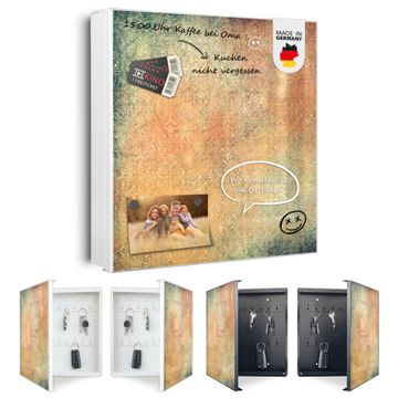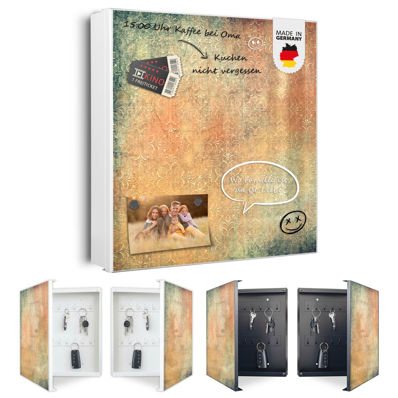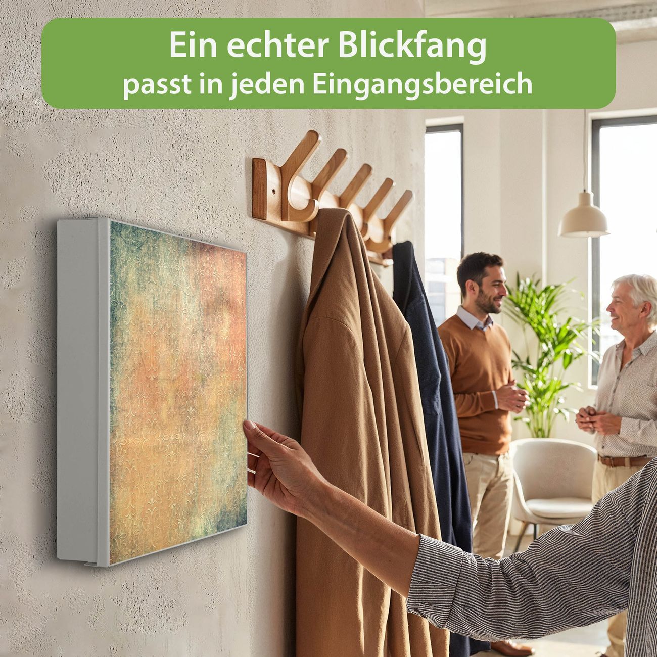 Bringe Ordnung und Eleganz in deinen Eingangsbereich mit dem banjado Schlüsselkasten Motiv Motiv Nostalgisches Muster. Die moderne Schlüsselbox kombiniert funktionales Design mit hochwertiger Verarbeitung und wird so zu einem echten Hingucker in Flur, Büro oder Ferienwohnung. ✅ Stilvolle Schlüsselaufbewahrung mit Motiv Motiv Nostalgisches Muster Der Design-Schlüsselkasten Motiv Motiv Nostalgisches Muster bietet Platz für bis zu 32 Schlüssel, die auf 4 stabilen Reihen mit je 8 Haken übersichtlich verstaut werden. Mit seinen kompakten Maßen von 30 x 30 x 5 cm passt die Schlüsselbox perfekt auch in kleinere Räume. Der weiß lackierte Stahlkorpus mit links angeschlagenem Türscharnier harmoniert mit gedruckten Folie auf der Front und fügt sich nahtlos in jedes Wohnambiente ein. Ob als Schlüsselorganizer für Zuhause oder als praktische Lösung für Büros, Praxen und Gewerbe, der banjado Schlüsselkasten sorgt für Ordnung und Übersicht. Dank der magnetischen, mit Kreidestiften beschreibbaren Folie auf der Front kannst du Notizen anheften oder Termine direkt auf der Oberfläche festhalten. Die Schlüsselbox Motiv Motiv Nostalgisches Muster zur Wandmontage wird inklusive Befestigungsmaterial geliefert und ist schnell angebracht. So hast du deine Schlüssel jederzeit griffbereit und zugleich stilvoll verstaut. Mit diesem banjado Schlüsselkasten Motiv Motiv Nostalgisches Muster kombinierst du praktische Aufbewahrung mit stilvollem Wohndesign. Ob privat oder geschäftlich, die Schlüsselbox sorgt für mehr Ordnung, Übersicht und ein wohnliches Ambiente.Vorteile im Überblick