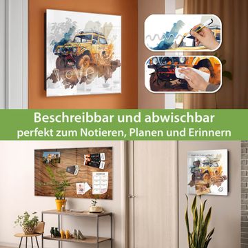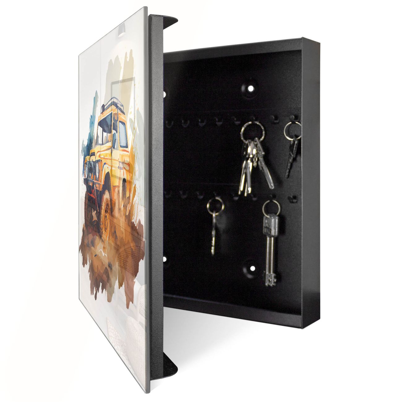 Bringe Ordnung und Eleganz in deinen Eingangsbereich mit dem banjado Schlüsselkasten Motiv Motiv Offroad Abenteuer 2. Die moderne Schlüsselbox kombiniert funktionales Design mit hochwertiger Verarbeitung und wird so zu einem echten Hingucker in Flur, Büro oder Ferienwohnung. ✅ Stilvolle Schlüsselaufbewahrung mit Glasfront im Motiv Motiv Offroad Abenteuer 2 Der Design-Schlüsselkasten Motiv Motiv Offroad Abenteuer 2 bietet Platz für bis zu 50 Schlüssel, die auf 5 stabilen Reihen mit je 10 Haken übersichtlich verstaut werden. Mit seinen kompakten Maßen von 30 x 30 x 5 cm passt die Schlüsselbox perfekt auch in kleinere Räume. Der schwarz lackierte Stahlkorpus mit rechts angeschlagenem Türscharnier harmoniert mit der Glasfront und fügt sich nahtlos in jedes Wohnambiente ein. Ob als Schlüsselorganizer für Zuhause oder als praktische Lösung für Büros, Praxen und Gewerbe, der banjado Schlüsselkasten sorgt für Ordnung und Übersicht. Dank der magnetischen, mit Kreidestiften beschreibbaren Glasfront kannst du Notizen anheften oder Termine direkt auf der Oberfläche festhalten. Die Schlüsselbox Motiv Motiv Offroad Abenteuer 2 zur Wandmontage wird inklusive Befestigungsmaterial geliefert und ist schnell angebracht. So hast du deine Schlüssel jederzeit griffbereit und zugleich stilvoll verstaut. Mit diesem banjado Schlüsselkasten Motiv Motiv Offroad Abenteuer 2 kombinierst du praktische Aufbewahrung mit stilvollem Wohndesign. Ob privat oder geschäftlich, die Schlüsselbox sorgt für mehr Ordnung, Übersicht und ein wohnliches Ambiente.Vorteile im Überblick