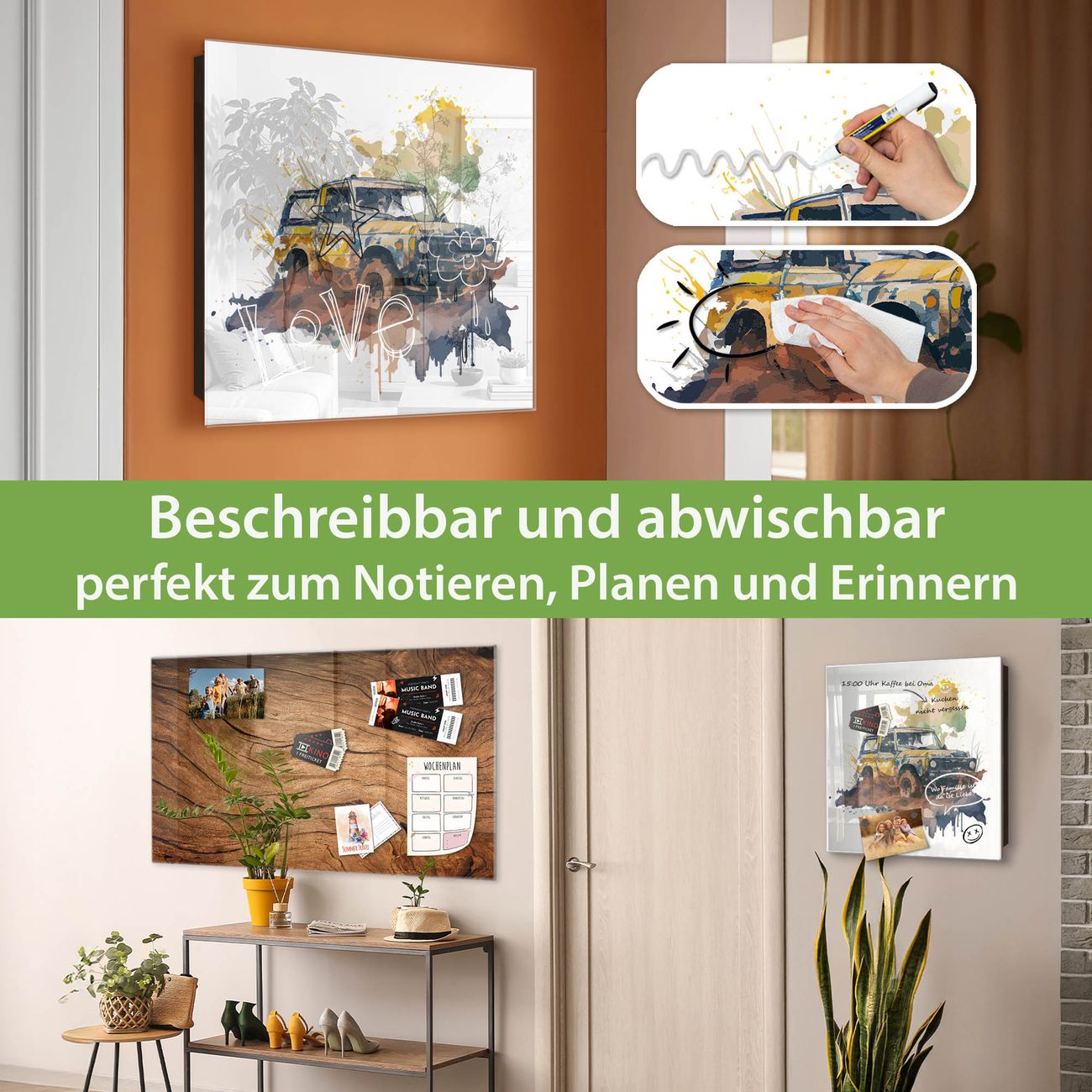 Bringe Ordnung und Eleganz in deinen Eingangsbereich mit dem banjado Schlüsselkasten Motiv Motiv Offroad Abenteuer. Die moderne Schlüsselbox kombiniert funktionales Design mit hochwertiger Verarbeitung und wird so zu einem echten Hingucker in Flur, Büro oder Ferienwohnung. ✅ Stilvolle Schlüsselaufbewahrung mit Glasfront im Motiv Motiv Offroad Abenteuer Der Design-Schlüsselkasten Motiv Motiv Offroad Abenteuer bietet Platz für bis zu 50 Schlüssel, die auf 5 stabilen Reihen mit je 10 Haken übersichtlich verstaut werden. Mit seinen kompakten Maßen von 30 x 30 x 5 cm passt die Schlüsselbox perfekt auch in kleinere Räume. Der schwarz lackierte Stahlkorpus mit rechts angeschlagenem Türscharnier harmoniert mit der Glasfront und fügt sich nahtlos in jedes Wohnambiente ein. Ob als Schlüsselorganizer für Zuhause oder als praktische Lösung für Büros, Praxen und Gewerbe, der banjado Schlüsselkasten sorgt für Ordnung und Übersicht. Dank der magnetischen, mit Kreidestiften beschreibbaren Glasfront kannst du Notizen anheften oder Termine direkt auf der Oberfläche festhalten. Die Schlüsselbox Motiv Motiv Offroad Abenteuer zur Wandmontage wird inklusive Befestigungsmaterial geliefert und ist schnell angebracht. So hast du deine Schlüssel jederzeit griffbereit und zugleich stilvoll verstaut. Mit diesem banjado Schlüsselkasten Motiv Motiv Offroad Abenteuer kombinierst du praktische Aufbewahrung mit stilvollem Wohndesign. Ob privat oder geschäftlich, die Schlüsselbox sorgt für mehr Ordnung, Übersicht und ein wohnliches Ambiente.Vorteile im Überblick