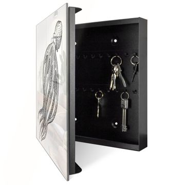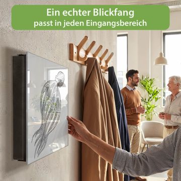 Bringe Ordnung und Eleganz in deinen Eingangsbereich mit dem banjado Schlüsselkasten Motiv Motiv Oktopus 8. Die moderne Schlüsselbox kombiniert funktionales Design mit hochwertiger Verarbeitung und wird so zu einem echten Hingucker in Flur, Büro oder Ferienwohnung. ✅ Stilvolle Schlüsselaufbewahrung mit Glasfront im Motiv Motiv Oktopus 8 Der Design-Schlüsselkasten Motiv Motiv Oktopus 8 bietet Platz für bis zu 50 Schlüssel, die auf 5 stabilen Reihen mit je 10 Haken übersichtlich verstaut werden. Mit seinen kompakten Maßen von 30 x 30 x 5 cm passt die Schlüsselbox perfekt auch in kleinere Räume. Der schwarz lackierte Stahlkorpus mit rechts angeschlagenem Türscharnier harmoniert mit der Glasfront und fügt sich nahtlos in jedes Wohnambiente ein. Ob als Schlüsselorganizer für Zuhause oder als praktische Lösung für Büros, Praxen und Gewerbe, der banjado Schlüsselkasten sorgt für Ordnung und Übersicht. Dank der magnetischen, mit Kreidestiften beschreibbaren Glasfront kannst du Notizen anheften oder Termine direkt auf der Oberfläche festhalten. Die Schlüsselbox Motiv Motiv Oktopus 8 zur Wandmontage wird inklusive Befestigungsmaterial geliefert und ist schnell angebracht. So hast du deine Schlüssel jederzeit griffbereit und zugleich stilvoll verstaut. Mit diesem banjado Schlüsselkasten Motiv Motiv Oktopus 8 kombinierst du praktische Aufbewahrung mit stilvollem Wohndesign. Ob privat oder geschäftlich, die Schlüsselbox sorgt für mehr Ordnung, Übersicht und ein wohnliches Ambiente.Vorteile im Überblick