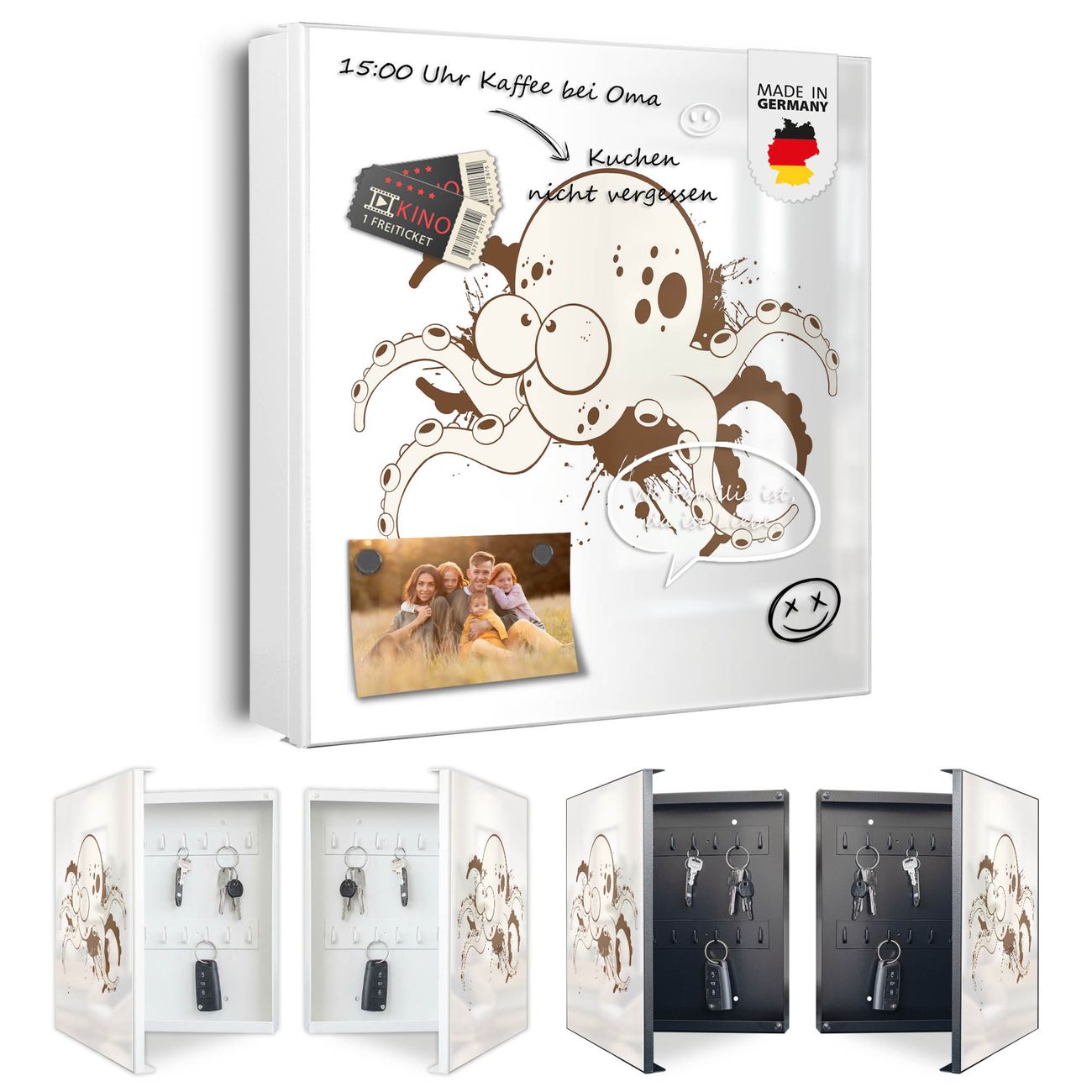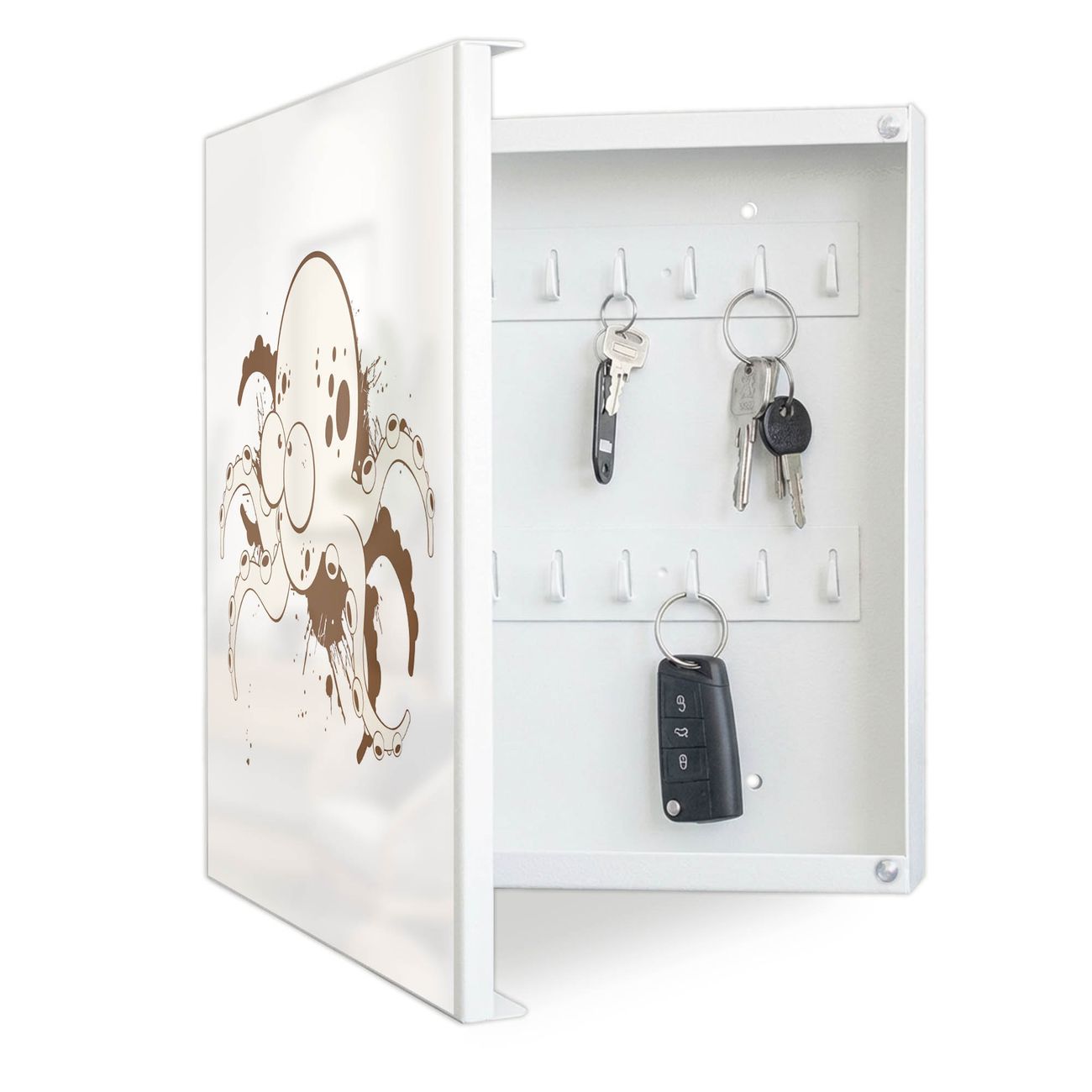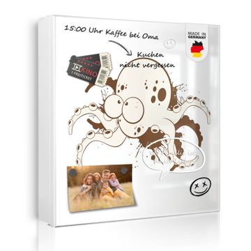 Bringe Ordnung und Eleganz in deinen Eingangsbereich mit dem banjado Schlüsselkasten Motiv Motiv Oktopus Comic 2. Die moderne Schlüsselbox kombiniert funktionales Design mit hochwertiger Verarbeitung und wird so zu einem echten Hingucker in Flur, Büro oder Ferienwohnung. ✅ Stilvolle Schlüsselaufbewahrung mit Motiv Motiv Oktopus Comic 2 Der Design-Schlüsselkasten Motiv Motiv Oktopus Comic 2 bietet Platz für bis zu 32 Schlüssel, die auf 4 stabilen Reihen mit je 8 Haken übersichtlich verstaut werden. Mit seinen kompakten Maßen von 30 x 30 x 5 cm passt die Schlüsselbox perfekt auch in kleinere Räume. Der weiß lackierte Stahlkorpus mit links angeschlagenem Türscharnier harmoniert mit gedruckten Folie auf der Front und fügt sich nahtlos in jedes Wohnambiente ein. Ob als Schlüsselorganizer für Zuhause oder als praktische Lösung für Büros, Praxen und Gewerbe, der banjado Schlüsselkasten sorgt für Ordnung und Übersicht. Dank der magnetischen, mit Kreidestiften beschreibbaren Folie auf der Front kannst du Notizen anheften oder Termine direkt auf der Oberfläche festhalten. Die Schlüsselbox Motiv Motiv Oktopus Comic 2 zur Wandmontage wird inklusive Befestigungsmaterial geliefert und ist schnell angebracht. So hast du deine Schlüssel jederzeit griffbereit und zugleich stilvoll verstaut. Mit diesem banjado Schlüsselkasten Motiv Motiv Oktopus Comic 2 kombinierst du praktische Aufbewahrung mit stilvollem Wohndesign. Ob privat oder geschäftlich, die Schlüsselbox sorgt für mehr Ordnung, Übersicht und ein wohnliches Ambiente.Vorteile im Überblick