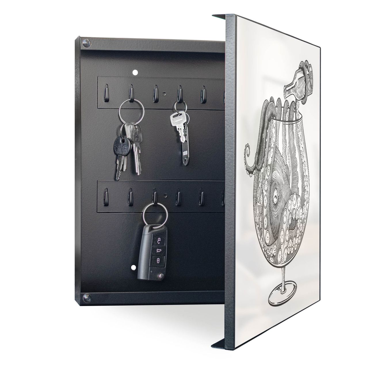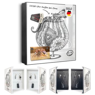 Bringe Ordnung und Eleganz in deinen Eingangsbereich mit dem banjado Schlüsselkasten Motiv Motiv Oktopus im Glas 2. Die moderne Schlüsselbox kombiniert funktionales Design mit hochwertiger Verarbeitung und wird so zu einem echten Hingucker in Flur, Büro oder Ferienwohnung. ✅ Stilvolle Schlüsselaufbewahrung mit Motiv Motiv Oktopus im Glas 2 Der Design-Schlüsselkasten Motiv Motiv Oktopus im Glas 2 bietet Platz für bis zu 32 Schlüssel, die auf 4 stabilen Reihen mit je 8 Haken übersichtlich verstaut werden. Mit seinen kompakten Maßen von 30 x 30 x 5 cm passt die Schlüsselbox perfekt auch in kleinere Räume. Der schwarz lackierte Stahlkorpus mit rechts angeschlagenem Türscharnier harmoniert mit gedruckten Folie auf der Front und fügt sich nahtlos in jedes Wohnambiente ein. Ob als Schlüsselorganizer für Zuhause oder als praktische Lösung für Büros, Praxen und Gewerbe, der banjado Schlüsselkasten sorgt für Ordnung und Übersicht. Dank der magnetischen, mit Kreidestiften beschreibbaren Folie auf der Front kannst du Notizen anheften oder Termine direkt auf der Oberfläche festhalten. Die Schlüsselbox Motiv Motiv Oktopus im Glas 2 zur Wandmontage wird inklusive Befestigungsmaterial geliefert und ist schnell angebracht. So hast du deine Schlüssel jederzeit griffbereit und zugleich stilvoll verstaut. Mit diesem banjado Schlüsselkasten Motiv Motiv Oktopus im Glas 2 kombinierst du praktische Aufbewahrung mit stilvollem Wohndesign. Ob privat oder geschäftlich, die Schlüsselbox sorgt für mehr Ordnung, Übersicht und ein wohnliches Ambiente.Vorteile im Überblick