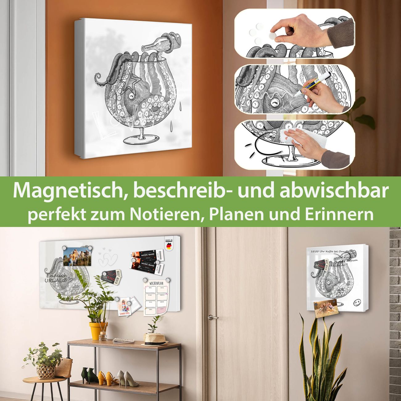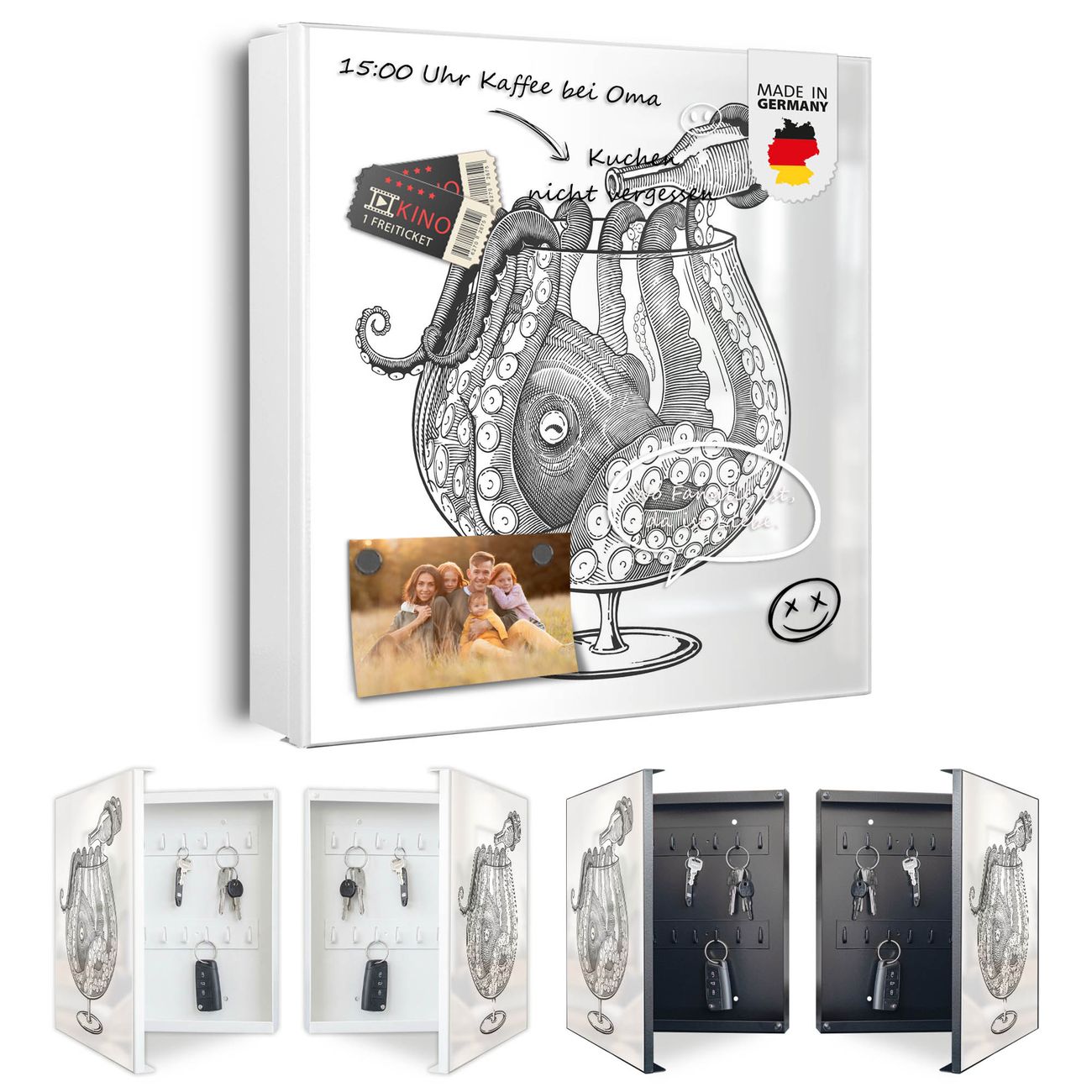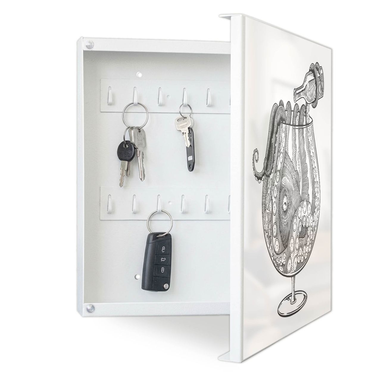 Bringe Ordnung und Eleganz in deinen Eingangsbereich mit dem banjado Schlüsselkasten Motiv Motiv Oktopus im Glas 2. Die moderne Schlüsselbox kombiniert funktionales Design mit hochwertiger Verarbeitung und wird so zu einem echten Hingucker in Flur, Büro oder Ferienwohnung. ✅ Stilvolle Schlüsselaufbewahrung mit Motiv Motiv Oktopus im Glas 2 Der Design-Schlüsselkasten Motiv Motiv Oktopus im Glas 2 bietet Platz für bis zu 32 Schlüssel, die auf 4 stabilen Reihen mit je 8 Haken übersichtlich verstaut werden. Mit seinen kompakten Maßen von 30 x 30 x 5 cm passt die Schlüsselbox perfekt auch in kleinere Räume. Der weiß lackierte Stahlkorpus mit rechts angeschlagenem Türscharnier harmoniert mit gedruckten Folie auf der Front und fügt sich nahtlos in jedes Wohnambiente ein. Ob als Schlüsselorganizer für Zuhause oder als praktische Lösung für Büros, Praxen und Gewerbe, der banjado Schlüsselkasten sorgt für Ordnung und Übersicht. Dank der magnetischen, mit Kreidestiften beschreibbaren Folie auf der Front kannst du Notizen anheften oder Termine direkt auf der Oberfläche festhalten. Die Schlüsselbox Motiv Motiv Oktopus im Glas 2 zur Wandmontage wird inklusive Befestigungsmaterial geliefert und ist schnell angebracht. So hast du deine Schlüssel jederzeit griffbereit und zugleich stilvoll verstaut. Mit diesem banjado Schlüsselkasten Motiv Motiv Oktopus im Glas 2 kombinierst du praktische Aufbewahrung mit stilvollem Wohndesign. Ob privat oder geschäftlich, die Schlüsselbox sorgt für mehr Ordnung, Übersicht und ein wohnliches Ambiente.Vorteile im Überblick