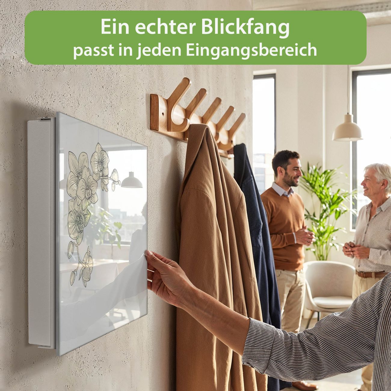 Bringe Ordnung und Eleganz in deinen Eingangsbereich mit dem banjado Schlüsselkasten Motiv Motiv Orchideenzeichnung. Die moderne Schlüsselbox kombiniert funktionales Design mit hochwertiger Verarbeitung und wird so zu einem echten Hingucker in Flur, Büro oder Ferienwohnung. ✅ Stilvolle Schlüsselaufbewahrung mit Glasfront im Motiv Motiv Orchideenzeichnung Der Design-Schlüsselkasten Motiv Motiv Orchideenzeichnung bietet Platz für bis zu 50 Schlüssel, die auf 5 stabilen Reihen mit je 10 Haken übersichtlich verstaut werden. Mit seinen kompakten Maßen von 30 x 30 x 5 cm passt die Schlüsselbox perfekt auch in kleinere Räume. Der weiß lackierte Stahlkorpus mit rechts angeschlagenem Türscharnier harmoniert mit der Glasfront und fügt sich nahtlos in jedes Wohnambiente ein. Ob als Schlüsselorganizer für Zuhause oder als praktische Lösung für Büros, Praxen und Gewerbe, der banjado Schlüsselkasten sorgt für Ordnung und Übersicht. Dank der magnetischen, mit Kreidestiften beschreibbaren Glasfront kannst du Notizen anheften oder Termine direkt auf der Oberfläche festhalten. Die Schlüsselbox Motiv Motiv Orchideenzeichnung zur Wandmontage wird inklusive Befestigungsmaterial geliefert und ist schnell angebracht. So hast du deine Schlüssel jederzeit griffbereit und zugleich stilvoll verstaut. Mit diesem banjado Schlüsselkasten Motiv Motiv Orchideenzeichnung kombinierst du praktische Aufbewahrung mit stilvollem Wohndesign. Ob privat oder geschäftlich, die Schlüsselbox sorgt für mehr Ordnung, Übersicht und ein wohnliches Ambiente.Vorteile im Überblick