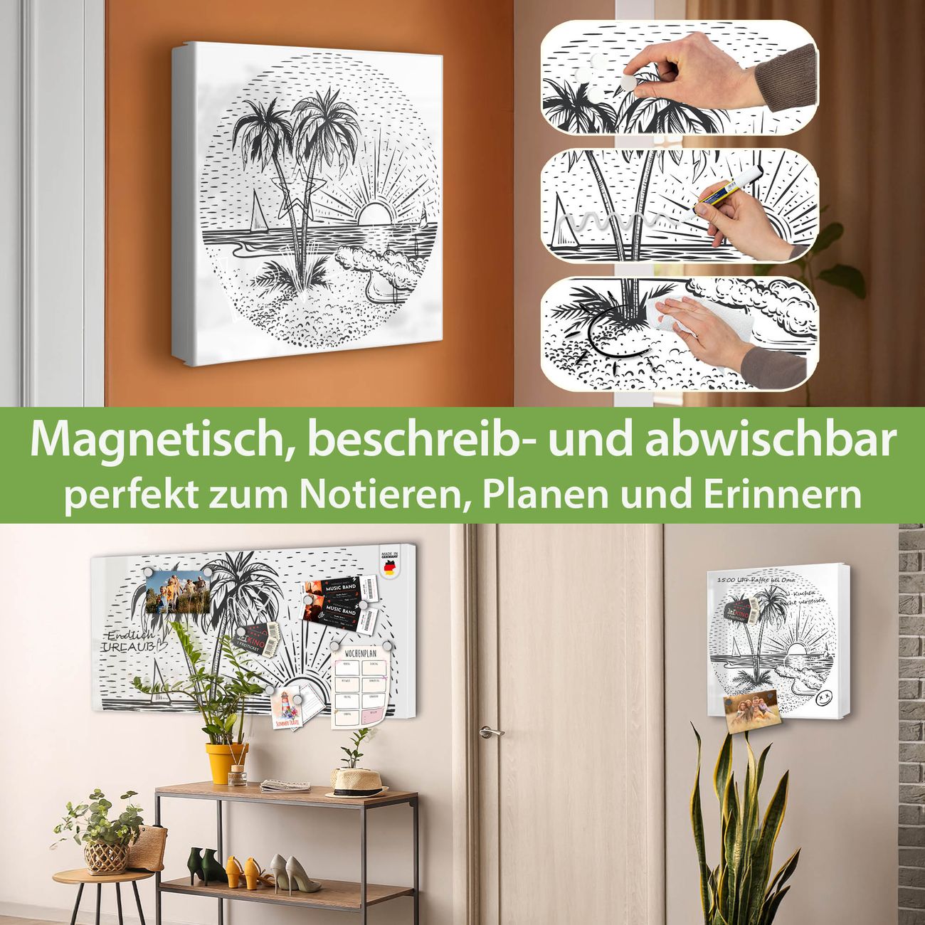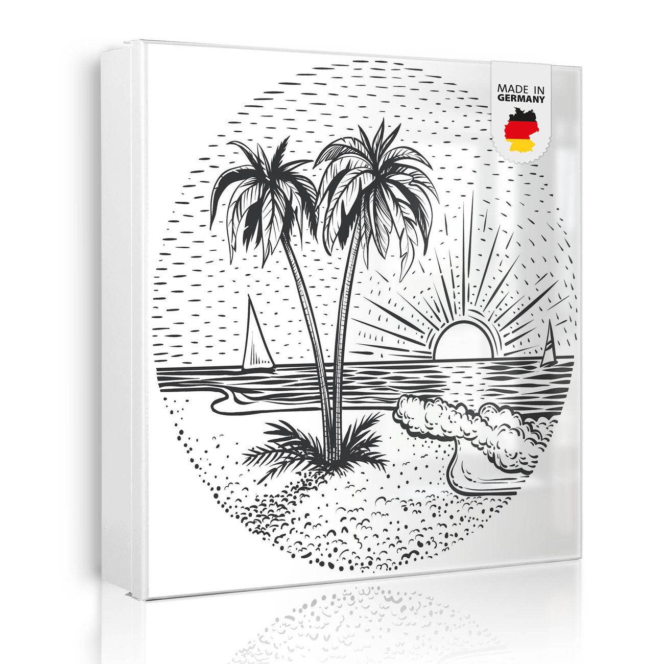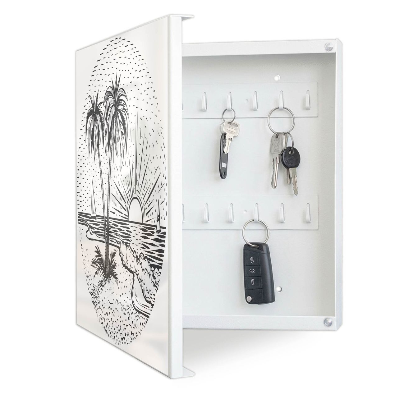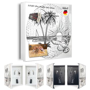 Bringe Ordnung und Eleganz in deinen Eingangsbereich mit dem banjado Schlüsselkasten Motiv Motiv Palmenstrand 2. Die moderne Schlüsselbox kombiniert funktionales Design mit hochwertiger Verarbeitung und wird so zu einem echten Hingucker in Flur, Büro oder Ferienwohnung. ✅ Stilvolle Schlüsselaufbewahrung mit Motiv Motiv Palmenstrand 2 Der Design-Schlüsselkasten Motiv Motiv Palmenstrand 2 bietet Platz für bis zu 32 Schlüssel, die auf 4 stabilen Reihen mit je 8 Haken übersichtlich verstaut werden. Mit seinen kompakten Maßen von 30 x 30 x 5 cm passt die Schlüsselbox perfekt auch in kleinere Räume. Der weiß lackierte Stahlkorpus mit links angeschlagenem Türscharnier harmoniert mit gedruckten Folie auf der Front und fügt sich nahtlos in jedes Wohnambiente ein. Ob als Schlüsselorganizer für Zuhause oder als praktische Lösung für Büros, Praxen und Gewerbe, der banjado Schlüsselkasten sorgt für Ordnung und Übersicht. Dank der magnetischen, mit Kreidestiften beschreibbaren Folie auf der Front kannst du Notizen anheften oder Termine direkt auf der Oberfläche festhalten. Die Schlüsselbox Motiv Motiv Palmenstrand 2 zur Wandmontage wird inklusive Befestigungsmaterial geliefert und ist schnell angebracht. So hast du deine Schlüssel jederzeit griffbereit und zugleich stilvoll verstaut. Mit diesem banjado Schlüsselkasten Motiv Motiv Palmenstrand 2 kombinierst du praktische Aufbewahrung mit stilvollem Wohndesign. Ob privat oder geschäftlich, die Schlüsselbox sorgt für mehr Ordnung, Übersicht und ein wohnliches Ambiente.Vorteile im Überblick