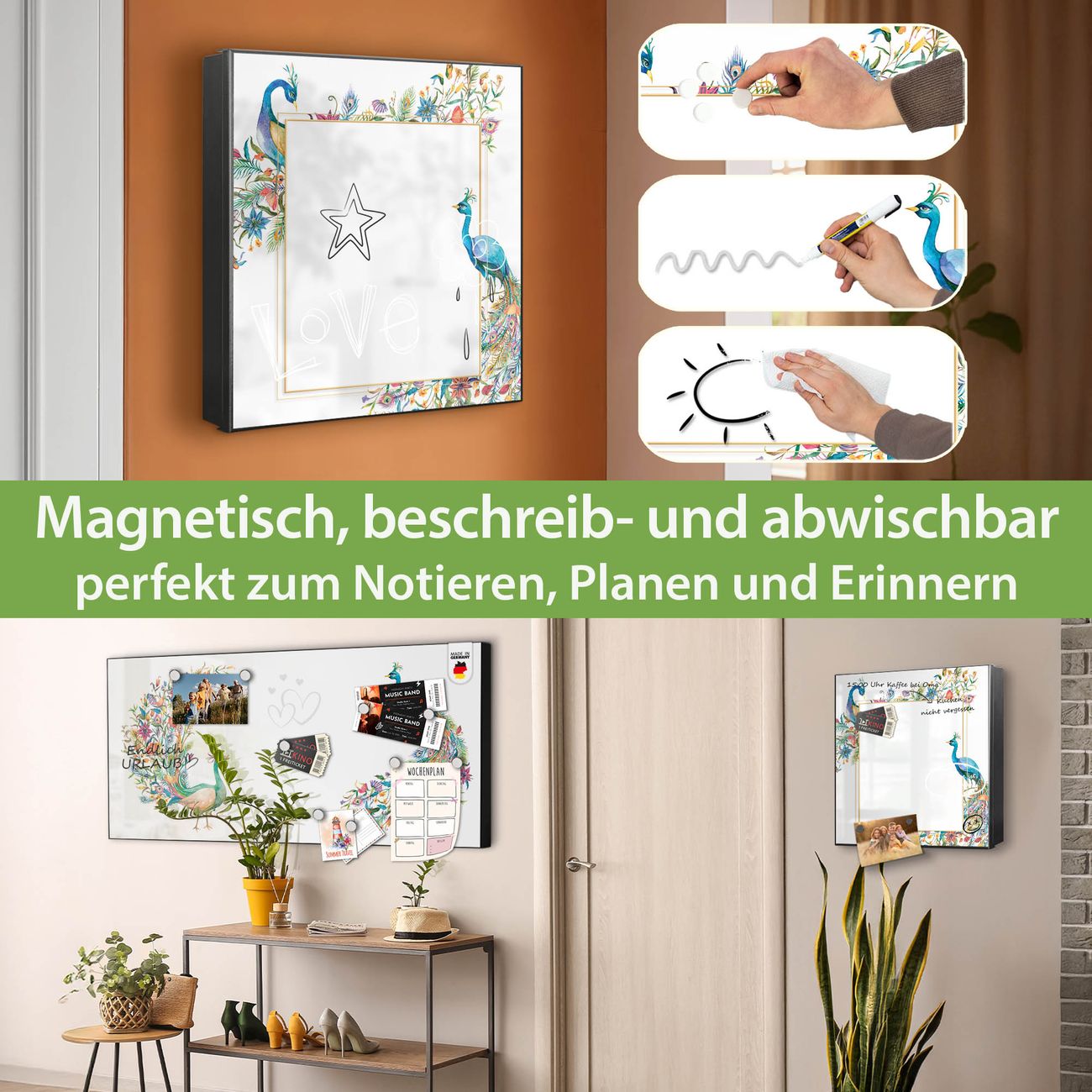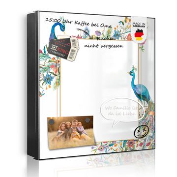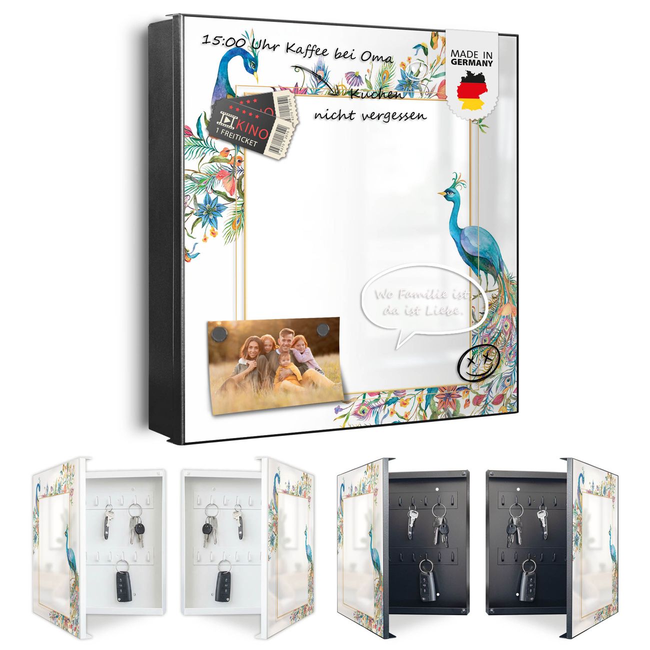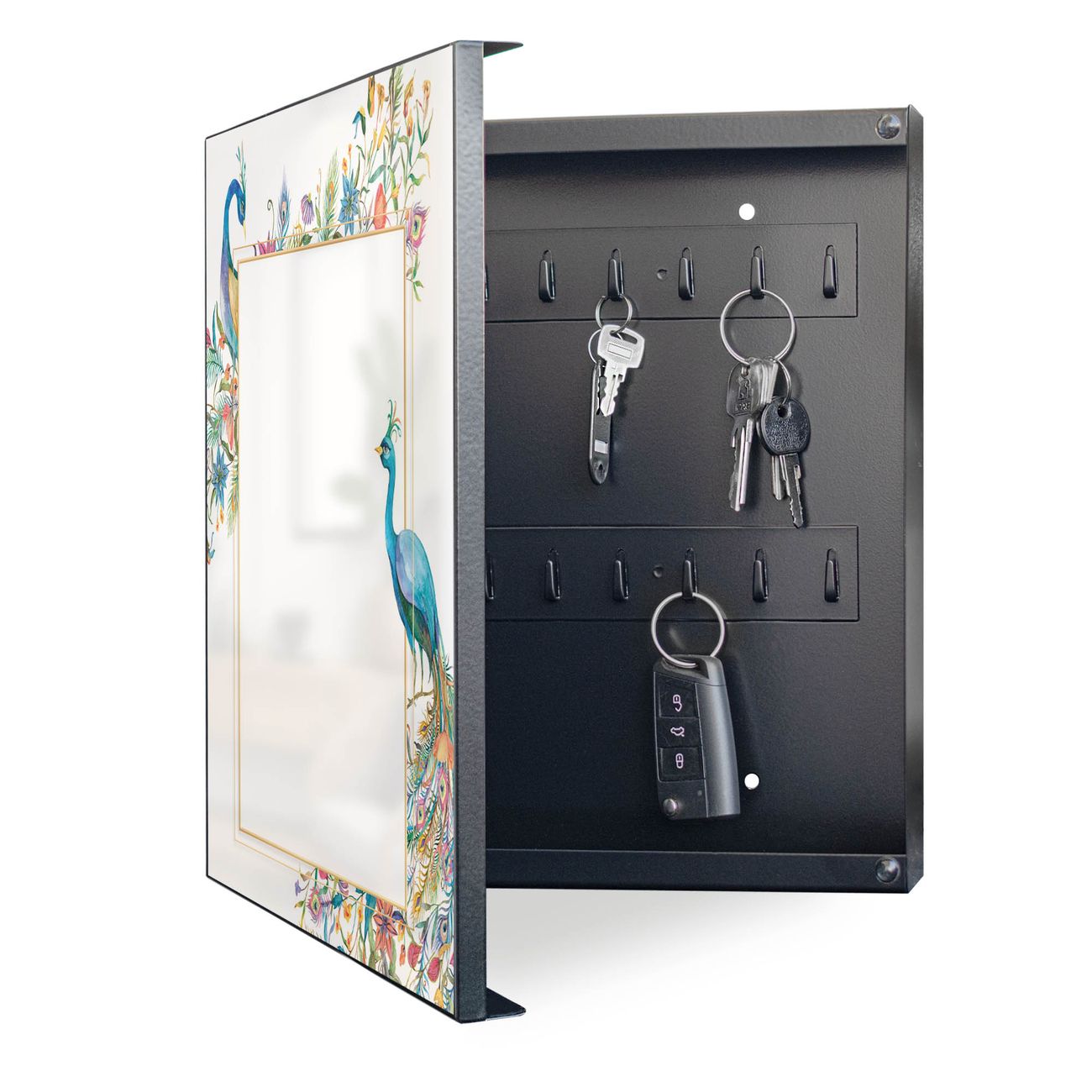 Bringe Ordnung und Eleganz in deinen Eingangsbereich mit dem banjado Schlüsselkasten Motiv Motiv Pfauenparadies. Die moderne Schlüsselbox kombiniert funktionales Design mit hochwertiger Verarbeitung und wird so zu einem echten Hingucker in Flur, Büro oder Ferienwohnung. ✅ Stilvolle Schlüsselaufbewahrung mit Motiv Motiv Pfauenparadies Der Design-Schlüsselkasten Motiv Motiv Pfauenparadies bietet Platz für bis zu 32 Schlüssel, die auf 4 stabilen Reihen mit je 8 Haken übersichtlich verstaut werden. Mit seinen kompakten Maßen von 30 x 30 x 5 cm passt die Schlüsselbox perfekt auch in kleinere Räume. Der schwarz lackierte Stahlkorpus mit links angeschlagenem Türscharnier harmoniert mit gedruckten Folie auf der Front und fügt sich nahtlos in jedes Wohnambiente ein. Ob als Schlüsselorganizer für Zuhause oder als praktische Lösung für Büros, Praxen und Gewerbe, der banjado Schlüsselkasten sorgt für Ordnung und Übersicht. Dank der magnetischen, mit Kreidestiften beschreibbaren Folie auf der Front kannst du Notizen anheften oder Termine direkt auf der Oberfläche festhalten. Die Schlüsselbox Motiv Motiv Pfauenparadies zur Wandmontage wird inklusive Befestigungsmaterial geliefert und ist schnell angebracht. So hast du deine Schlüssel jederzeit griffbereit und zugleich stilvoll verstaut. Mit diesem banjado Schlüsselkasten Motiv Motiv Pfauenparadies kombinierst du praktische Aufbewahrung mit stilvollem Wohndesign. Ob privat oder geschäftlich, die Schlüsselbox sorgt für mehr Ordnung, Übersicht und ein wohnliches Ambiente.Vorteile im Überblick