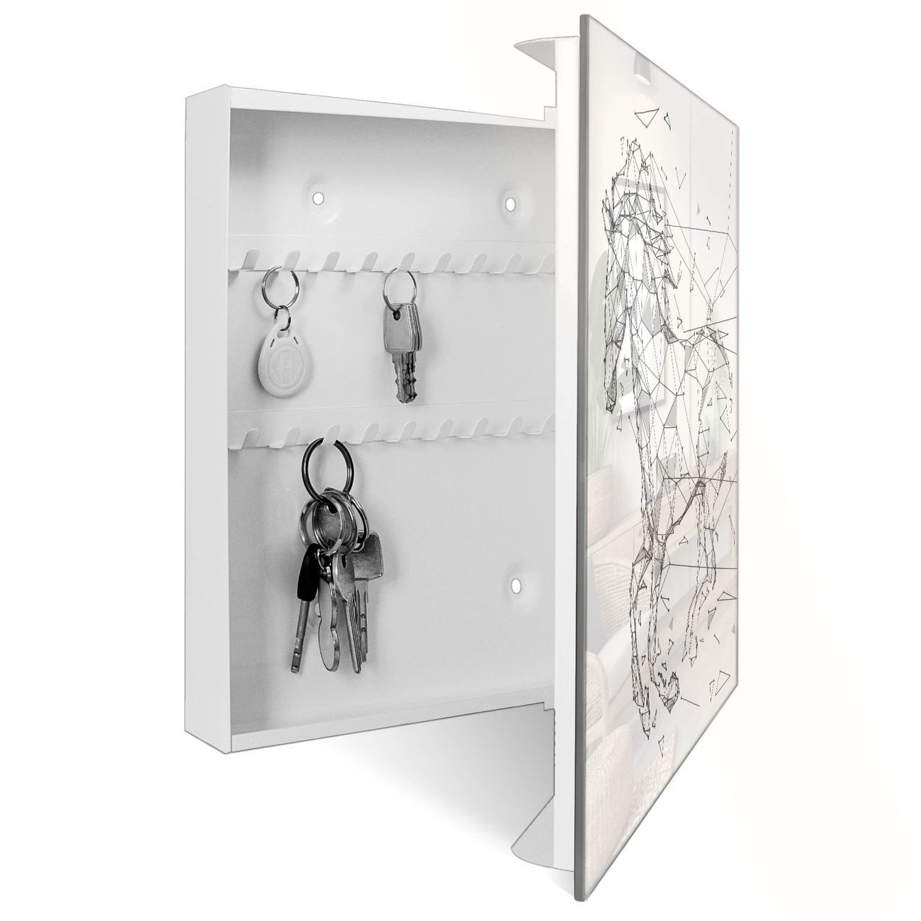 Bringe Ordnung und Eleganz in deinen Eingangsbereich mit dem banjado Schlüsselkasten Motiv Motiv Pferd abstrakt 2. Die moderne Schlüsselbox kombiniert funktionales Design mit hochwertiger Verarbeitung und wird so zu einem echten Hingucker in Flur, Büro oder Ferienwohnung. ✅ Stilvolle Schlüsselaufbewahrung mit Glasfront im Motiv Motiv Pferd abstrakt 2 Der Design-Schlüsselkasten Motiv Motiv Pferd abstrakt 2 bietet Platz für bis zu 50 Schlüssel, die auf 5 stabilen Reihen mit je 10 Haken übersichtlich verstaut werden. Mit seinen kompakten Maßen von 30 x 30 x 5 cm passt die Schlüsselbox perfekt auch in kleinere Räume. Der weiß lackierte Stahlkorpus mit rechts angeschlagenem Türscharnier harmoniert mit der Glasfront und fügt sich nahtlos in jedes Wohnambiente ein. Ob als Schlüsselorganizer für Zuhause oder als praktische Lösung für Büros, Praxen und Gewerbe, der banjado Schlüsselkasten sorgt für Ordnung und Übersicht. Dank der magnetischen, mit Kreidestiften beschreibbaren Glasfront kannst du Notizen anheften oder Termine direkt auf der Oberfläche festhalten. Die Schlüsselbox Motiv Motiv Pferd abstrakt 2 zur Wandmontage wird inklusive Befestigungsmaterial geliefert und ist schnell angebracht. So hast du deine Schlüssel jederzeit griffbereit und zugleich stilvoll verstaut. Mit diesem banjado Schlüsselkasten Motiv Motiv Pferd abstrakt 2 kombinierst du praktische Aufbewahrung mit stilvollem Wohndesign. Ob privat oder geschäftlich, die Schlüsselbox sorgt für mehr Ordnung, Übersicht und ein wohnliches Ambiente.Vorteile im Überblick