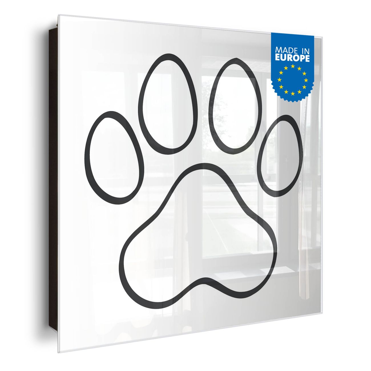 Bringe Ordnung und Eleganz in deinen Eingangsbereich mit dem banjado Schlüsselkasten Motiv Motiv Pfote 2. Die moderne Schlüsselbox kombiniert funktionales Design mit hochwertiger Verarbeitung und wird so zu einem echten Hingucker in Flur, Büro oder Ferienwohnung. ✅ Stilvolle Schlüsselaufbewahrung mit Glasfront im Motiv Motiv Pfote 2 Der Design-Schlüsselkasten Motiv Motiv Pfote 2 bietet Platz für bis zu 50 Schlüssel, die auf 5 stabilen Reihen mit je 10 Haken übersichtlich verstaut werden. Mit seinen kompakten Maßen von 30 x 30 x 5 cm passt die Schlüsselbox perfekt auch in kleinere Räume. Der schwarz lackierte Stahlkorpus mit rechts angeschlagenem Türscharnier harmoniert mit der Glasfront und fügt sich nahtlos in jedes Wohnambiente ein. Ob als Schlüsselorganizer für Zuhause oder als praktische Lösung für Büros, Praxen und Gewerbe, der banjado Schlüsselkasten sorgt für Ordnung und Übersicht. Dank der magnetischen, mit Kreidestiften beschreibbaren Glasfront kannst du Notizen anheften oder Termine direkt auf der Oberfläche festhalten. Die Schlüsselbox Motiv Motiv Pfote 2 zur Wandmontage wird inklusive Befestigungsmaterial geliefert und ist schnell angebracht. So hast du deine Schlüssel jederzeit griffbereit und zugleich stilvoll verstaut. Mit diesem banjado Schlüsselkasten Motiv Motiv Pfote 2 kombinierst du praktische Aufbewahrung mit stilvollem Wohndesign. Ob privat oder geschäftlich, die Schlüsselbox sorgt für mehr Ordnung, Übersicht und ein wohnliches Ambiente.Vorteile im Überblick