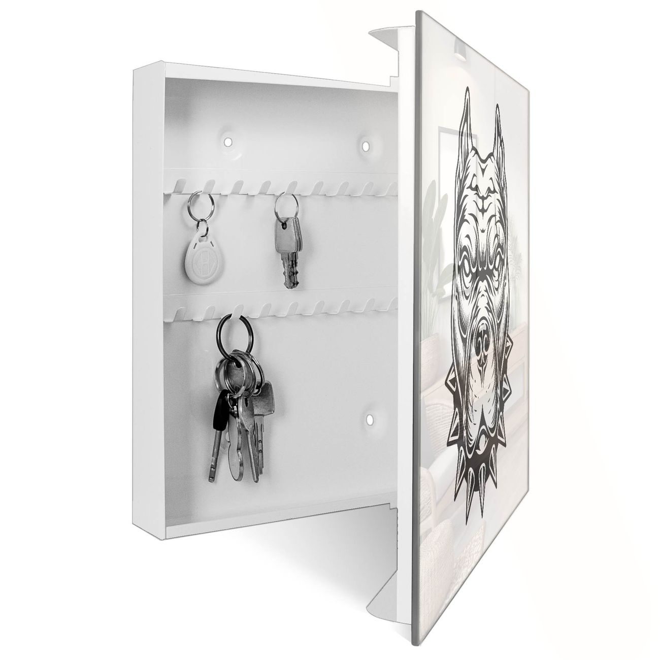 Bringe Ordnung und Eleganz in deinen Eingangsbereich mit dem banjado Schlüsselkasten Motiv Motiv Pitbull Portrait. Die moderne Schlüsselbox kombiniert funktionales Design mit hochwertiger Verarbeitung und wird so zu einem echten Hingucker in Flur, Büro oder Ferienwohnung. ✅ Stilvolle Schlüsselaufbewahrung mit Glasfront im Motiv Motiv Pitbull Portrait Der Design-Schlüsselkasten Motiv Motiv Pitbull Portrait bietet Platz für bis zu 50 Schlüssel, die auf 5 stabilen Reihen mit je 10 Haken übersichtlich verstaut werden. Mit seinen kompakten Maßen von 30 x 30 x 5 cm passt die Schlüsselbox perfekt auch in kleinere Räume. Der weiß lackierte Stahlkorpus mit rechts angeschlagenem Türscharnier harmoniert mit der Glasfront und fügt sich nahtlos in jedes Wohnambiente ein. Ob als Schlüsselorganizer für Zuhause oder als praktische Lösung für Büros, Praxen und Gewerbe, der banjado Schlüsselkasten sorgt für Ordnung und Übersicht. Dank der magnetischen, mit Kreidestiften beschreibbaren Glasfront kannst du Notizen anheften oder Termine direkt auf der Oberfläche festhalten. Die Schlüsselbox Motiv Motiv Pitbull Portrait zur Wandmontage wird inklusive Befestigungsmaterial geliefert und ist schnell angebracht. So hast du deine Schlüssel jederzeit griffbereit und zugleich stilvoll verstaut. Mit diesem banjado Schlüsselkasten Motiv Motiv Pitbull Portrait kombinierst du praktische Aufbewahrung mit stilvollem Wohndesign. Ob privat oder geschäftlich, die Schlüsselbox sorgt für mehr Ordnung, Übersicht und ein wohnliches Ambiente.Vorteile im Überblick