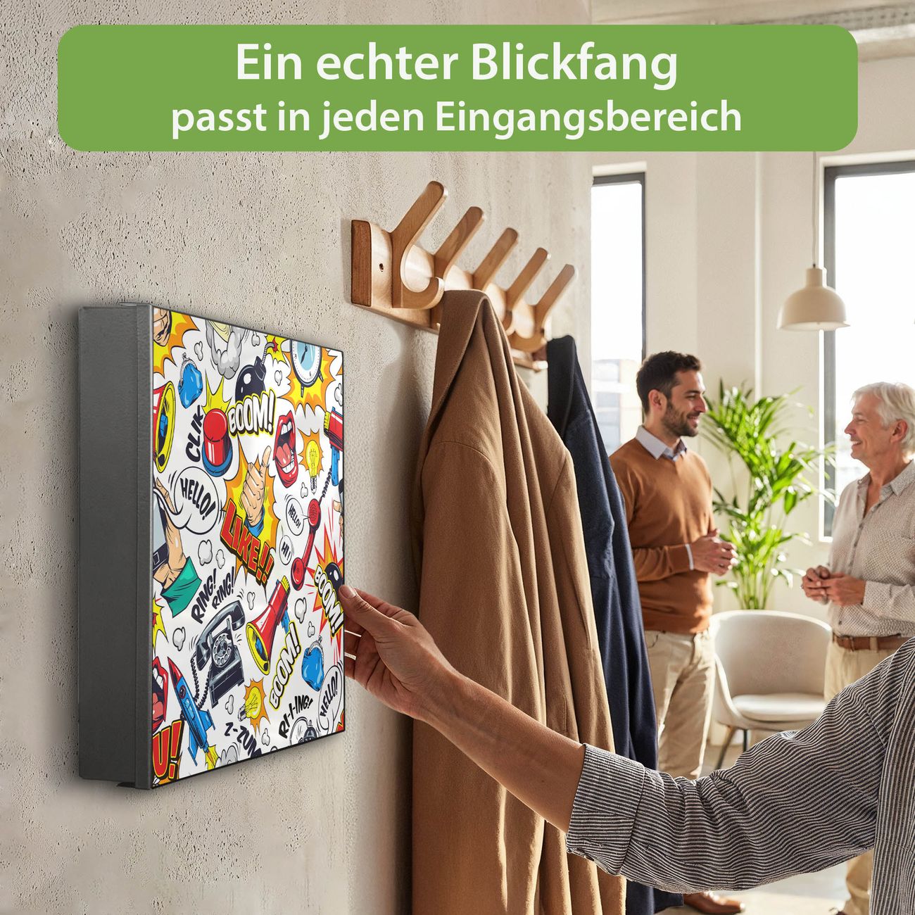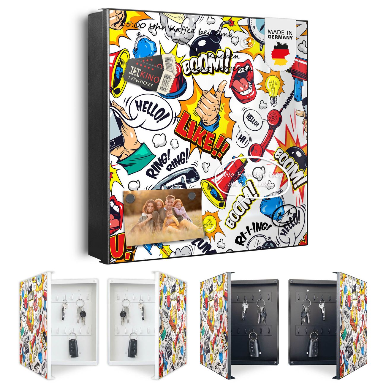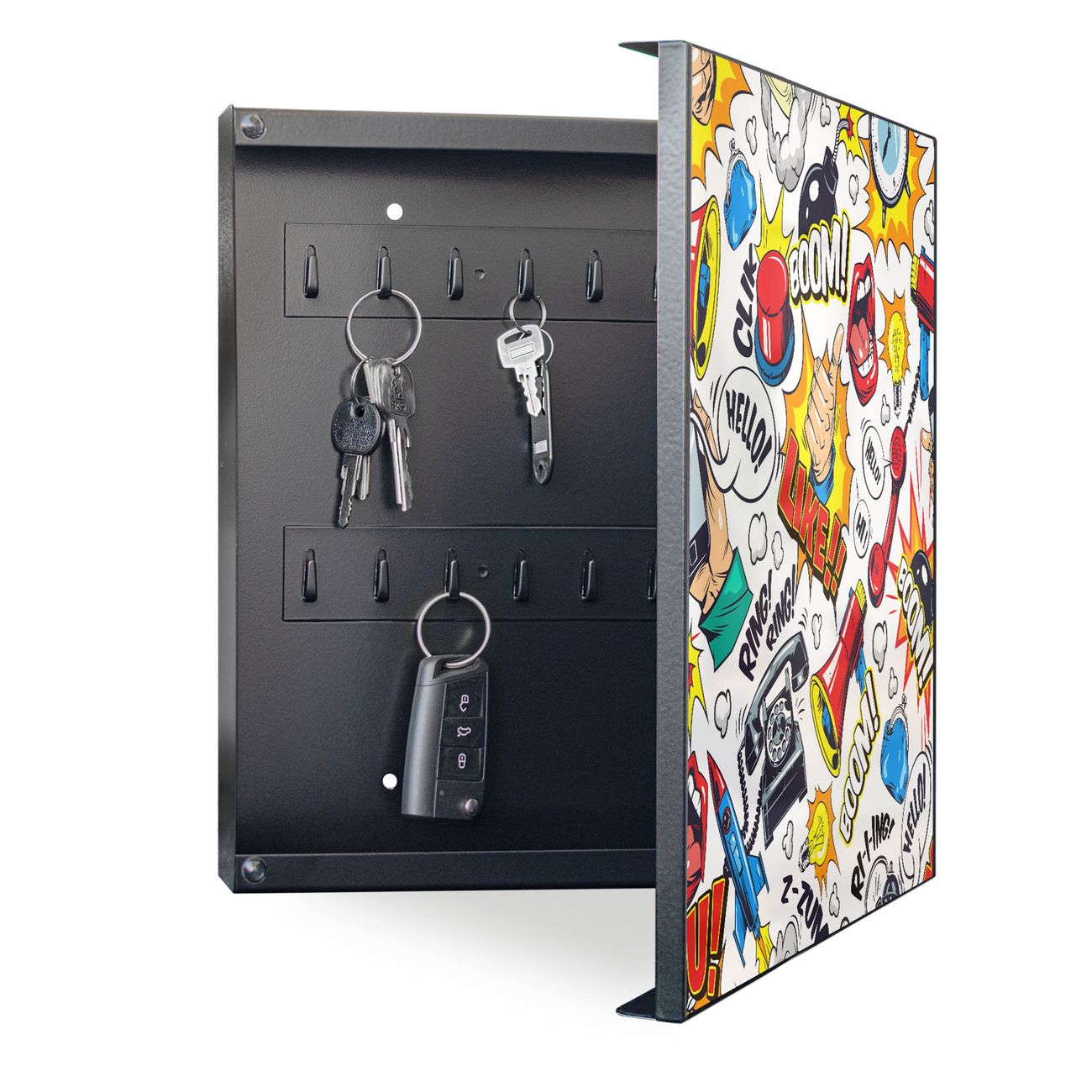 Bringe Ordnung und Eleganz in deinen Eingangsbereich mit dem banjado Schlüsselkasten Motiv Motiv Pop-Art Comic Muster. Die moderne Schlüsselbox kombiniert funktionales Design mit hochwertiger Verarbeitung und wird so zu einem echten Hingucker in Flur, Büro oder Ferienwohnung. ✅ Stilvolle Schlüsselaufbewahrung mit Motiv Motiv Pop-Art Comic Muster Der Design-Schlüsselkasten Motiv Motiv Pop-Art Comic Muster bietet Platz für bis zu 32 Schlüssel, die auf 4 stabilen Reihen mit je 8 Haken übersichtlich verstaut werden. Mit seinen kompakten Maßen von 30 x 30 x 5 cm passt die Schlüsselbox perfekt auch in kleinere Räume. Der schwarz lackierte Stahlkorpus mit rechts angeschlagenem Türscharnier harmoniert mit gedruckten Folie auf der Front und fügt sich nahtlos in jedes Wohnambiente ein. Ob als Schlüsselorganizer für Zuhause oder als praktische Lösung für Büros, Praxen und Gewerbe, der banjado Schlüsselkasten sorgt für Ordnung und Übersicht. Dank der magnetischen, mit Kreidestiften beschreibbaren Folie auf der Front kannst du Notizen anheften oder Termine direkt auf der Oberfläche festhalten. Die Schlüsselbox Motiv Motiv Pop-Art Comic Muster zur Wandmontage wird inklusive Befestigungsmaterial geliefert und ist schnell angebracht. So hast du deine Schlüssel jederzeit griffbereit und zugleich stilvoll verstaut. Mit diesem banjado Schlüsselkasten Motiv Motiv Pop-Art Comic Muster kombinierst du praktische Aufbewahrung mit stilvollem Wohndesign. Ob privat oder geschäftlich, die Schlüsselbox sorgt für mehr Ordnung, Übersicht und ein wohnliches Ambiente.Vorteile im Überblick