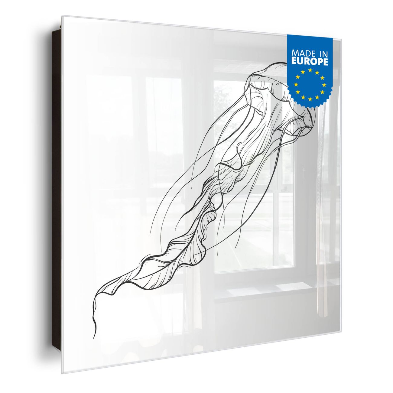 Bringe Ordnung und Eleganz in deinen Eingangsbereich mit dem banjado Schlüsselkasten Motiv Motiv Qualle 4. Die moderne Schlüsselbox kombiniert funktionales Design mit hochwertiger Verarbeitung und wird so zu einem echten Hingucker in Flur, Büro oder Ferienwohnung. ✅ Stilvolle Schlüsselaufbewahrung mit Glasfront im Motiv Motiv Qualle 4 Der Design-Schlüsselkasten Motiv Motiv Qualle 4 bietet Platz für bis zu 50 Schlüssel, die auf 5 stabilen Reihen mit je 10 Haken übersichtlich verstaut werden. Mit seinen kompakten Maßen von 30 x 30 x 5 cm passt die Schlüsselbox perfekt auch in kleinere Räume. Der schwarz lackierte Stahlkorpus mit rechts angeschlagenem Türscharnier harmoniert mit der Glasfront und fügt sich nahtlos in jedes Wohnambiente ein. Ob als Schlüsselorganizer für Zuhause oder als praktische Lösung für Büros, Praxen und Gewerbe, der banjado Schlüsselkasten sorgt für Ordnung und Übersicht. Dank der magnetischen, mit Kreidestiften beschreibbaren Glasfront kannst du Notizen anheften oder Termine direkt auf der Oberfläche festhalten. Die Schlüsselbox Motiv Motiv Qualle 4 zur Wandmontage wird inklusive Befestigungsmaterial geliefert und ist schnell angebracht. So hast du deine Schlüssel jederzeit griffbereit und zugleich stilvoll verstaut. Mit diesem banjado Schlüsselkasten Motiv Motiv Qualle 4 kombinierst du praktische Aufbewahrung mit stilvollem Wohndesign. Ob privat oder geschäftlich, die Schlüsselbox sorgt für mehr Ordnung, Übersicht und ein wohnliches Ambiente.Vorteile im Überblick