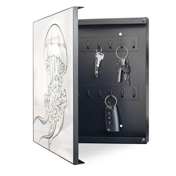 Bringe Ordnung und Eleganz in deinen Eingangsbereich mit dem banjado Schlüsselkasten Motiv Motiv Qualle 6. Die moderne Schlüsselbox kombiniert funktionales Design mit hochwertiger Verarbeitung und wird so zu einem echten Hingucker in Flur, Büro oder Ferienwohnung. ✅ Stilvolle Schlüsselaufbewahrung mit Motiv Motiv Qualle 6 Der Design-Schlüsselkasten Motiv Motiv Qualle 6 bietet Platz für bis zu 32 Schlüssel, die auf 4 stabilen Reihen mit je 8 Haken übersichtlich verstaut werden. Mit seinen kompakten Maßen von 30 x 30 x 5 cm passt die Schlüsselbox perfekt auch in kleinere Räume. Der schwarz lackierte Stahlkorpus mit links angeschlagenem Türscharnier harmoniert mit gedruckten Folie auf der Front und fügt sich nahtlos in jedes Wohnambiente ein. Ob als Schlüsselorganizer für Zuhause oder als praktische Lösung für Büros, Praxen und Gewerbe, der banjado Schlüsselkasten sorgt für Ordnung und Übersicht. Dank der magnetischen, mit Kreidestiften beschreibbaren Folie auf der Front kannst du Notizen anheften oder Termine direkt auf der Oberfläche festhalten. Die Schlüsselbox Motiv Motiv Qualle 6 zur Wandmontage wird inklusive Befestigungsmaterial geliefert und ist schnell angebracht. So hast du deine Schlüssel jederzeit griffbereit und zugleich stilvoll verstaut. Mit diesem banjado Schlüsselkasten Motiv Motiv Qualle 6 kombinierst du praktische Aufbewahrung mit stilvollem Wohndesign. Ob privat oder geschäftlich, die Schlüsselbox sorgt für mehr Ordnung, Übersicht und ein wohnliches Ambiente.Vorteile im Überblick