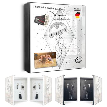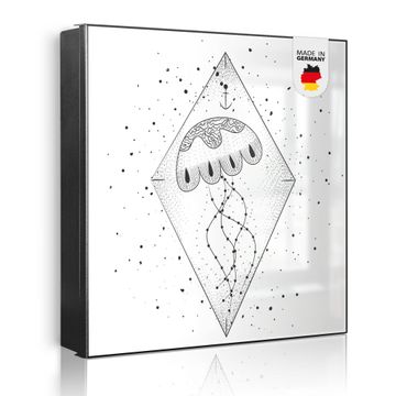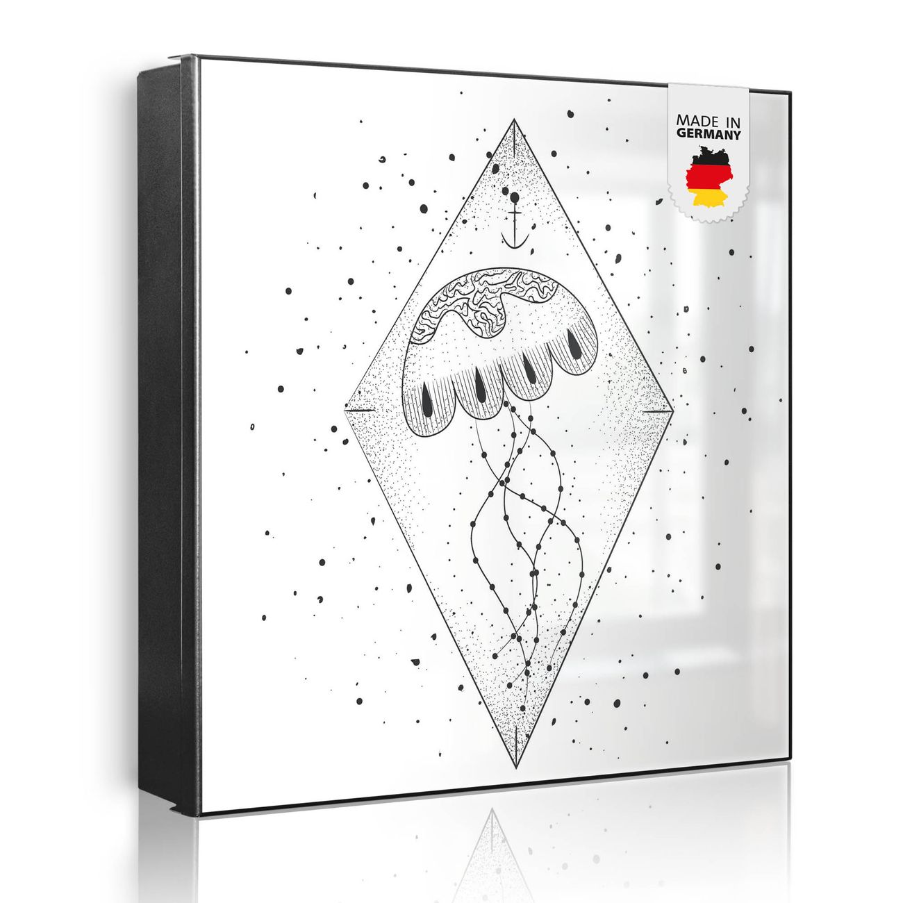 Bringe Ordnung und Eleganz in deinen Eingangsbereich mit dem banjado Schlüsselkasten Motiv Motiv Quallenprisma 2. Die moderne Schlüsselbox kombiniert funktionales Design mit hochwertiger Verarbeitung und wird so zu einem echten Hingucker in Flur, Büro oder Ferienwohnung. ✅ Stilvolle Schlüsselaufbewahrung mit Motiv Motiv Quallenprisma 2 Der Design-Schlüsselkasten Motiv Motiv Quallenprisma 2 bietet Platz für bis zu 32 Schlüssel, die auf 4 stabilen Reihen mit je 8 Haken übersichtlich verstaut werden. Mit seinen kompakten Maßen von 30 x 30 x 5 cm passt die Schlüsselbox perfekt auch in kleinere Räume. Der schwarz lackierte Stahlkorpus mit links angeschlagenem Türscharnier harmoniert mit gedruckten Folie auf der Front und fügt sich nahtlos in jedes Wohnambiente ein. Ob als Schlüsselorganizer für Zuhause oder als praktische Lösung für Büros, Praxen und Gewerbe, der banjado Schlüsselkasten sorgt für Ordnung und Übersicht. Dank der magnetischen, mit Kreidestiften beschreibbaren Folie auf der Front kannst du Notizen anheften oder Termine direkt auf der Oberfläche festhalten. Die Schlüsselbox Motiv Motiv Quallenprisma 2 zur Wandmontage wird inklusive Befestigungsmaterial geliefert und ist schnell angebracht. So hast du deine Schlüssel jederzeit griffbereit und zugleich stilvoll verstaut. Mit diesem banjado Schlüsselkasten Motiv Motiv Quallenprisma 2 kombinierst du praktische Aufbewahrung mit stilvollem Wohndesign. Ob privat oder geschäftlich, die Schlüsselbox sorgt für mehr Ordnung, Übersicht und ein wohnliches Ambiente.Vorteile im Überblick