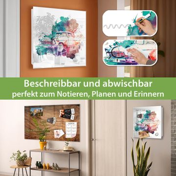 Bringe Ordnung und Eleganz in deinen Eingangsbereich mit dem banjado Schlüsselkasten Motiv Motiv Retro-Auto in Aquarell. Die moderne Schlüsselbox kombiniert funktionales Design mit hochwertiger Verarbeitung und wird so zu einem echten Hingucker in Flur, Büro oder Ferienwohnung. ✅ Stilvolle Schlüsselaufbewahrung mit Glasfront im Motiv Motiv Retro-Auto in Aquarell Der Design-Schlüsselkasten Motiv Motiv Retro-Auto in Aquarell bietet Platz für bis zu 50 Schlüssel, die auf 5 stabilen Reihen mit je 10 Haken übersichtlich verstaut werden. Mit seinen kompakten Maßen von 30 x 30 x 5 cm passt die Schlüsselbox perfekt auch in kleinere Räume. Der weiß lackierte Stahlkorpus mit rechts angeschlagenem Türscharnier harmoniert mit der Glasfront und fügt sich nahtlos in jedes Wohnambiente ein. Ob als Schlüsselorganizer für Zuhause oder als praktische Lösung für Büros, Praxen und Gewerbe, der banjado Schlüsselkasten sorgt für Ordnung und Übersicht. Dank der magnetischen, mit Kreidestiften beschreibbaren Glasfront kannst du Notizen anheften oder Termine direkt auf der Oberfläche festhalten. Die Schlüsselbox Motiv Motiv Retro-Auto in Aquarell zur Wandmontage wird inklusive Befestigungsmaterial geliefert und ist schnell angebracht. So hast du deine Schlüssel jederzeit griffbereit und zugleich stilvoll verstaut. Mit diesem banjado Schlüsselkasten Motiv Motiv Retro-Auto in Aquarell kombinierst du praktische Aufbewahrung mit stilvollem Wohndesign. Ob privat oder geschäftlich, die Schlüsselbox sorgt für mehr Ordnung, Übersicht und ein wohnliches Ambiente.Vorteile im Überblick
