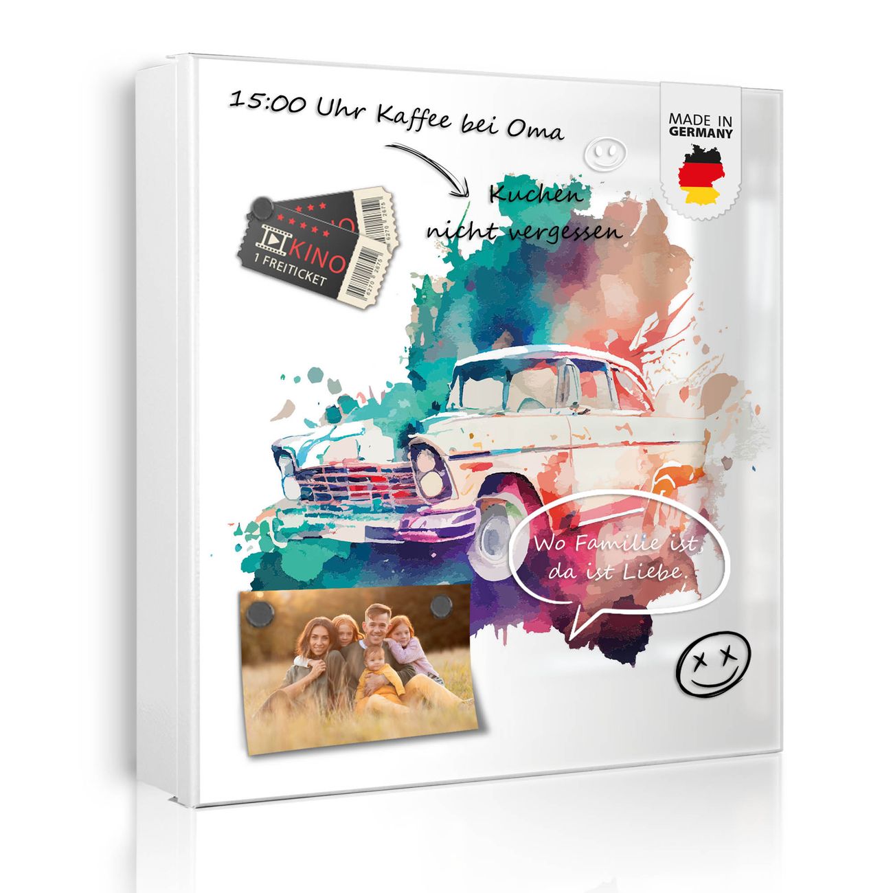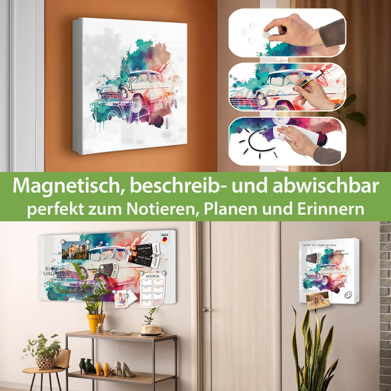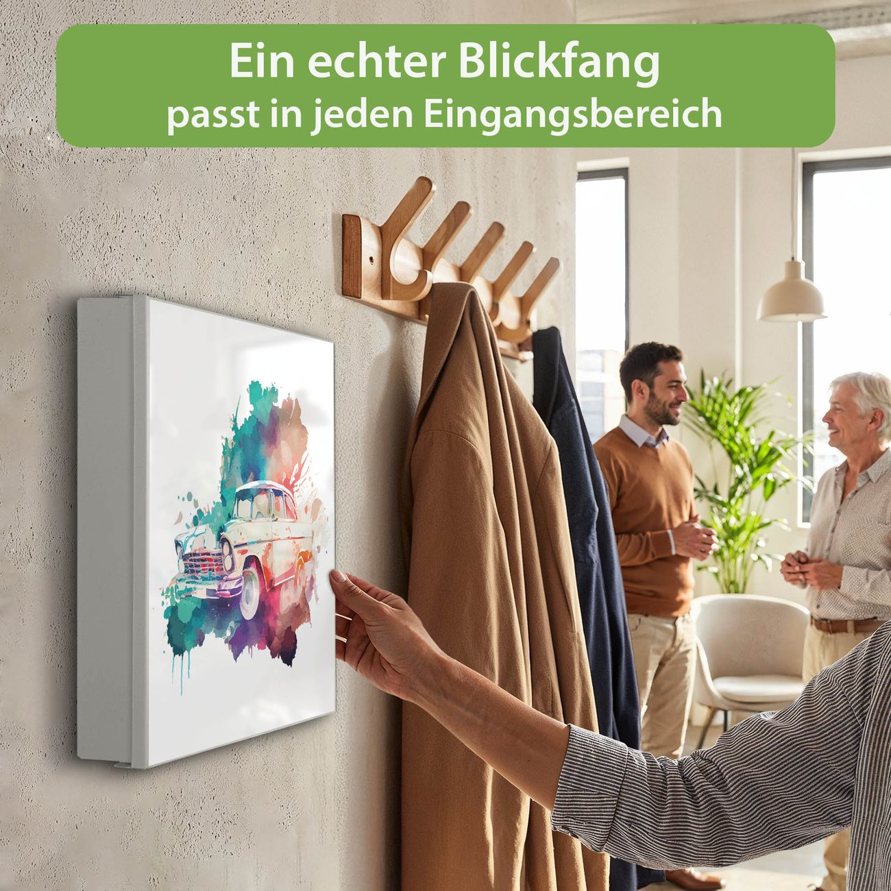 Bringe Ordnung und Eleganz in deinen Eingangsbereich mit dem banjado Schlüsselkasten Motiv Motiv Retro-Auto Aquarell. Die moderne Schlüsselbox kombiniert funktionales Design mit hochwertiger Verarbeitung und wird so zu einem echten Hingucker in Flur, Büro oder Ferienwohnung. ✅ Stilvolle Schlüsselaufbewahrung mit Motiv Motiv Retro-Auto Aquarell Der Design-Schlüsselkasten Motiv Motiv Retro-Auto Aquarell bietet Platz für bis zu 32 Schlüssel, die auf 4 stabilen Reihen mit je 8 Haken übersichtlich verstaut werden. Mit seinen kompakten Maßen von 30 x 30 x 5 cm passt die Schlüsselbox perfekt auch in kleinere Räume. Der weiß lackierte Stahlkorpus mit links angeschlagenem Türscharnier harmoniert mit gedruckten Folie auf der Front und fügt sich nahtlos in jedes Wohnambiente ein. Ob als Schlüsselorganizer für Zuhause oder als praktische Lösung für Büros, Praxen und Gewerbe, der banjado Schlüsselkasten sorgt für Ordnung und Übersicht. Dank der magnetischen, mit Kreidestiften beschreibbaren Folie auf der Front kannst du Notizen anheften oder Termine direkt auf der Oberfläche festhalten. Die Schlüsselbox Motiv Motiv Retro-Auto Aquarell zur Wandmontage wird inklusive Befestigungsmaterial geliefert und ist schnell angebracht. So hast du deine Schlüssel jederzeit griffbereit und zugleich stilvoll verstaut. Mit diesem banjado Schlüsselkasten Motiv Motiv Retro-Auto Aquarell kombinierst du praktische Aufbewahrung mit stilvollem Wohndesign. Ob privat oder geschäftlich, die Schlüsselbox sorgt für mehr Ordnung, Übersicht und ein wohnliches Ambiente.Vorteile im Überblick