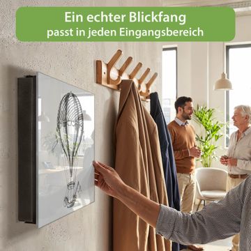 Bringe Ordnung und Eleganz in deinen Eingangsbereich mit dem banjado Schlüsselkasten Motiv Motiv Retro Heißluftballon. Die moderne Schlüsselbox kombiniert funktionales Design mit hochwertiger Verarbeitung und wird so zu einem echten Hingucker in Flur, Büro oder Ferienwohnung. ✅ Stilvolle Schlüsselaufbewahrung mit Glasfront im Motiv Motiv Retro Heißluftballon Der Design-Schlüsselkasten Motiv Motiv Retro Heißluftballon bietet Platz für bis zu 50 Schlüssel, die auf 5 stabilen Reihen mit je 10 Haken übersichtlich verstaut werden. Mit seinen kompakten Maßen von 30 x 30 x 5 cm passt die Schlüsselbox perfekt auch in kleinere Räume. Der schwarz lackierte Stahlkorpus mit rechts angeschlagenem Türscharnier harmoniert mit der Glasfront und fügt sich nahtlos in jedes Wohnambiente ein. Ob als Schlüsselorganizer für Zuhause oder als praktische Lösung für Büros, Praxen und Gewerbe, der banjado Schlüsselkasten sorgt für Ordnung und Übersicht. Dank der magnetischen, mit Kreidestiften beschreibbaren Glasfront kannst du Notizen anheften oder Termine direkt auf der Oberfläche festhalten. Die Schlüsselbox Motiv Motiv Retro Heißluftballon zur Wandmontage wird inklusive Befestigungsmaterial geliefert und ist schnell angebracht. So hast du deine Schlüssel jederzeit griffbereit und zugleich stilvoll verstaut. Mit diesem banjado Schlüsselkasten Motiv Motiv Retro Heißluftballon kombinierst du praktische Aufbewahrung mit stilvollem Wohndesign. Ob privat oder geschäftlich, die Schlüsselbox sorgt für mehr Ordnung, Übersicht und ein wohnliches Ambiente.Vorteile im Überblick