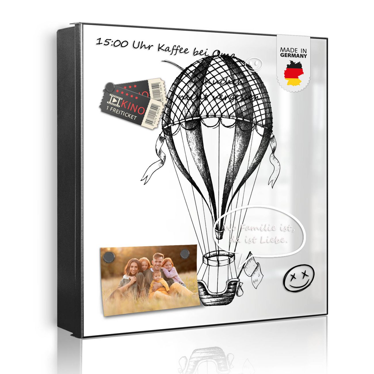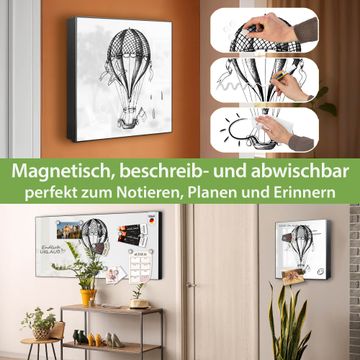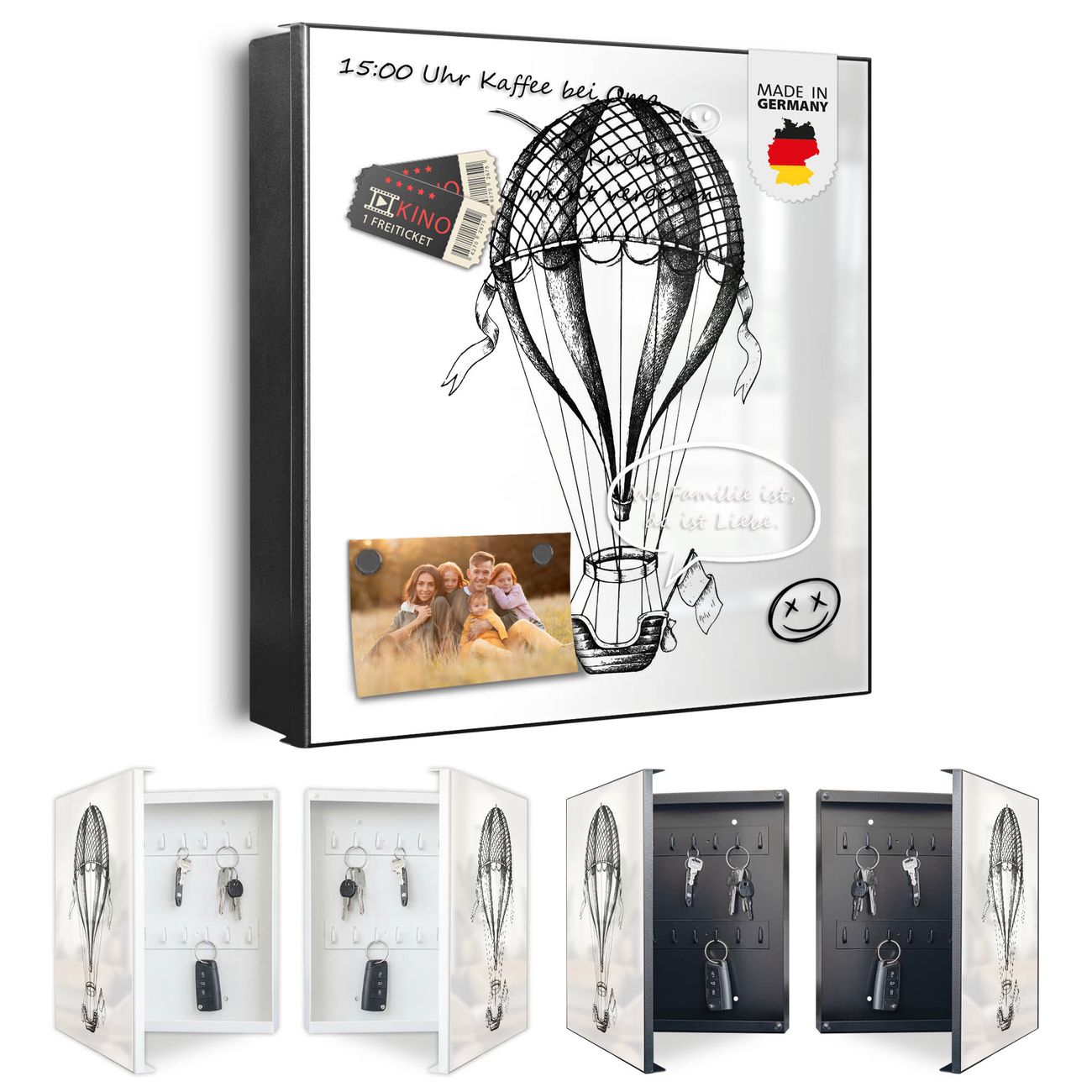 Bringe Ordnung und Eleganz in deinen Eingangsbereich mit dem banjado Schlüsselkasten Motiv Motiv Retro Heißluftballon. Die moderne Schlüsselbox kombiniert funktionales Design mit hochwertiger Verarbeitung und wird so zu einem echten Hingucker in Flur, Büro oder Ferienwohnung. ✅ Stilvolle Schlüsselaufbewahrung mit Motiv Motiv Retro Heißluftballon Der Design-Schlüsselkasten Motiv Motiv Retro Heißluftballon bietet Platz für bis zu 32 Schlüssel, die auf 4 stabilen Reihen mit je 8 Haken übersichtlich verstaut werden. Mit seinen kompakten Maßen von 30 x 30 x 5 cm passt die Schlüsselbox perfekt auch in kleinere Räume. Der schwarz lackierte Stahlkorpus mit links angeschlagenem Türscharnier harmoniert mit gedruckten Folie auf der Front und fügt sich nahtlos in jedes Wohnambiente ein. Ob als Schlüsselorganizer für Zuhause oder als praktische Lösung für Büros, Praxen und Gewerbe, der banjado Schlüsselkasten sorgt für Ordnung und Übersicht. Dank der magnetischen, mit Kreidestiften beschreibbaren Folie auf der Front kannst du Notizen anheften oder Termine direkt auf der Oberfläche festhalten. Die Schlüsselbox Motiv Motiv Retro Heißluftballon zur Wandmontage wird inklusive Befestigungsmaterial geliefert und ist schnell angebracht. So hast du deine Schlüssel jederzeit griffbereit und zugleich stilvoll verstaut. Mit diesem banjado Schlüsselkasten Motiv Motiv Retro Heißluftballon kombinierst du praktische Aufbewahrung mit stilvollem Wohndesign. Ob privat oder geschäftlich, die Schlüsselbox sorgt für mehr Ordnung, Übersicht und ein wohnliches Ambiente.Vorteile im Überblick