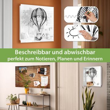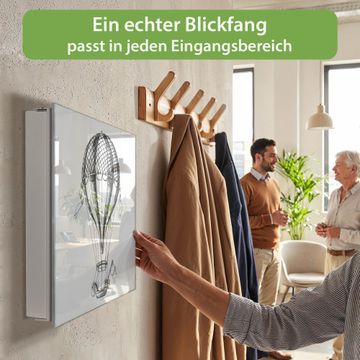 Bringe Ordnung und Eleganz in deinen Eingangsbereich mit dem banjado Schlüsselkasten Motiv Motiv Retro Heißluftballon. Die moderne Schlüsselbox kombiniert funktionales Design mit hochwertiger Verarbeitung und wird so zu einem echten Hingucker in Flur, Büro oder Ferienwohnung. ✅ Stilvolle Schlüsselaufbewahrung mit Glasfront im Motiv Motiv Retro Heißluftballon Der Design-Schlüsselkasten Motiv Motiv Retro Heißluftballon bietet Platz für bis zu 50 Schlüssel, die auf 5 stabilen Reihen mit je 10 Haken übersichtlich verstaut werden. Mit seinen kompakten Maßen von 30 x 30 x 5 cm passt die Schlüsselbox perfekt auch in kleinere Räume. Der weiß lackierte Stahlkorpus mit rechts angeschlagenem Türscharnier harmoniert mit der Glasfront und fügt sich nahtlos in jedes Wohnambiente ein. Ob als Schlüsselorganizer für Zuhause oder als praktische Lösung für Büros, Praxen und Gewerbe, der banjado Schlüsselkasten sorgt für Ordnung und Übersicht. Dank der magnetischen, mit Kreidestiften beschreibbaren Glasfront kannst du Notizen anheften oder Termine direkt auf der Oberfläche festhalten. Die Schlüsselbox Motiv Motiv Retro Heißluftballon zur Wandmontage wird inklusive Befestigungsmaterial geliefert und ist schnell angebracht. So hast du deine Schlüssel jederzeit griffbereit und zugleich stilvoll verstaut. Mit diesem banjado Schlüsselkasten Motiv Motiv Retro Heißluftballon kombinierst du praktische Aufbewahrung mit stilvollem Wohndesign. Ob privat oder geschäftlich, die Schlüsselbox sorgt für mehr Ordnung, Übersicht und ein wohnliches Ambiente.Vorteile im Überblick
