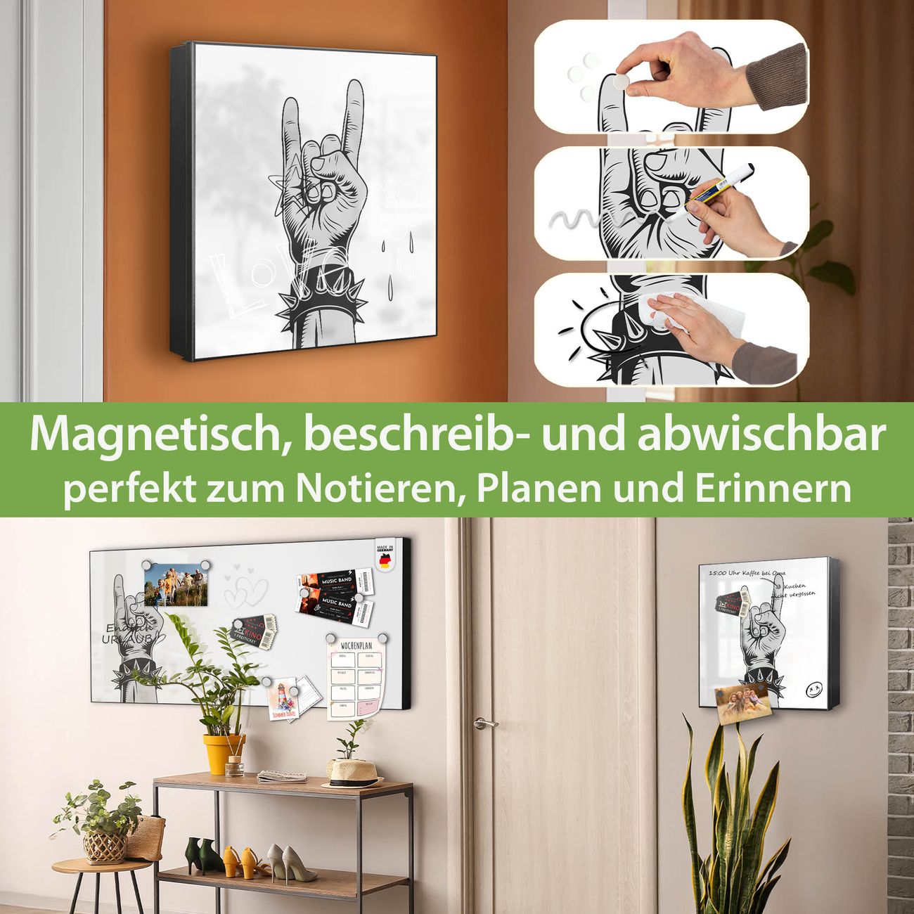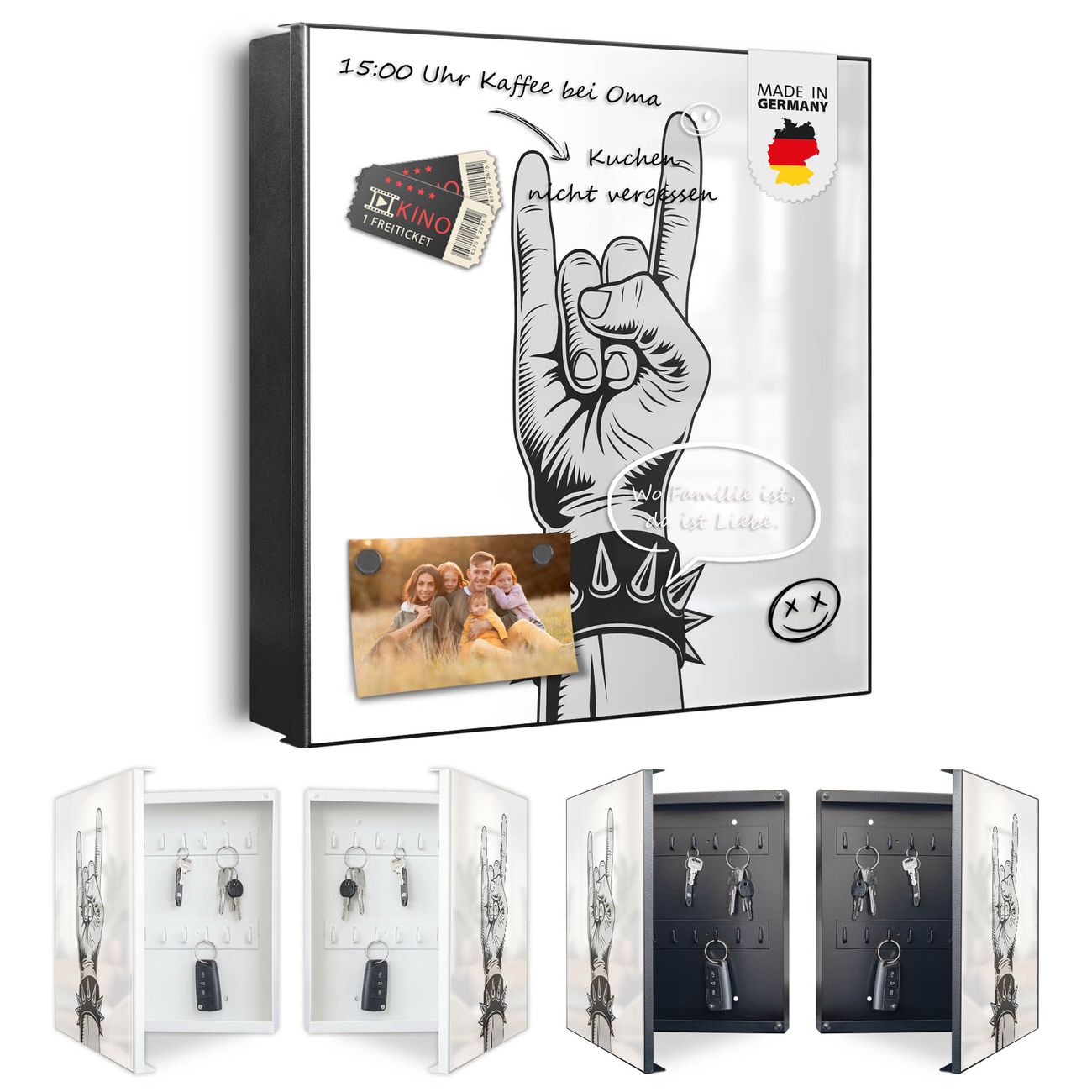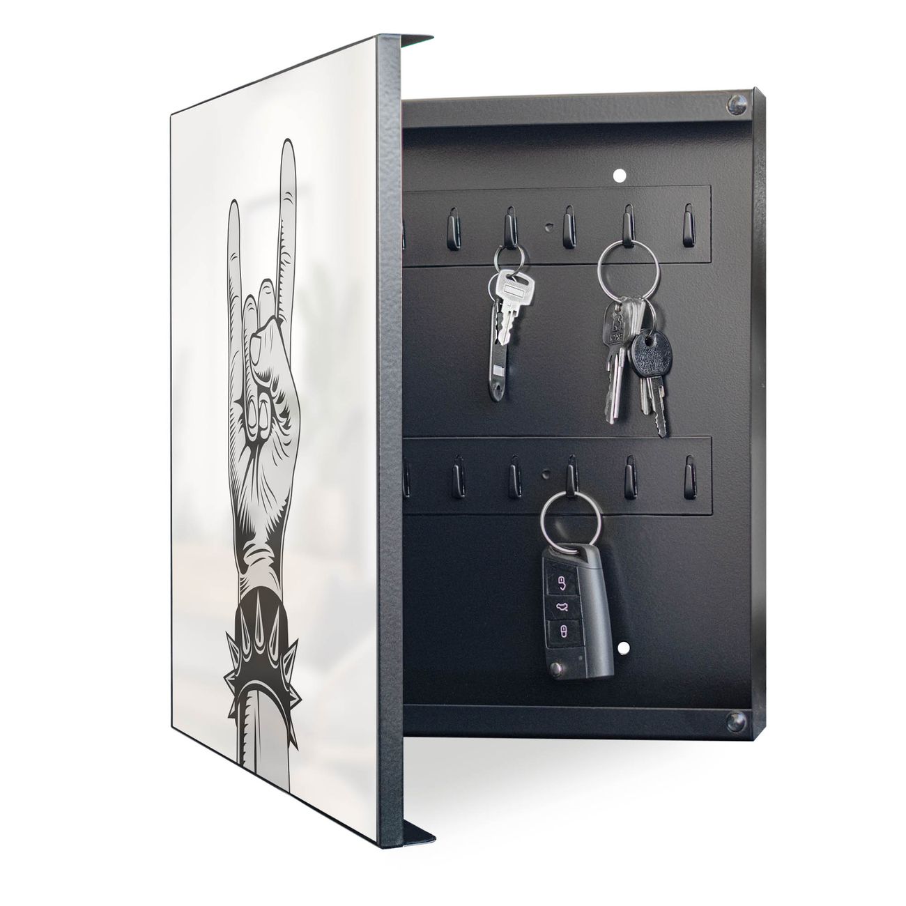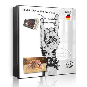 Bringe Ordnung und Eleganz in deinen Eingangsbereich mit dem banjado Schlüsselkasten Motiv Motiv Rockgruß. Die moderne Schlüsselbox kombiniert funktionales Design mit hochwertiger Verarbeitung und wird so zu einem echten Hingucker in Flur, Büro oder Ferienwohnung. ✅ Stilvolle Schlüsselaufbewahrung mit Motiv Motiv Rockgruß Der Design-Schlüsselkasten Motiv Motiv Rockgruß bietet Platz für bis zu 32 Schlüssel, die auf 4 stabilen Reihen mit je 8 Haken übersichtlich verstaut werden. Mit seinen kompakten Maßen von 30 x 30 x 5 cm passt die Schlüsselbox perfekt auch in kleinere Räume. Der schwarz lackierte Stahlkorpus mit links angeschlagenem Türscharnier harmoniert mit gedruckten Folie auf der Front und fügt sich nahtlos in jedes Wohnambiente ein. Ob als Schlüsselorganizer für Zuhause oder als praktische Lösung für Büros, Praxen und Gewerbe, der banjado Schlüsselkasten sorgt für Ordnung und Übersicht. Dank der magnetischen, mit Kreidestiften beschreibbaren Folie auf der Front kannst du Notizen anheften oder Termine direkt auf der Oberfläche festhalten. Die Schlüsselbox Motiv Motiv Rockgruß zur Wandmontage wird inklusive Befestigungsmaterial geliefert und ist schnell angebracht. So hast du deine Schlüssel jederzeit griffbereit und zugleich stilvoll verstaut. Mit diesem banjado Schlüsselkasten Motiv Motiv Rockgruß kombinierst du praktische Aufbewahrung mit stilvollem Wohndesign. Ob privat oder geschäftlich, die Schlüsselbox sorgt für mehr Ordnung, Übersicht und ein wohnliches Ambiente.Vorteile im Überblick