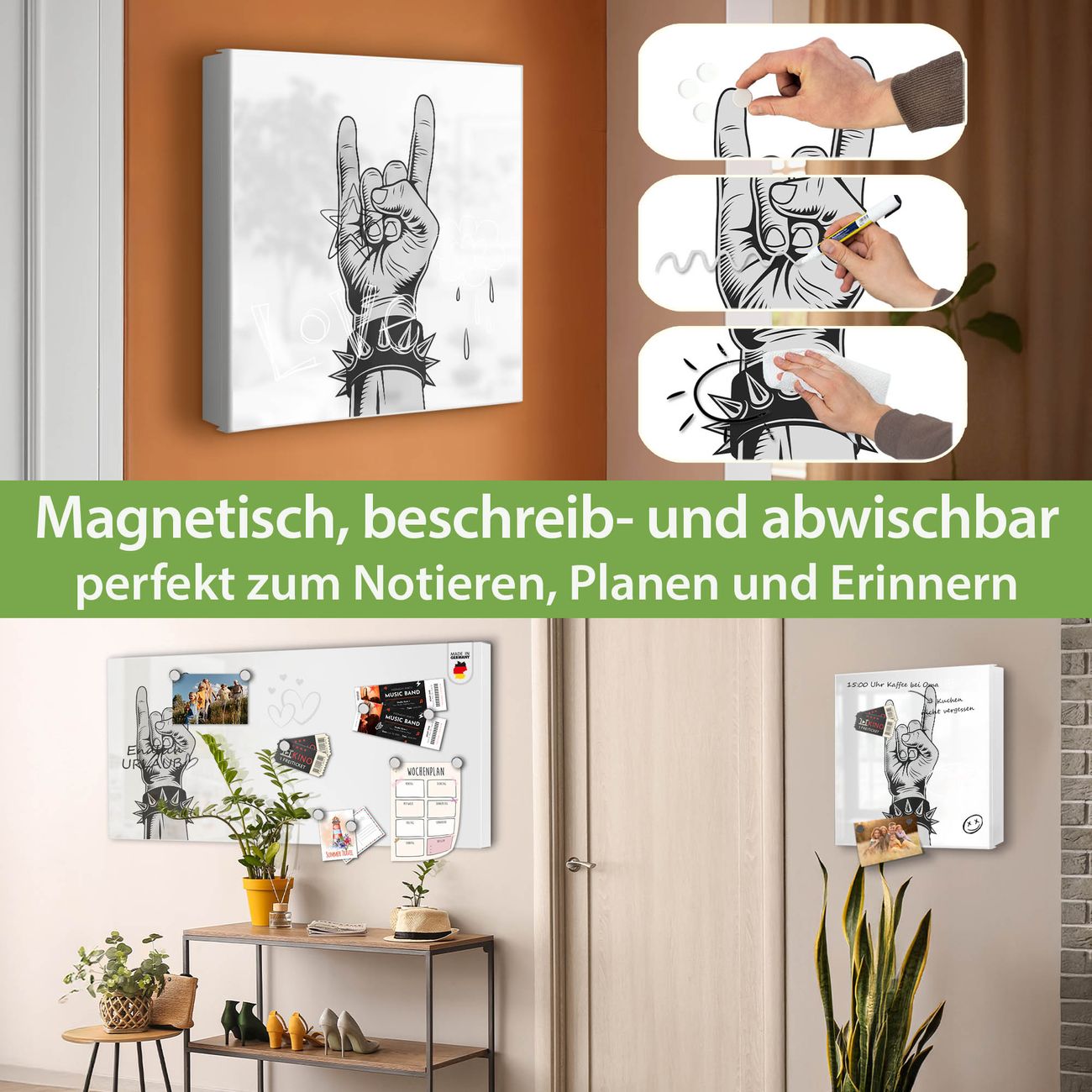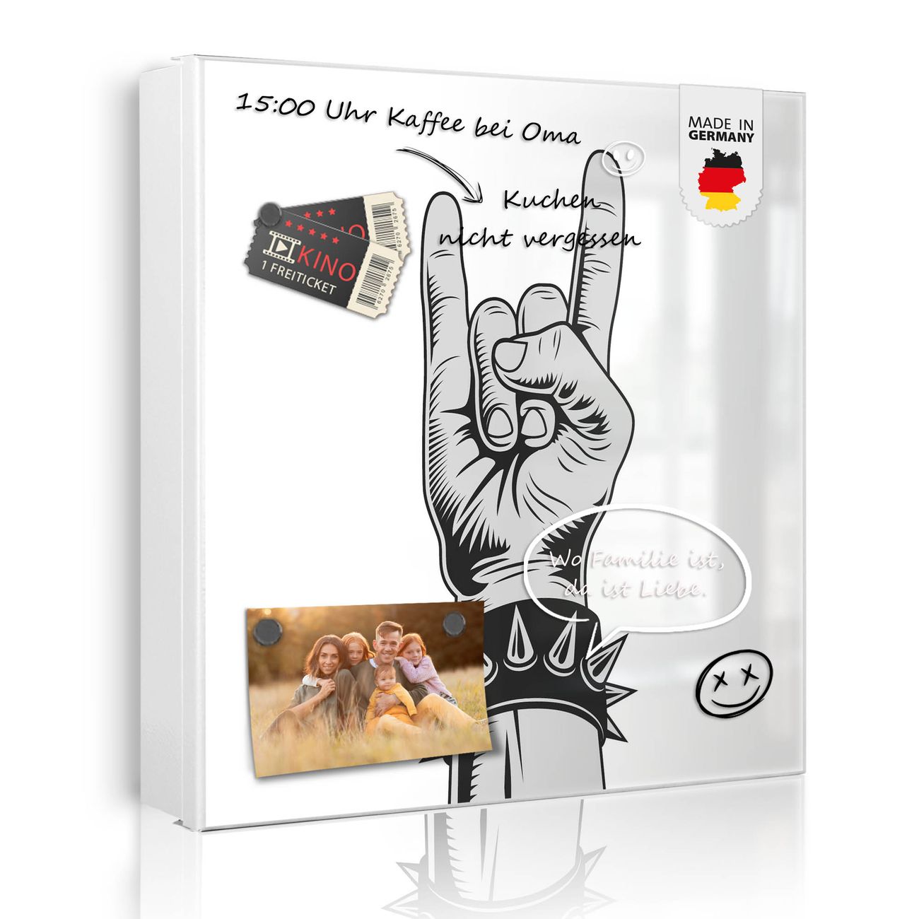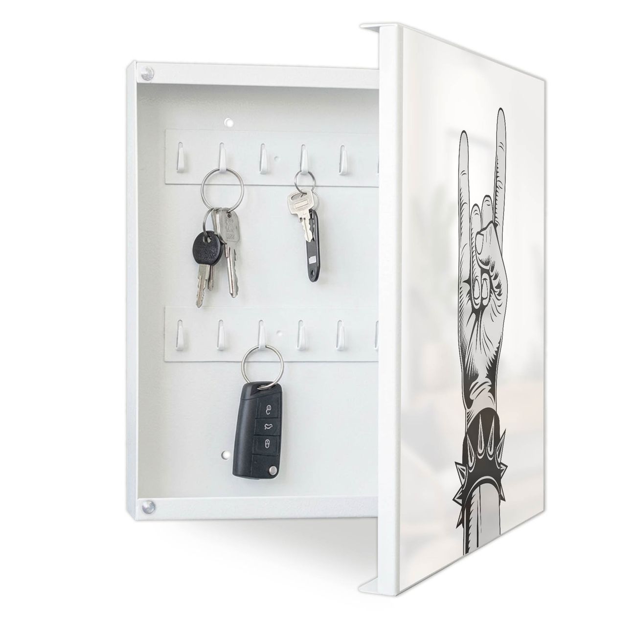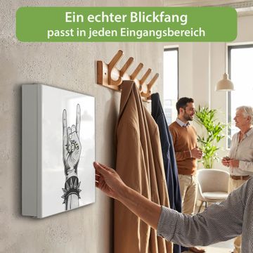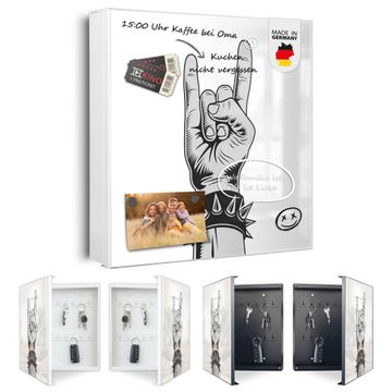Bringe Ordnung und Eleganz in deinen Eingangsbereich mit dem banjado Schlüsselkasten Motiv Motiv Rockgruß. Die moderne Schlüsselbox kombiniert funktionales Design mit hochwertiger Verarbeitung und wird so zu einem echten Hingucker in Flur, Büro oder Ferienwohnung. ✅ Stilvolle Schlüsselaufbewahrung mit Motiv Motiv Rockgruß Der Design-Schlüsselkasten Motiv Motiv Rockgruß bietet Platz für bis zu 32 Schlüssel, die auf 4 stabilen Reihen mit je 8 Haken übersichtlich verstaut werden. Mit seinen kompakten Maßen von 30 x 30 x 5 cm passt die Schlüsselbox perfekt auch in kleinere Räume. Der weiß lackierte Stahlkorpus mit rechts angeschlagenem Türscharnier harmoniert mit gedruckten Folie auf der Front und fügt sich nahtlos in jedes Wohnambiente ein. Ob als Schlüsselorganizer für Zuhause oder als praktische Lösung für Büros, Praxen und Gewerbe, der banjado Schlüsselkasten sorgt für Ordnung und Übersicht. Dank der magnetischen, mit Kreidestiften beschreibbaren Folie auf der Front kannst du Notizen anheften oder Termine direkt auf der Oberfläche festhalten. Die Schlüsselbox Motiv Motiv Rockgruß zur Wandmontage wird inklusive Befestigungsmaterial geliefert und ist schnell angebracht. So hast du deine Schlüssel jederzeit griffbereit und zugleich stilvoll verstaut. Mit diesem banjado Schlüsselkasten Motiv Motiv Rockgruß kombinierst du praktische Aufbewahrung mit stilvollem Wohndesign. Ob privat oder geschäftlich, die Schlüsselbox sorgt für mehr Ordnung, Übersicht und ein wohnliches Ambiente.Vorteile im Überblick
