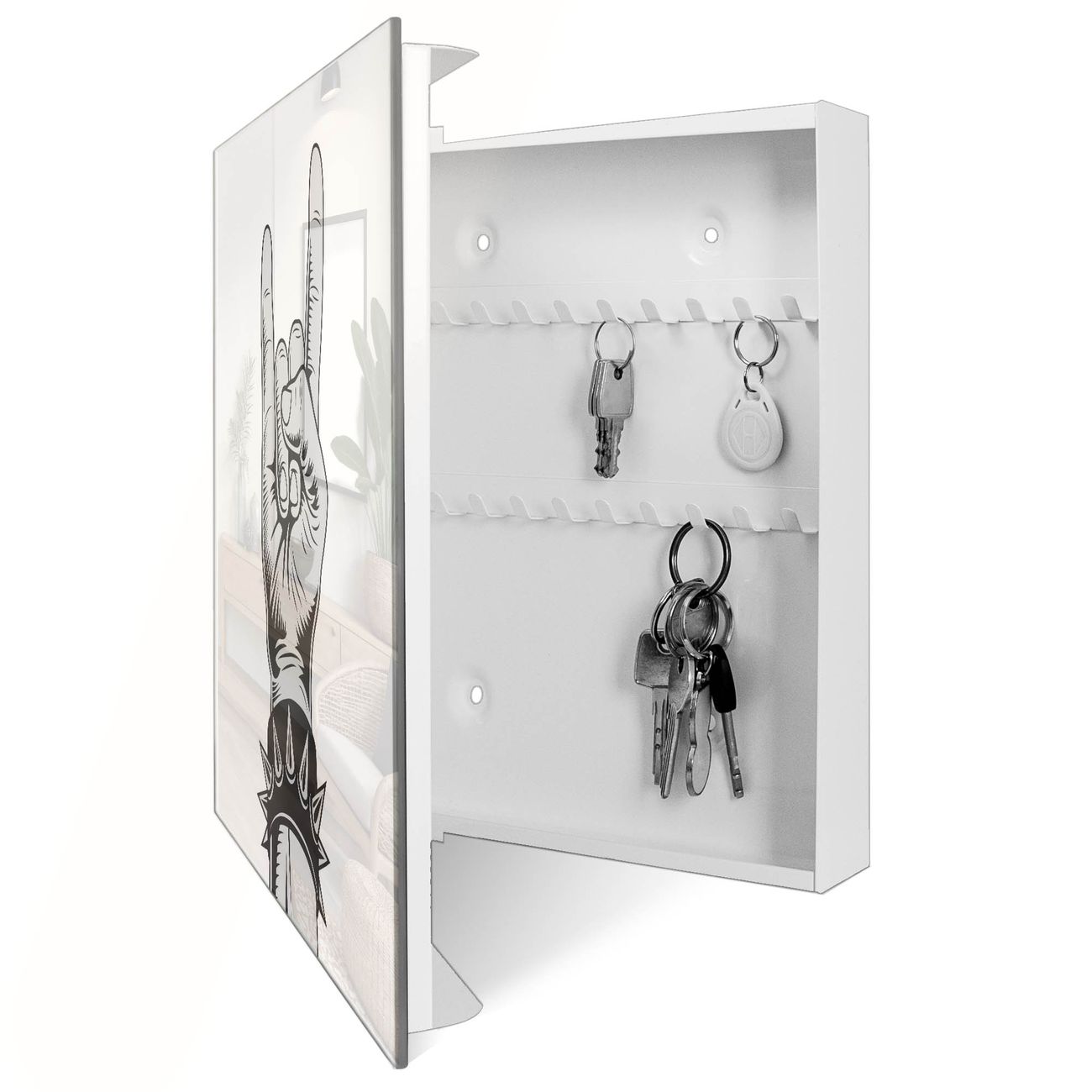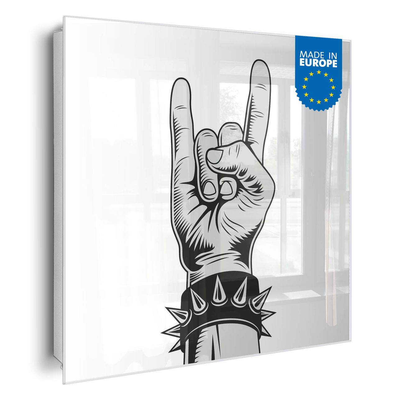Bringe Ordnung und Eleganz in deinen Eingangsbereich mit dem banjado Schlüsselkasten Motiv Motiv Rockgruß. Die moderne Schlüsselbox kombiniert funktionales Design mit hochwertiger Verarbeitung und wird so zu einem echten Hingucker in Flur, Büro oder Ferienwohnung. ✅ Stilvolle Schlüsselaufbewahrung mit Glasfront im Motiv Motiv Rockgruß Der Design-Schlüsselkasten Motiv Motiv Rockgruß bietet Platz für bis zu 50 Schlüssel, die auf 5 stabilen Reihen mit je 10 Haken übersichtlich verstaut werden. Mit seinen kompakten Maßen von 30 x 30 x 5 cm passt die Schlüsselbox perfekt auch in kleinere Räume. Der weiß lackierte Stahlkorpus mit rechts angeschlagenem Türscharnier harmoniert mit der Glasfront und fügt sich nahtlos in jedes Wohnambiente ein. Ob als Schlüsselorganizer für Zuhause oder als praktische Lösung für Büros, Praxen und Gewerbe, der banjado Schlüsselkasten sorgt für Ordnung und Übersicht. Dank der magnetischen, mit Kreidestiften beschreibbaren Glasfront kannst du Notizen anheften oder Termine direkt auf der Oberfläche festhalten. Die Schlüsselbox Motiv Motiv Rockgruß zur Wandmontage wird inklusive Befestigungsmaterial geliefert und ist schnell angebracht. So hast du deine Schlüssel jederzeit griffbereit und zugleich stilvoll verstaut. Mit diesem banjado Schlüsselkasten Motiv Motiv Rockgruß kombinierst du praktische Aufbewahrung mit stilvollem Wohndesign. Ob privat oder geschäftlich, die Schlüsselbox sorgt für mehr Ordnung, Übersicht und ein wohnliches Ambiente.Vorteile im Überblick