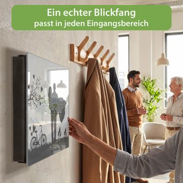 Bringe Ordnung und Eleganz in deinen Eingangsbereich mit dem banjado Schlüsselkasten Motiv Motiv Romantische Silhouette. Die moderne Schlüsselbox kombiniert funktionales Design mit hochwertiger Verarbeitung und wird so zu einem echten Hingucker in Flur, Büro oder Ferienwohnung. ✅ Stilvolle Schlüsselaufbewahrung mit Glasfront im Motiv Motiv Romantische Silhouette Der Design-Schlüsselkasten Motiv Motiv Romantische Silhouette bietet Platz für bis zu 50 Schlüssel, die auf 5 stabilen Reihen mit je 10 Haken übersichtlich verstaut werden. Mit seinen kompakten Maßen von 30 x 30 x 5 cm passt die Schlüsselbox perfekt auch in kleinere Räume. Der schwarz lackierte Stahlkorpus mit rechts angeschlagenem Türscharnier harmoniert mit der Glasfront und fügt sich nahtlos in jedes Wohnambiente ein. Ob als Schlüsselorganizer für Zuhause oder als praktische Lösung für Büros, Praxen und Gewerbe, der banjado Schlüsselkasten sorgt für Ordnung und Übersicht. Dank der magnetischen, mit Kreidestiften beschreibbaren Glasfront kannst du Notizen anheften oder Termine direkt auf der Oberfläche festhalten. Die Schlüsselbox Motiv Motiv Romantische Silhouette zur Wandmontage wird inklusive Befestigungsmaterial geliefert und ist schnell angebracht. So hast du deine Schlüssel jederzeit griffbereit und zugleich stilvoll verstaut. Mit diesem banjado Schlüsselkasten Motiv Motiv Romantische Silhouette kombinierst du praktische Aufbewahrung mit stilvollem Wohndesign. Ob privat oder geschäftlich, die Schlüsselbox sorgt für mehr Ordnung, Übersicht und ein wohnliches Ambiente.Vorteile im Überblick