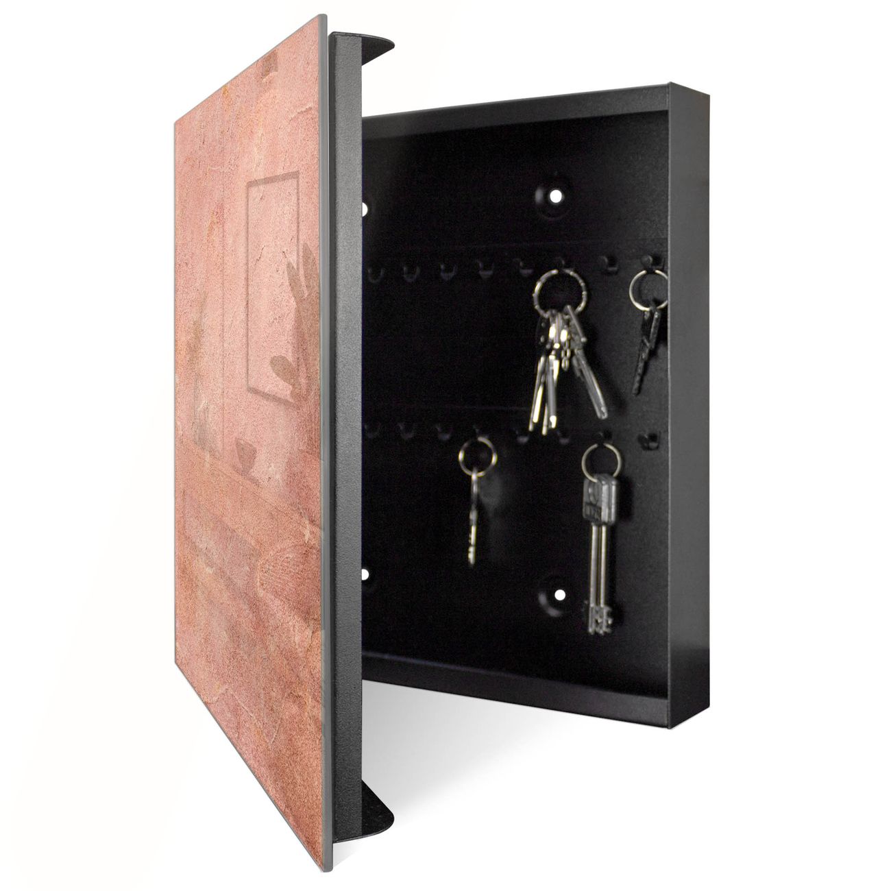 Bringe Ordnung und Eleganz in deinen Eingangsbereich mit dem banjado Schlüsselkasten Motiv Rosa Putz. Die moderne Schlüsselbox kombiniert funktionales Design mit hochwertiger Verarbeitung und wird so zu einem echten Hingucker in Flur, Büro oder Ferienwohnung. ✅ Stilvolle Schlüsselaufbewahrung mit Glasfront im Motiv Motiv Rosa Putz Der Design-Schlüsselkasten Motiv Rosa Putz bietet Platz für bis zu 50 Schlüssel, die auf 5 stabilen Reihen mit je 10 Haken übersichtlich verstaut werden. Mit seinen kompakten Maßen von 30 x 30 x 5 cm passt die Schlüsselbox perfekt auch in kleinere Räume. Der schwarz lackierte Stahlkorpus mit rechts angeschlagenem Türscharnier harmoniert mit der Glasfront und fügt sich nahtlos in jedes Wohnambiente ein. Ob als Schlüsselorganizer für Zuhause oder als praktische Lösung für Büros, Praxen und Gewerbe, der banjado Schlüsselkasten sorgt für Ordnung und Übersicht. Dank der magnetischen, mit Kreidestiften beschreibbaren Glasfront kannst du Notizen anheften oder Termine direkt auf der Oberfläche festhalten. Die Schlüsselbox Motiv Rosa Putz zur Wandmontage wird inklusive Befestigungsmaterial geliefert und ist schnell angebracht. So hast du deine Schlüssel jederzeit griffbereit und zugleich stilvoll verstaut. Mit diesem banjado Schlüsselkasten Motiv Rosa Putz kombinierst du praktische Aufbewahrung mit stilvollem Wohndesign. Ob privat oder geschäftlich, die Schlüsselbox sorgt für mehr Ordnung, Übersicht und ein wohnliches Ambiente.Vorteile im Überblick