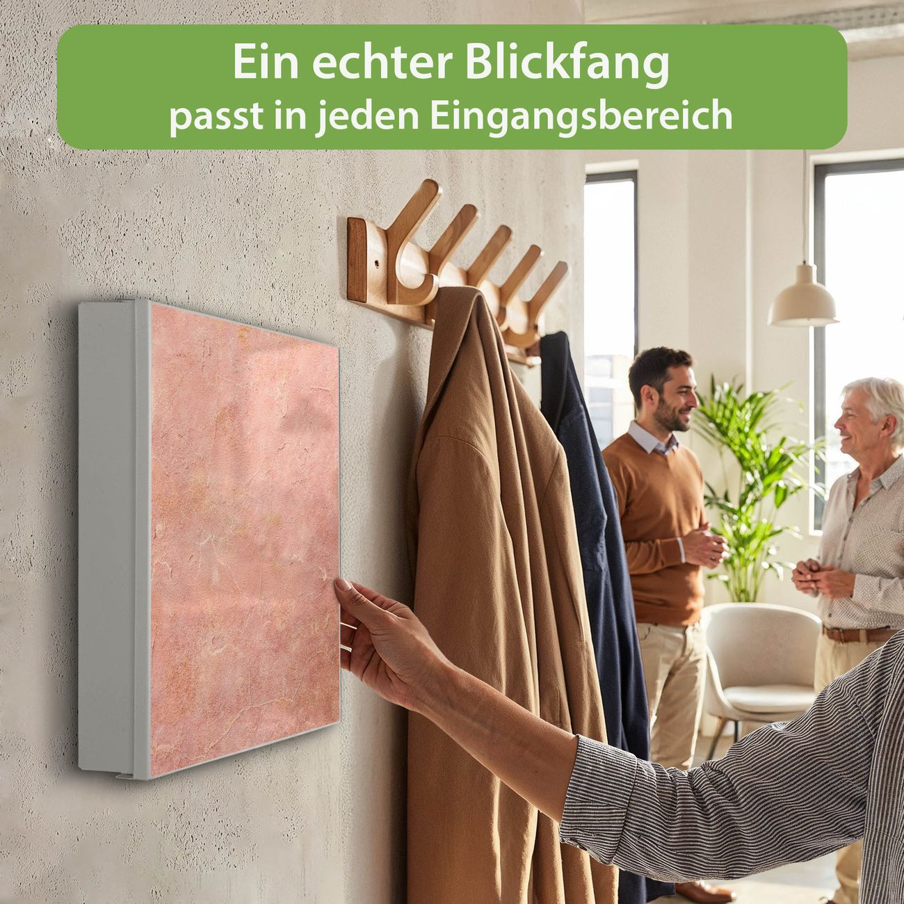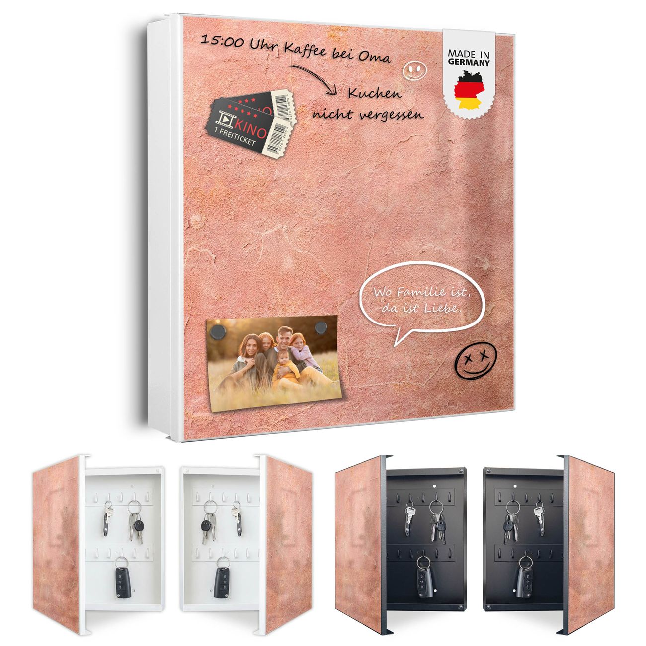 Bringe Ordnung und Eleganz in deinen Eingangsbereich mit dem banjado Schlüsselkasten Motiv Motiv Rosa Putz. Die moderne Schlüsselbox kombiniert funktionales Design mit hochwertiger Verarbeitung und wird so zu einem echten Hingucker in Flur, Büro oder Ferienwohnung. ✅ Stilvolle Schlüsselaufbewahrung mit Motiv Motiv Rosa Putz Der Design-Schlüsselkasten Motiv Motiv Rosa Putz bietet Platz für bis zu 32 Schlüssel, die auf 4 stabilen Reihen mit je 8 Haken übersichtlich verstaut werden. Mit seinen kompakten Maßen von 30 x 30 x 5 cm passt die Schlüsselbox perfekt auch in kleinere Räume. Der weiß lackierte Stahlkorpus mit links angeschlagenem Türscharnier harmoniert mit gedruckten Folie auf der Front und fügt sich nahtlos in jedes Wohnambiente ein. Ob als Schlüsselorganizer für Zuhause oder als praktische Lösung für Büros, Praxen und Gewerbe, der banjado Schlüsselkasten sorgt für Ordnung und Übersicht. Dank der magnetischen, mit Kreidestiften beschreibbaren Folie auf der Front kannst du Notizen anheften oder Termine direkt auf der Oberfläche festhalten. Die Schlüsselbox Motiv Motiv Rosa Putz zur Wandmontage wird inklusive Befestigungsmaterial geliefert und ist schnell angebracht. So hast du deine Schlüssel jederzeit griffbereit und zugleich stilvoll verstaut. Mit diesem banjado Schlüsselkasten Motiv Motiv Rosa Putz kombinierst du praktische Aufbewahrung mit stilvollem Wohndesign. Ob privat oder geschäftlich, die Schlüsselbox sorgt für mehr Ordnung, Übersicht und ein wohnliches Ambiente.Vorteile im Überblick