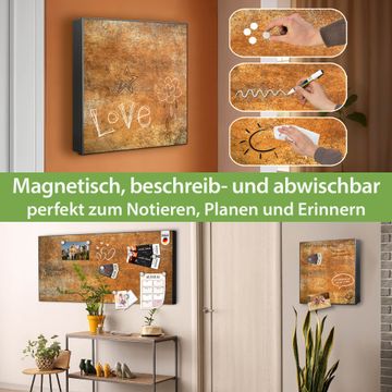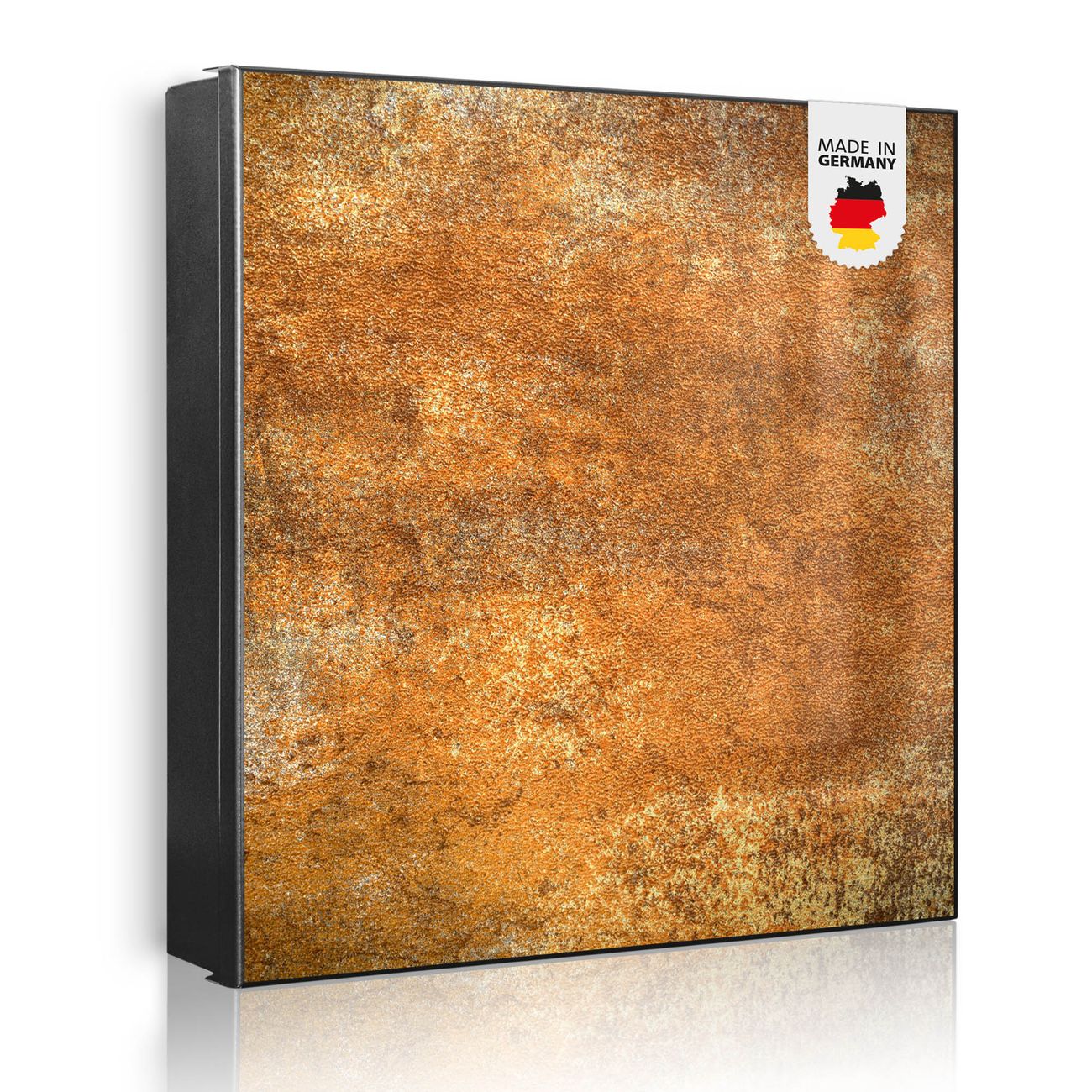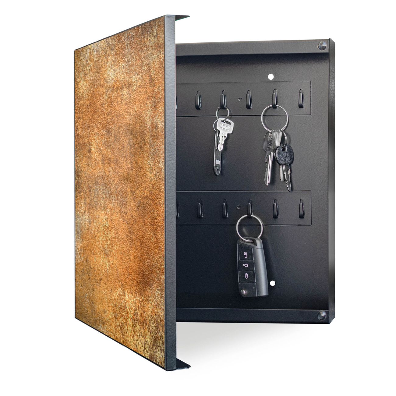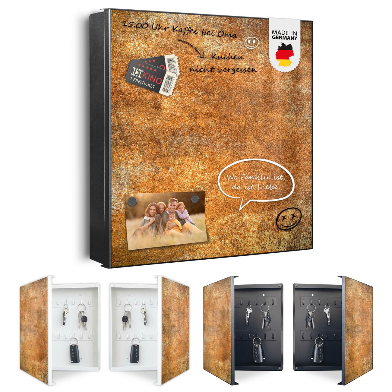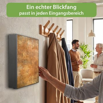 Bringe Ordnung und Eleganz in deinen Eingangsbereich mit dem banjado Schlüsselkasten Motiv Motiv Rostige Oberfläche. Die moderne Schlüsselbox kombiniert funktionales Design mit hochwertiger Verarbeitung und wird so zu einem echten Hingucker in Flur, Büro oder Ferienwohnung. ✅ Stilvolle Schlüsselaufbewahrung mit Motiv Motiv Rostige Oberfläche Der Design-Schlüsselkasten Motiv Motiv Rostige Oberfläche bietet Platz für bis zu 32 Schlüssel, die auf 4 stabilen Reihen mit je 8 Haken übersichtlich verstaut werden. Mit seinen kompakten Maßen von 30 x 30 x 5 cm passt die Schlüsselbox perfekt auch in kleinere Räume. Der schwarz lackierte Stahlkorpus mit links angeschlagenem Türscharnier harmoniert mit gedruckten Folie auf der Front und fügt sich nahtlos in jedes Wohnambiente ein. Ob als Schlüsselorganizer für Zuhause oder als praktische Lösung für Büros, Praxen und Gewerbe, der banjado Schlüsselkasten sorgt für Ordnung und Übersicht. Dank der magnetischen, mit Kreidestiften beschreibbaren Folie auf der Front kannst du Notizen anheften oder Termine direkt auf der Oberfläche festhalten. Die Schlüsselbox Motiv Motiv Rostige Oberfläche zur Wandmontage wird inklusive Befestigungsmaterial geliefert und ist schnell angebracht. So hast du deine Schlüssel jederzeit griffbereit und zugleich stilvoll verstaut. Mit diesem banjado Schlüsselkasten Motiv Motiv Rostige Oberfläche kombinierst du praktische Aufbewahrung mit stilvollem Wohndesign. Ob privat oder geschäftlich, die Schlüsselbox sorgt für mehr Ordnung, Übersicht und ein wohnliches Ambiente.Vorteile im Überblick