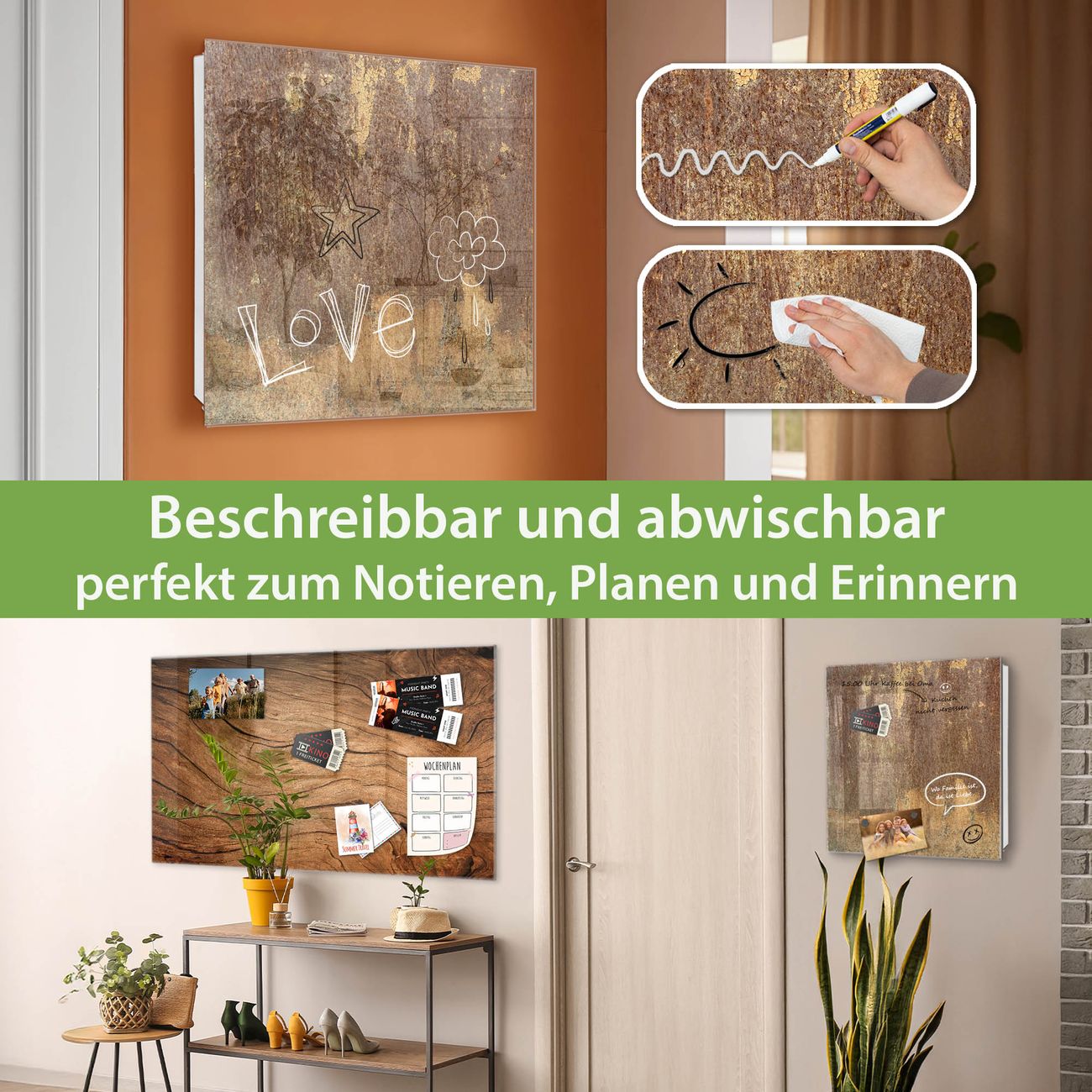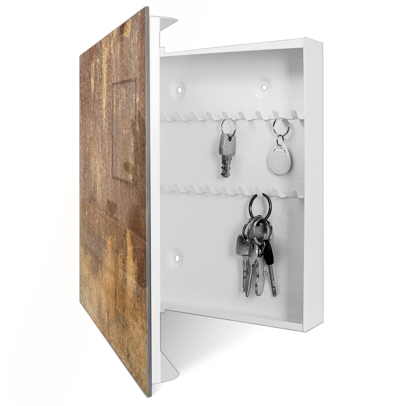 Bringe Ordnung und Eleganz in deinen Eingangsbereich mit dem banjado Schlüsselkasten Motiv Rostige Patina. Die moderne Schlüsselbox kombiniert funktionales Design mit hochwertiger Verarbeitung und wird so zu einem echten Hingucker in Flur, Büro oder Ferienwohnung. ✅ Stilvolle Schlüsselaufbewahrung mit Glasfront im Motiv Motiv Rostige Patina Der Design-Schlüsselkasten Motiv Rostige Patina bietet Platz für bis zu 50 Schlüssel, die auf 5 stabilen Reihen mit je 10 Haken übersichtlich verstaut werden. Mit seinen kompakten Maßen von 30 x 30 x 5 cm passt die Schlüsselbox perfekt auch in kleinere Räume. Der weiß lackierte Stahlkorpus mit rechts angeschlagenem Türscharnier harmoniert mit der Glasfront und fügt sich nahtlos in jedes Wohnambiente ein. Ob als Schlüsselorganizer für Zuhause oder als praktische Lösung für Büros, Praxen und Gewerbe, der banjado Schlüsselkasten sorgt für Ordnung und Übersicht. Dank der magnetischen, mit Kreidestiften beschreibbaren Glasfront kannst du Notizen anheften oder Termine direkt auf der Oberfläche festhalten. Die Schlüsselbox Motiv Rostige Patina zur Wandmontage wird inklusive Befestigungsmaterial geliefert und ist schnell angebracht. So hast du deine Schlüssel jederzeit griffbereit und zugleich stilvoll verstaut. Mit diesem banjado Schlüsselkasten Motiv Rostige Patina kombinierst du praktische Aufbewahrung mit stilvollem Wohndesign. Ob privat oder geschäftlich, die Schlüsselbox sorgt für mehr Ordnung, Übersicht und ein wohnliches Ambiente.Vorteile im Überblick