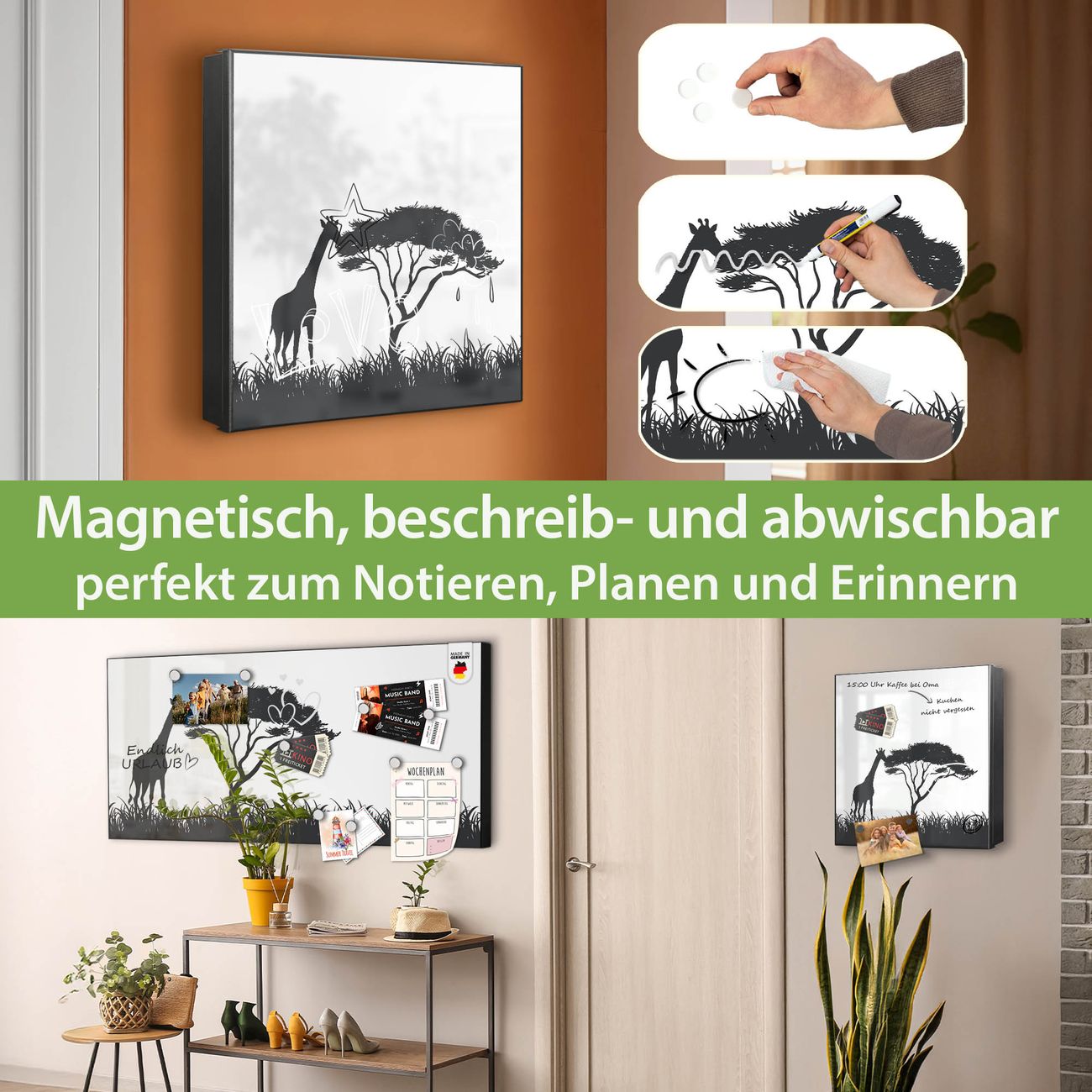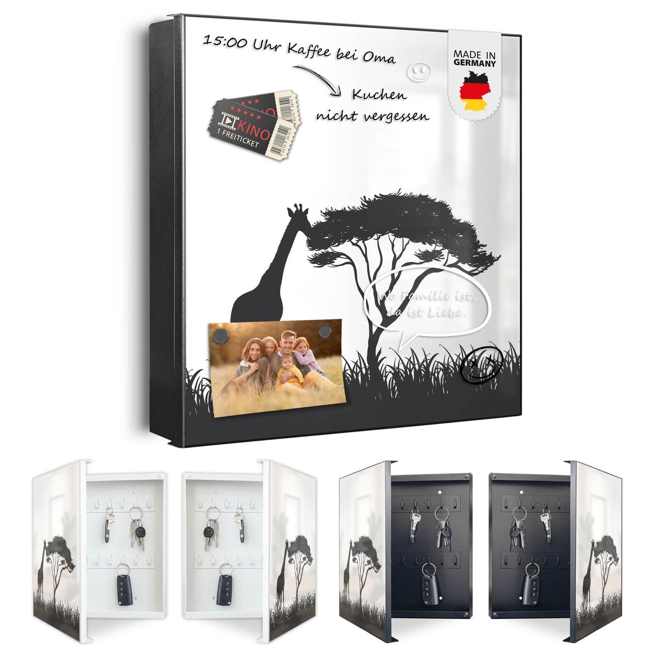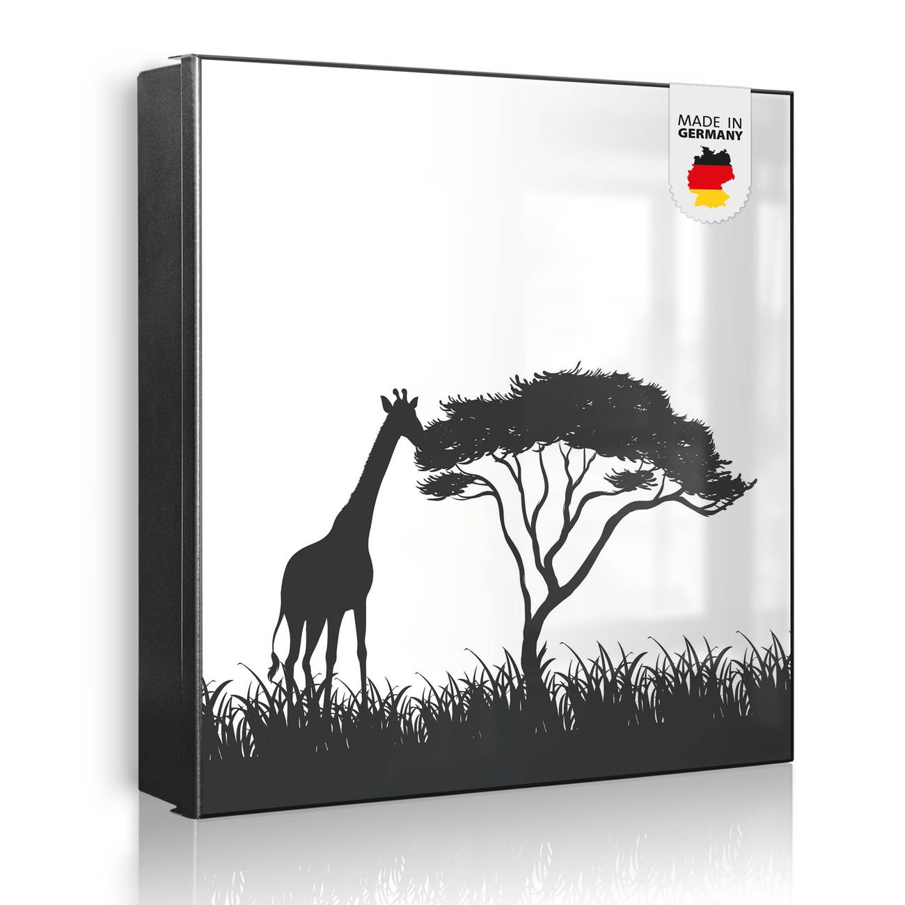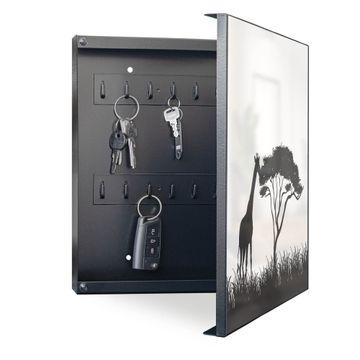 Bringe Ordnung und Eleganz in deinen Eingangsbereich mit dem banjado Schlüsselkasten Motiv Motiv Savannen-Silhouette. Die moderne Schlüsselbox kombiniert funktionales Design mit hochwertiger Verarbeitung und wird so zu einem echten Hingucker in Flur, Büro oder Ferienwohnung. ✅ Stilvolle Schlüsselaufbewahrung mit Motiv Motiv Savannen-Silhouette Der Design-Schlüsselkasten Motiv Motiv Savannen-Silhouette bietet Platz für bis zu 32 Schlüssel, die auf 4 stabilen Reihen mit je 8 Haken übersichtlich verstaut werden. Mit seinen kompakten Maßen von 30 x 30 x 5 cm passt die Schlüsselbox perfekt auch in kleinere Räume. Der schwarz lackierte Stahlkorpus mit rechts angeschlagenem Türscharnier harmoniert mit gedruckten Folie auf der Front und fügt sich nahtlos in jedes Wohnambiente ein. Ob als Schlüsselorganizer für Zuhause oder als praktische Lösung für Büros, Praxen und Gewerbe, der banjado Schlüsselkasten sorgt für Ordnung und Übersicht. Dank der magnetischen, mit Kreidestiften beschreibbaren Folie auf der Front kannst du Notizen anheften oder Termine direkt auf der Oberfläche festhalten. Die Schlüsselbox Motiv Motiv Savannen-Silhouette zur Wandmontage wird inklusive Befestigungsmaterial geliefert und ist schnell angebracht. So hast du deine Schlüssel jederzeit griffbereit und zugleich stilvoll verstaut. Mit diesem banjado Schlüsselkasten Motiv Motiv Savannen-Silhouette kombinierst du praktische Aufbewahrung mit stilvollem Wohndesign. Ob privat oder geschäftlich, die Schlüsselbox sorgt für mehr Ordnung, Übersicht und ein wohnliches Ambiente.Vorteile im Überblick