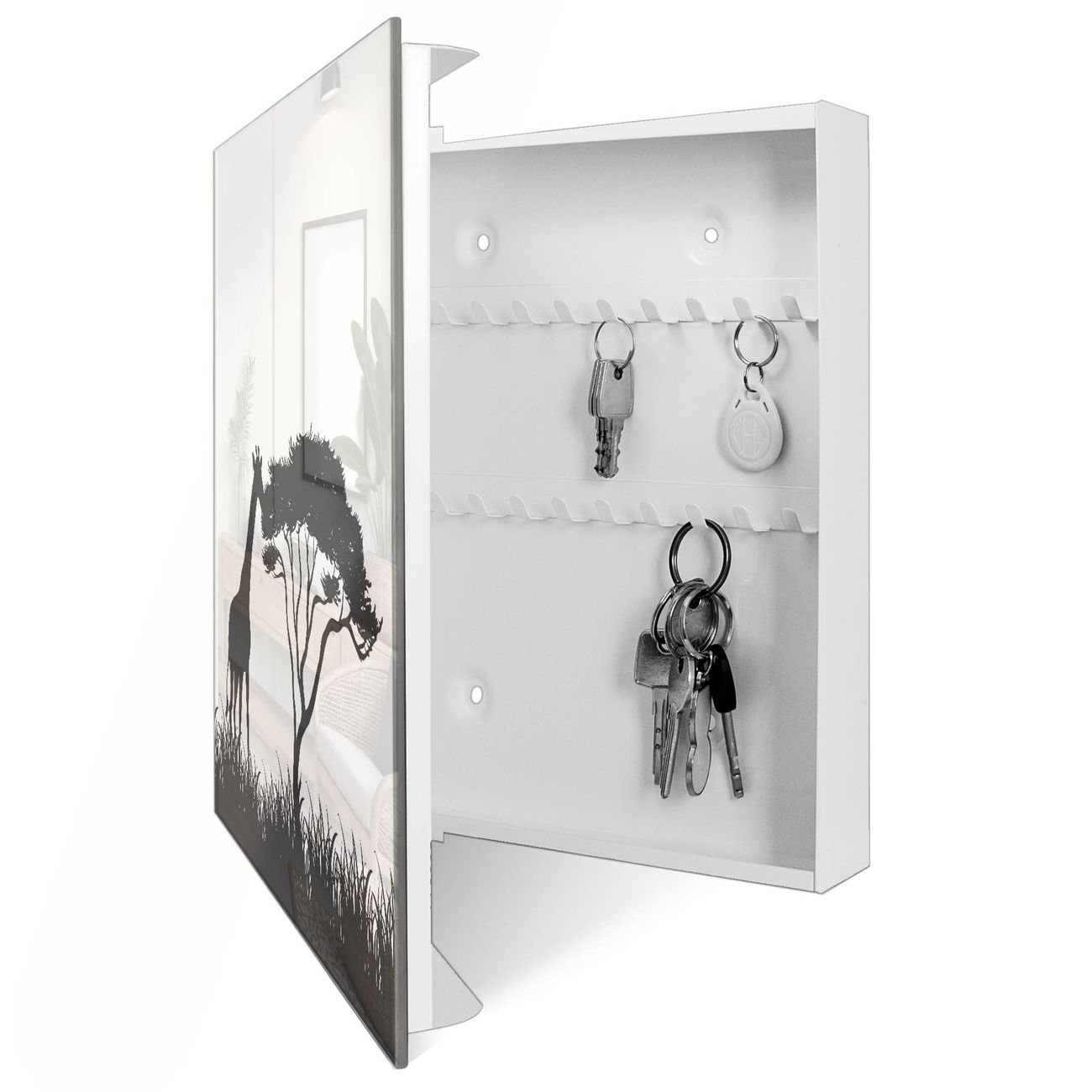 Bringe Ordnung und Eleganz in deinen Eingangsbereich mit dem banjado Schlüsselkasten Motiv Motiv Savannen-Silhouette. Die moderne Schlüsselbox kombiniert funktionales Design mit hochwertiger Verarbeitung und wird so zu einem echten Hingucker in Flur, Büro oder Ferienwohnung. ✅ Stilvolle Schlüsselaufbewahrung mit Glasfront im Motiv Motiv Savannen-Silhouette Der Design-Schlüsselkasten Motiv Motiv Savannen-Silhouette bietet Platz für bis zu 50 Schlüssel, die auf 5 stabilen Reihen mit je 10 Haken übersichtlich verstaut werden. Mit seinen kompakten Maßen von 30 x 30 x 5 cm passt die Schlüsselbox perfekt auch in kleinere Räume. Der weiß lackierte Stahlkorpus mit rechts angeschlagenem Türscharnier harmoniert mit der Glasfront und fügt sich nahtlos in jedes Wohnambiente ein. Ob als Schlüsselorganizer für Zuhause oder als praktische Lösung für Büros, Praxen und Gewerbe, der banjado Schlüsselkasten sorgt für Ordnung und Übersicht. Dank der magnetischen, mit Kreidestiften beschreibbaren Glasfront kannst du Notizen anheften oder Termine direkt auf der Oberfläche festhalten. Die Schlüsselbox Motiv Motiv Savannen-Silhouette zur Wandmontage wird inklusive Befestigungsmaterial geliefert und ist schnell angebracht. So hast du deine Schlüssel jederzeit griffbereit und zugleich stilvoll verstaut. Mit diesem banjado Schlüsselkasten Motiv Motiv Savannen-Silhouette kombinierst du praktische Aufbewahrung mit stilvollem Wohndesign. Ob privat oder geschäftlich, die Schlüsselbox sorgt für mehr Ordnung, Übersicht und ein wohnliches Ambiente.Vorteile im Überblick
