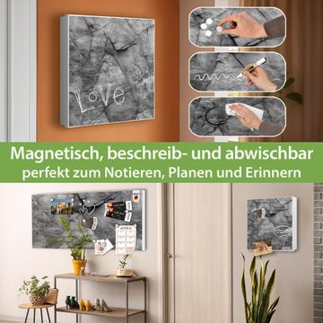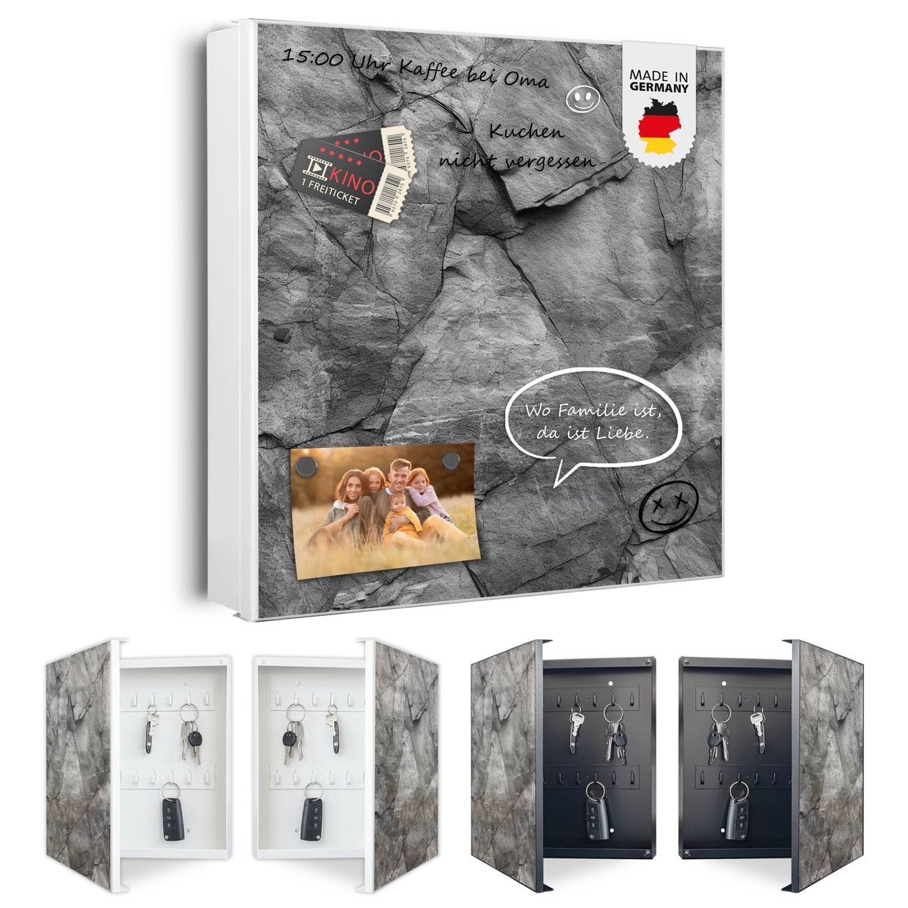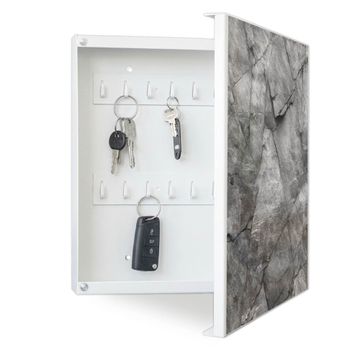 Bringe Ordnung und Eleganz in deinen Eingangsbereich mit dem banjado Schlüsselkasten Motiv Motiv Schiefer Platte 2. Die moderne Schlüsselbox kombiniert funktionales Design mit hochwertiger Verarbeitung und wird so zu einem echten Hingucker in Flur, Büro oder Ferienwohnung. ✅ Stilvolle Schlüsselaufbewahrung mit Motiv Motiv Schiefer Platte 2 Der Design-Schlüsselkasten Motiv Motiv Schiefer Platte 2 bietet Platz für bis zu 32 Schlüssel, die auf 4 stabilen Reihen mit je 8 Haken übersichtlich verstaut werden. Mit seinen kompakten Maßen von 30 x 30 x 5 cm passt die Schlüsselbox perfekt auch in kleinere Räume. Der weiß lackierte Stahlkorpus mit rechts angeschlagenem Türscharnier harmoniert mit gedruckten Folie auf der Front und fügt sich nahtlos in jedes Wohnambiente ein. Ob als Schlüsselorganizer für Zuhause oder als praktische Lösung für Büros, Praxen und Gewerbe, der banjado Schlüsselkasten sorgt für Ordnung und Übersicht. Dank der magnetischen, mit Kreidestiften beschreibbaren Folie auf der Front kannst du Notizen anheften oder Termine direkt auf der Oberfläche festhalten. Die Schlüsselbox Motiv Motiv Schiefer Platte 2 zur Wandmontage wird inklusive Befestigungsmaterial geliefert und ist schnell angebracht. So hast du deine Schlüssel jederzeit griffbereit und zugleich stilvoll verstaut. Mit diesem banjado Schlüsselkasten Motiv Motiv Schiefer Platte 2 kombinierst du praktische Aufbewahrung mit stilvollem Wohndesign. Ob privat oder geschäftlich, die Schlüsselbox sorgt für mehr Ordnung, Übersicht und ein wohnliches Ambiente.Vorteile im Überblick