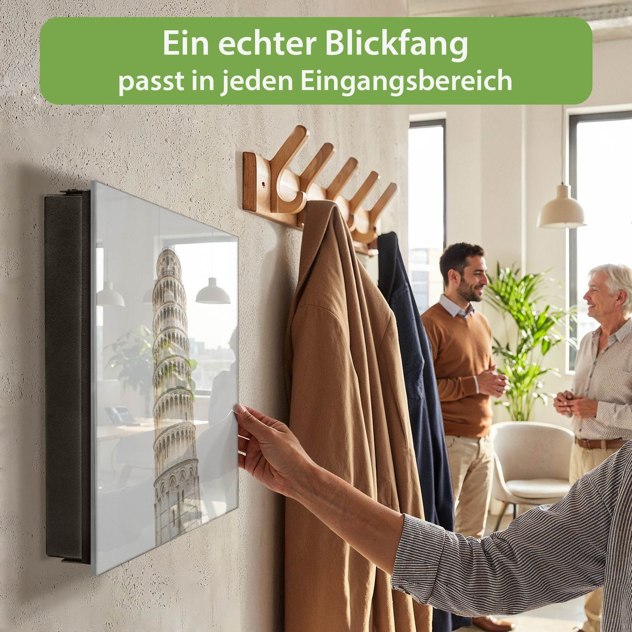 Bringe Ordnung und Eleganz in deinen Eingangsbereich mit dem banjado Schlüsselkasten Motiv Motiv Schiefer Turm von Pisa 2. Die moderne Schlüsselbox kombiniert funktionales Design mit hochwertiger Verarbeitung und wird so zu einem echten Hingucker in Flur, Büro oder Ferienwohnung. ✅ Stilvolle Schlüsselaufbewahrung mit Glasfront im Motiv Motiv Schiefer Turm von Pisa 2 Der Design-Schlüsselkasten Motiv Motiv Schiefer Turm von Pisa 2 bietet Platz für bis zu 50 Schlüssel, die auf 5 stabilen Reihen mit je 10 Haken übersichtlich verstaut werden. Mit seinen kompakten Maßen von 30 x 30 x 5 cm passt die Schlüsselbox perfekt auch in kleinere Räume. Der schwarz lackierte Stahlkorpus mit rechts angeschlagenem Türscharnier harmoniert mit der Glasfront und fügt sich nahtlos in jedes Wohnambiente ein. Ob als Schlüsselorganizer für Zuhause oder als praktische Lösung für Büros, Praxen und Gewerbe, der banjado Schlüsselkasten sorgt für Ordnung und Übersicht. Dank der magnetischen, mit Kreidestiften beschreibbaren Glasfront kannst du Notizen anheften oder Termine direkt auf der Oberfläche festhalten. Die Schlüsselbox Motiv Motiv Schiefer Turm von Pisa 2 zur Wandmontage wird inklusive Befestigungsmaterial geliefert und ist schnell angebracht. So hast du deine Schlüssel jederzeit griffbereit und zugleich stilvoll verstaut. Mit diesem banjado Schlüsselkasten Motiv Motiv Schiefer Turm von Pisa 2 kombinierst du praktische Aufbewahrung mit stilvollem Wohndesign. Ob privat oder geschäftlich, die Schlüsselbox sorgt für mehr Ordnung, Übersicht und ein wohnliches Ambiente.Vorteile im Überblick