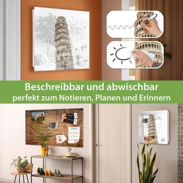 Bringe Ordnung und Eleganz in deinen Eingangsbereich mit dem banjado Schlüsselkasten Motiv Motiv Schiefer Turm von Pisa 2. Die moderne Schlüsselbox kombiniert funktionales Design mit hochwertiger Verarbeitung und wird so zu einem echten Hingucker in Flur, Büro oder Ferienwohnung. ✅ Stilvolle Schlüsselaufbewahrung mit Glasfront im Motiv Motiv Schiefer Turm von Pisa 2 Der Design-Schlüsselkasten Motiv Motiv Schiefer Turm von Pisa 2 bietet Platz für bis zu 50 Schlüssel, die auf 5 stabilen Reihen mit je 10 Haken übersichtlich verstaut werden. Mit seinen kompakten Maßen von 30 x 30 x 5 cm passt die Schlüsselbox perfekt auch in kleinere Räume. Der weiß lackierte Stahlkorpus mit rechts angeschlagenem Türscharnier harmoniert mit der Glasfront und fügt sich nahtlos in jedes Wohnambiente ein. Ob als Schlüsselorganizer für Zuhause oder als praktische Lösung für Büros, Praxen und Gewerbe, der banjado Schlüsselkasten sorgt für Ordnung und Übersicht. Dank der magnetischen, mit Kreidestiften beschreibbaren Glasfront kannst du Notizen anheften oder Termine direkt auf der Oberfläche festhalten. Die Schlüsselbox Motiv Motiv Schiefer Turm von Pisa 2 zur Wandmontage wird inklusive Befestigungsmaterial geliefert und ist schnell angebracht. So hast du deine Schlüssel jederzeit griffbereit und zugleich stilvoll verstaut. Mit diesem banjado Schlüsselkasten Motiv Motiv Schiefer Turm von Pisa 2 kombinierst du praktische Aufbewahrung mit stilvollem Wohndesign. Ob privat oder geschäftlich, die Schlüsselbox sorgt für mehr Ordnung, Übersicht und ein wohnliches Ambiente.Vorteile im Überblick