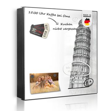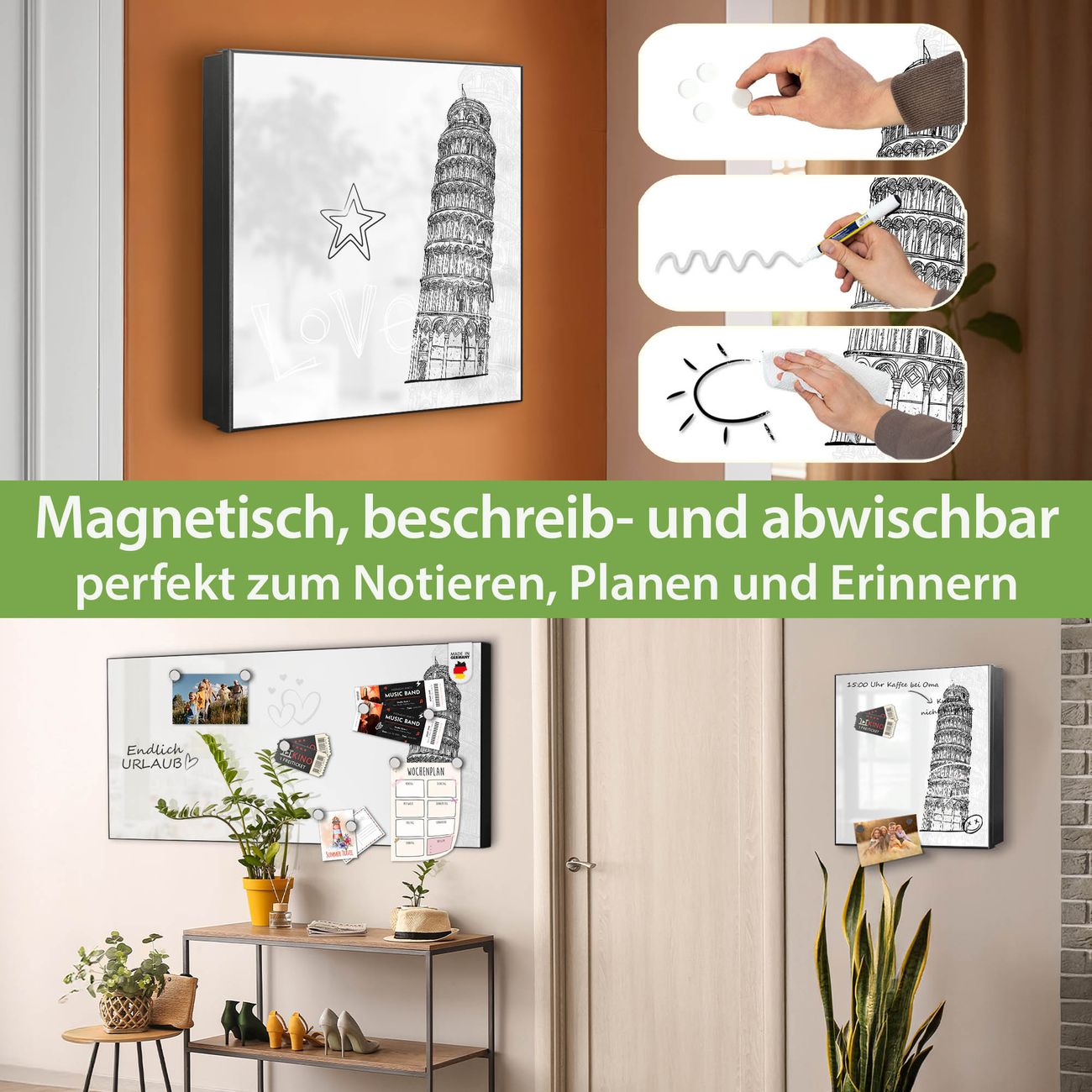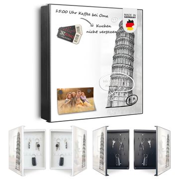 Bringe Ordnung und Eleganz in deinen Eingangsbereich mit dem banjado Schlüsselkasten Motiv Motiv Schiefer Turm von Pisa Skizze. Die moderne Schlüsselbox kombiniert funktionales Design mit hochwertiger Verarbeitung und wird so zu einem echten Hingucker in Flur, Büro oder Ferienwohnung. ✅ Stilvolle Schlüsselaufbewahrung mit Motiv Motiv Schiefer Turm von Pisa Skizze Der Design-Schlüsselkasten Motiv Motiv Schiefer Turm von Pisa Skizze bietet Platz für bis zu 32 Schlüssel, die auf 4 stabilen Reihen mit je 8 Haken übersichtlich verstaut werden. Mit seinen kompakten Maßen von 30 x 30 x 5 cm passt die Schlüsselbox perfekt auch in kleinere Räume. Der schwarz lackierte Stahlkorpus mit links angeschlagenem Türscharnier harmoniert mit gedruckten Folie auf der Front und fügt sich nahtlos in jedes Wohnambiente ein. Ob als Schlüsselorganizer für Zuhause oder als praktische Lösung für Büros, Praxen und Gewerbe, der banjado Schlüsselkasten sorgt für Ordnung und Übersicht. Dank der magnetischen, mit Kreidestiften beschreibbaren Folie auf der Front kannst du Notizen anheften oder Termine direkt auf der Oberfläche festhalten. Die Schlüsselbox Motiv Motiv Schiefer Turm von Pisa Skizze zur Wandmontage wird inklusive Befestigungsmaterial geliefert und ist schnell angebracht. So hast du deine Schlüssel jederzeit griffbereit und zugleich stilvoll verstaut. Mit diesem banjado Schlüsselkasten Motiv Motiv Schiefer Turm von Pisa Skizze kombinierst du praktische Aufbewahrung mit stilvollem Wohndesign. Ob privat oder geschäftlich, die Schlüsselbox sorgt für mehr Ordnung, Übersicht und ein wohnliches Ambiente.Vorteile im Überblick